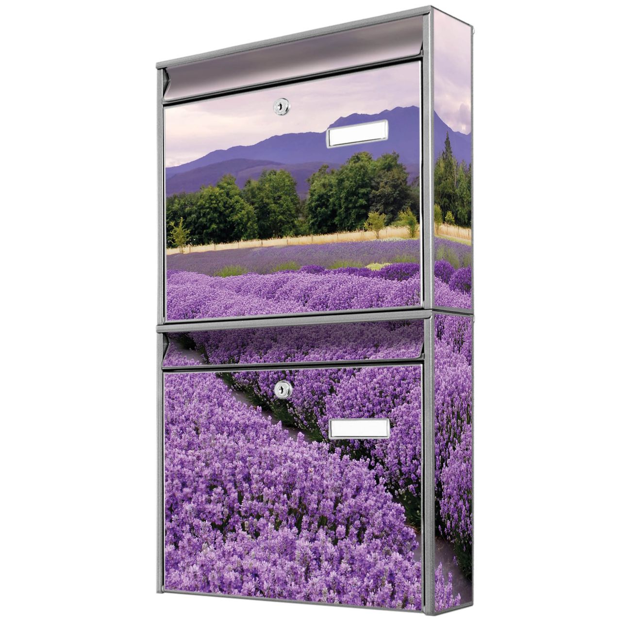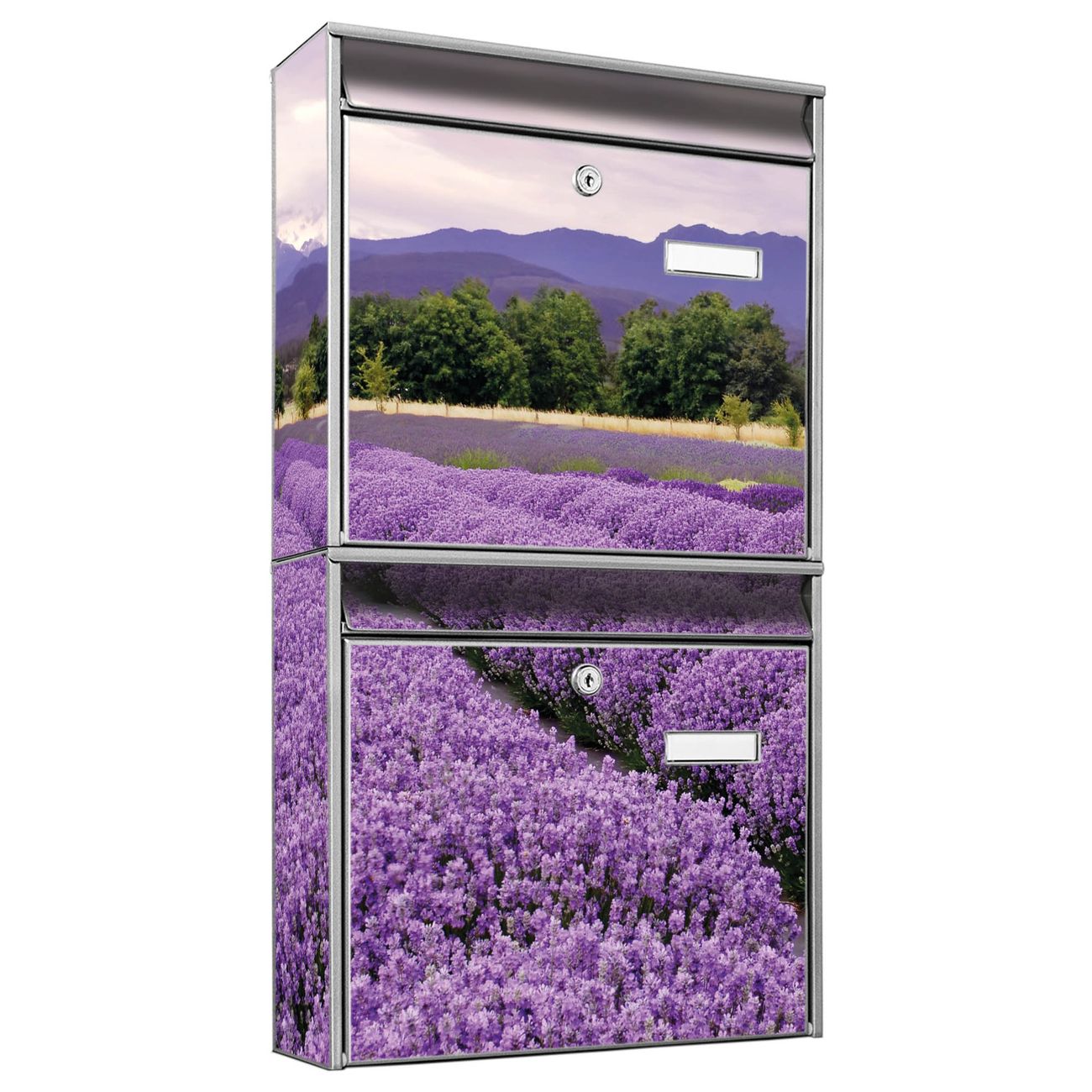 FUNKTION: Die Burg-Wächter Briefkastenanlage mit Motiv Lavendel 1 bietet Ihnen ausreichend Fassungsvermögen um auch A4 und C4 Sendungen zu empfangen. Das integrierte Namensschild lässt sich individuell beschriften. Wählen Sie aus den Grundfarben weiß, silber und schwarz. DESIGN: Die 2 Briefkästen haben ein ansprechendes und zeitloses Design, ohne dabei auf Funktionalität zu verzichten. Das Material ist sehr stabil, wetterfest und rostfrei. Durch das Motiv Lavendel 1 werden die Postkästen zu einem Blickfang. DETAILS: Die Postkästen bestehen aus verzinktem Stahl der zusätzlich mit Klarlack versiegelt wurde. Die Kästen sind gesamt 64,5cm hoch, 36,2cm breit und 10cm tief. Das Motiv besteht aus einer wetter- und UV-festen Folie, die Ihren Briefkasten zusätzlich vor Kratzern schützt. Die Postkästen werden mit Montagematerial, je einem Namensschild und je zwei Schlüsseln geliefert. NUTZEN: Das Briefkastenset eignet sich für die Wandmontage, die Größe bietet genügend Platz für Sendungen aller Art. Das zeitlose Design sowie die stabile Bauart bieten Ihnen einen treuen Begleiter für Ihre Post. BANJADO: