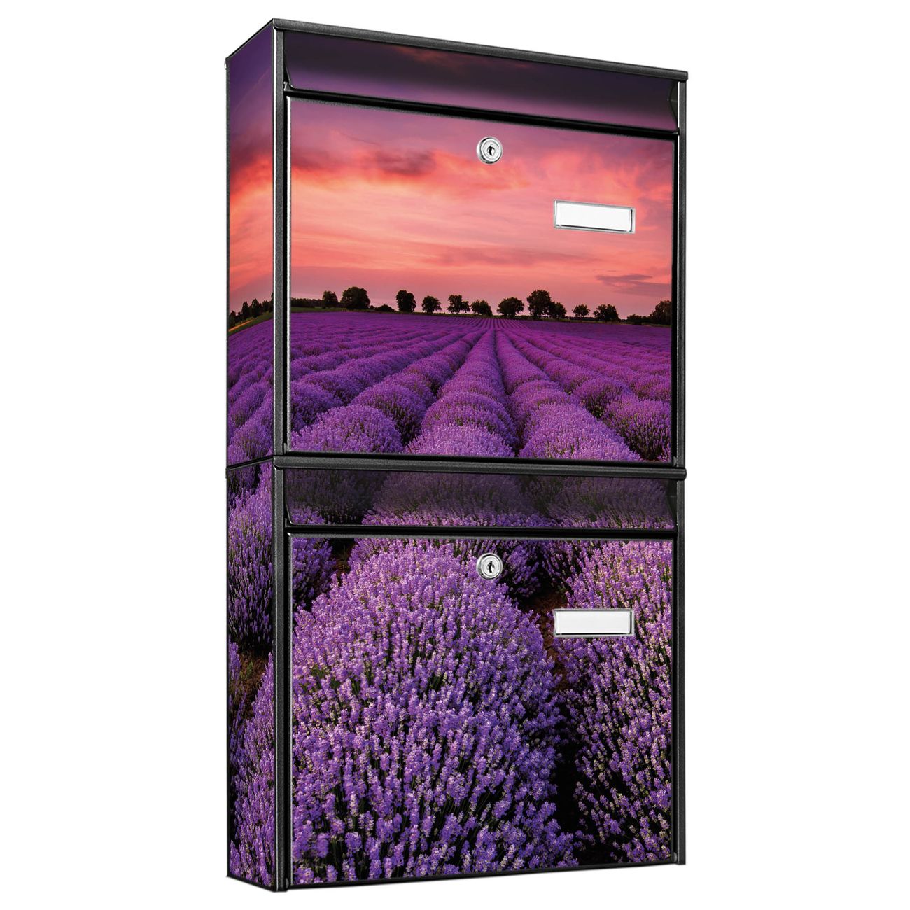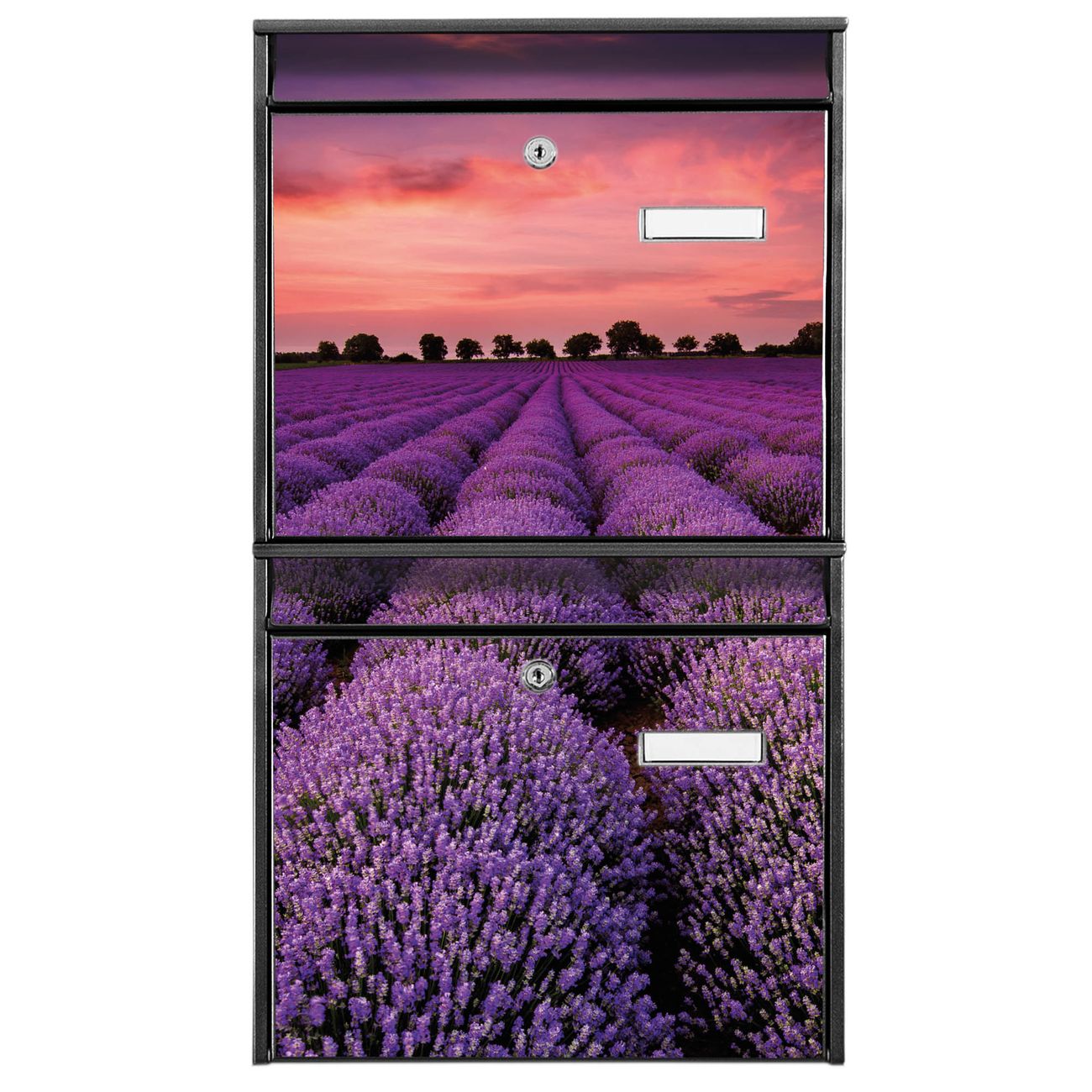 FUNKTION: Die Burg-Wächter Briefkastenanlage mit Motiv Lavendelfeld bietet Ihnen ausreichend Fassungsvermögen um auch A4 und C4 Sendungen zu empfangen. Das integrierte Namensschild lässt sich individuell beschriften. Wählen Sie aus den Grundfarben weiß, silber und schwarz. DESIGN: Die 2 Briefkästen haben ein ansprechendes und zeitloses Design, ohne dabei auf Funktionalität zu verzichten. Das Material ist sehr stabil, wetterfest und rostfrei. Durch das Motiv Lavendelfeld werden die Postkästen zu einem Blickfang. DETAILS: Die Postkästen bestehen aus verzinktem Stahl der zusätzlich mit Klarlack versiegelt wurde. Die Kästen sind gesamt 64,5cm hoch, 36,2cm breit und 10cm tief. Das Motiv besteht aus einer wetter- und UV-festen Folie, die Ihren Briefkasten zusätzlich vor Kratzern schützt. Die Postkästen werden mit Montagematerial, je einem Namensschild und je zwei Schlüsseln geliefert. NUTZEN: Das Briefkastenset eignet sich für die Wandmontage, die Größe bietet genügend Platz für Sendungen aller Art. Das zeitlose Design sowie die stabile Bauart bieten Ihnen einen treuen Begleiter für Ihre Post. BANJADO: