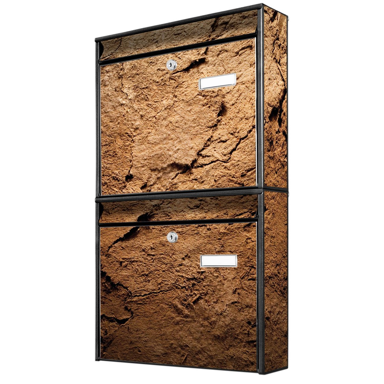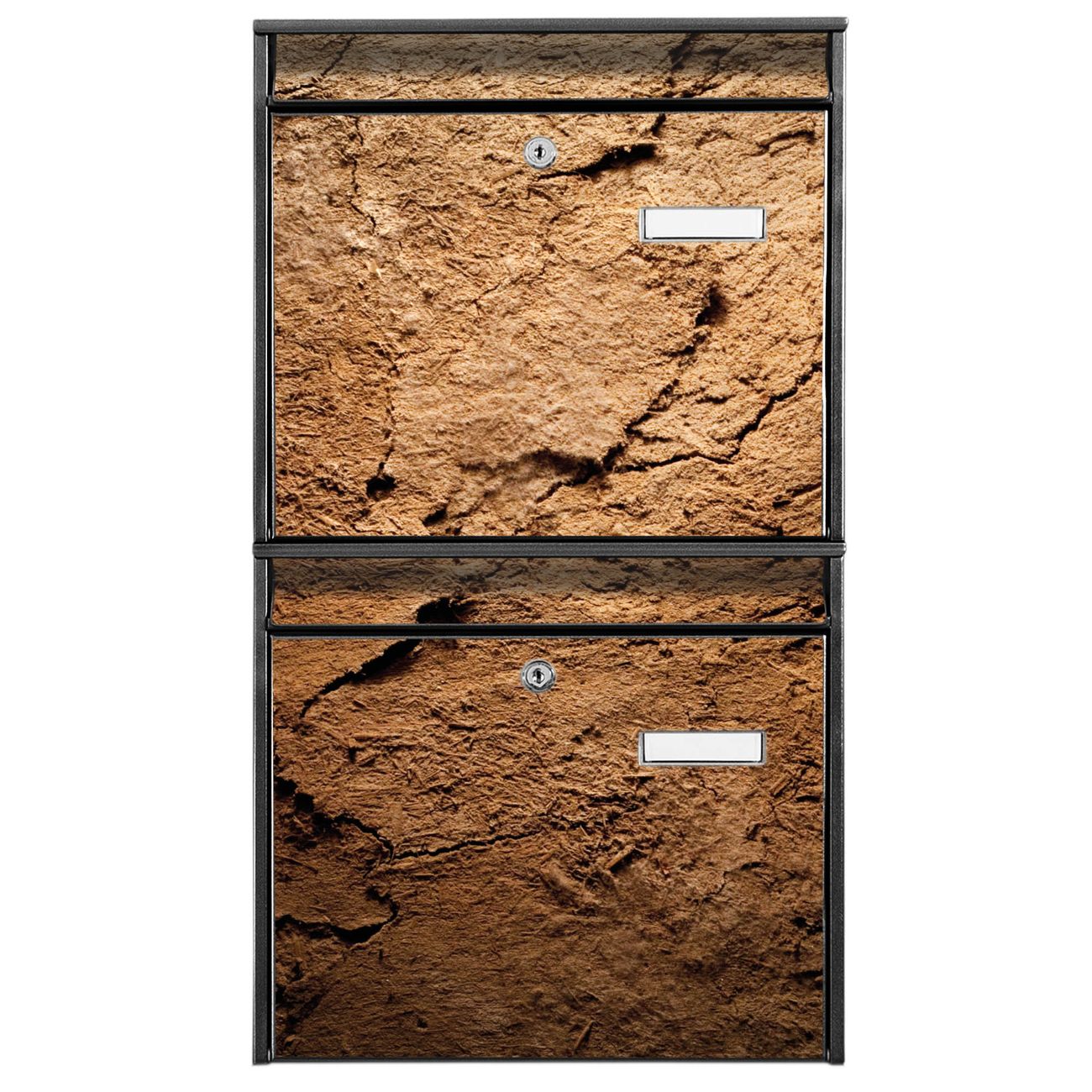 FUNKTION: Die Burg-Wächter Briefkastenanlage mit Motiv Lehmboden bietet Ihnen ausreichend Fassungsvermögen um auch A4 und C4 Sendungen zu empfangen. Das integrierte Namensschild lässt sich individuell beschriften. Wählen Sie aus den Grundfarben weiß, silber und schwarz. DESIGN: Die 2 Briefkästen haben ein ansprechendes und zeitloses Design, ohne dabei auf Funktionalität zu verzichten. Das Material ist sehr stabil, wetterfest und rostfrei. Durch das Motiv Lehmboden werden die Postkästen zu einem Blickfang. DETAILS: Die Postkästen bestehen aus verzinktem Stahl der zusätzlich mit Klarlack versiegelt wurde. Die Kästen sind gesamt 64,5cm hoch, 36,2cm breit und 10cm tief. Das Motiv besteht aus einer wetter- und UV-festen Folie, die Ihren Briefkasten zusätzlich vor Kratzern schützt. Die Postkästen werden mit Montagematerial, je einem Namensschild und je zwei Schlüsseln geliefert. NUTZEN: Das Briefkastenset eignet sich für die Wandmontage, die Größe bietet genügend Platz für Sendungen aller Art. Das zeitlose Design sowie die stabile Bauart bieten Ihnen einen treuen Begleiter für Ihre Post. BANJADO: