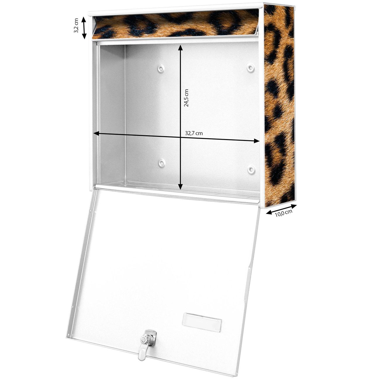FUNKTION: Die Burg-Wächter Briefkastenanlage mit Motiv Leopardenfell bietet Ihnen ausreichend Fassungsvermögen um auch A4 und C4 Sendungen zu empfangen. Das integrierte Namensschild lässt sich individuell beschriften. Wählen Sie aus den Grundfarben weiß, silber und schwarz. DESIGN: Die 2 Briefkästen haben ein ansprechendes und zeitloses Design, ohne dabei auf Funktionalität zu verzichten. Das Material ist sehr stabil, wetterfest und rostfrei. Durch das Motiv Leopardenfell werden die Postkästen zu einem Blickfang. DETAILS: Die Postkästen bestehen aus verzinktem Stahl der zusätzlich mit Klarlack versiegelt wurde. Die Kästen sind gesamt 64,5cm hoch, 36,2cm breit und 10cm tief. Das Motiv besteht aus einer wetter- und UV-festen Folie, die Ihren Briefkasten zusätzlich vor Kratzern schützt. Die Postkästen werden mit Montagematerial, je einem Namensschild und je zwei Schlüsseln geliefert. NUTZEN: Das Briefkastenset eignet sich für die Wandmontage, die Größe bietet genügend Platz für Sendungen aller Art. Das zeitlose Design sowie die stabile Bauart bieten Ihnen einen treuen Begleiter für Ihre Post. BANJADO: