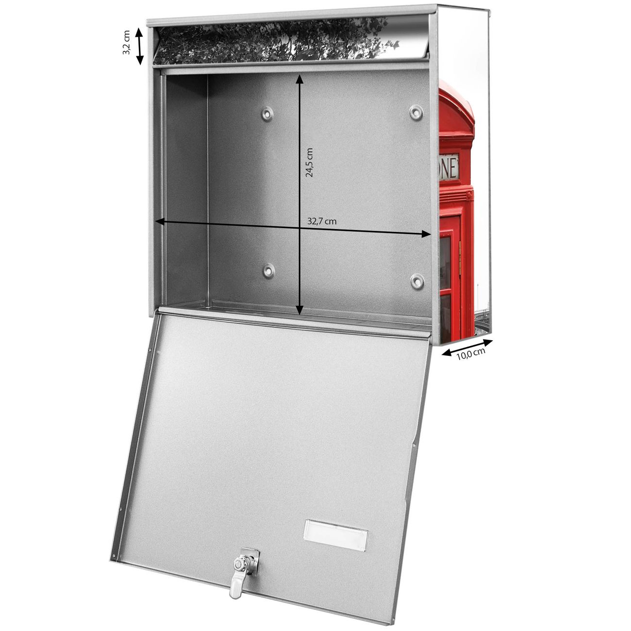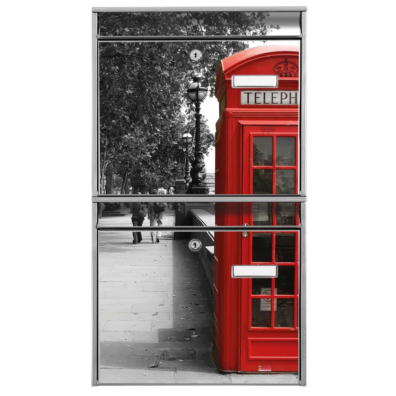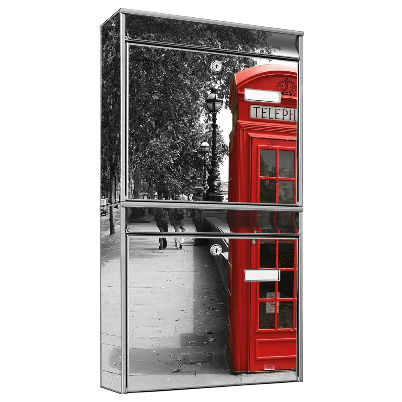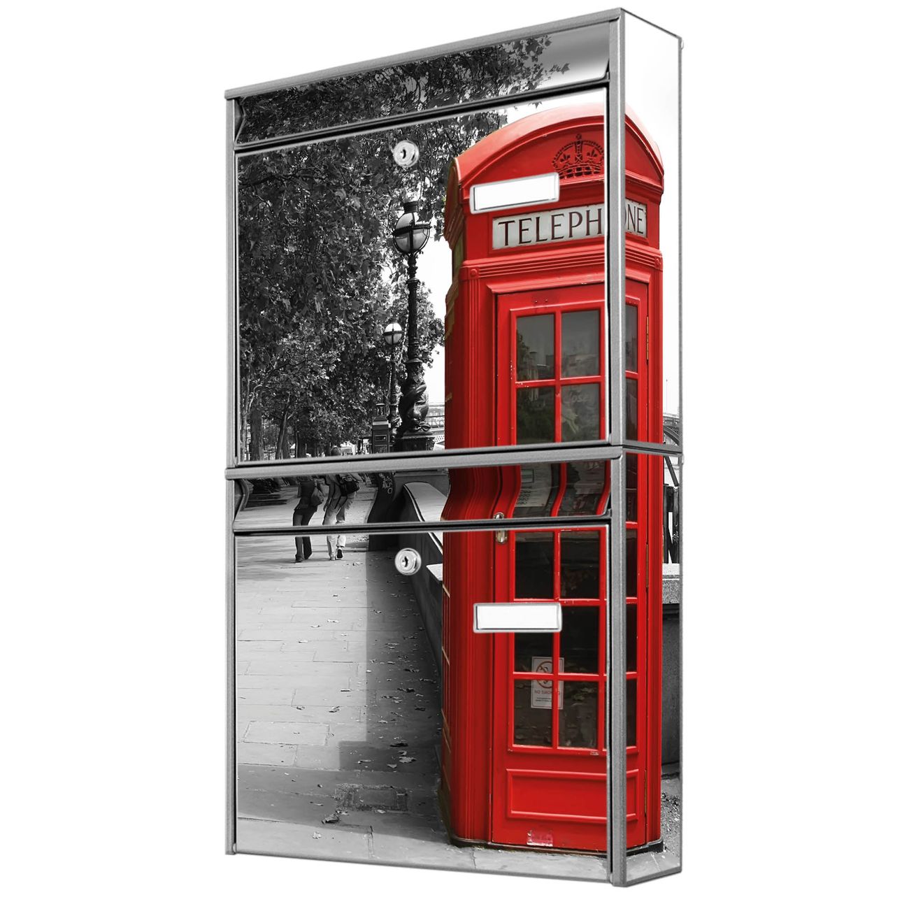 FUNKTION: Die Burg-Wächter Briefkastenanlage mit Motiv London Red Telephone bietet Ihnen ausreichend Fassungsvermögen um auch A4 und C4 Sendungen zu empfangen. Das integrierte Namensschild lässt sich individuell beschriften. Wählen Sie aus den Grundfarben weiß, silber und schwarz. DESIGN: Die 2 Briefkästen haben ein ansprechendes und zeitloses Design, ohne dabei auf Funktionalität zu verzichten. Das Material ist sehr stabil, wetterfest und rostfrei. Durch das Motiv London Red Telephone werden die Postkästen zu einem Blickfang. DETAILS: Die Postkästen bestehen aus verzinktem Stahl der zusätzlich mit Klarlack versiegelt wurde. Die Kästen sind gesamt 64,5cm hoch, 36,2cm breit und 10cm tief. Das Motiv besteht aus einer wetter- und UV-festen Folie, die Ihren Briefkasten zusätzlich vor Kratzern schützt. Die Postkästen werden mit Montagematerial, je einem Namensschild und je zwei Schlüsseln geliefert. NUTZEN: Das Briefkastenset eignet sich für die Wandmontage, die Größe bietet genügend Platz für Sendungen aller Art. Das zeitlose Design sowie die stabile Bauart bieten Ihnen einen treuen Begleiter für Ihre Post. BANJADO: