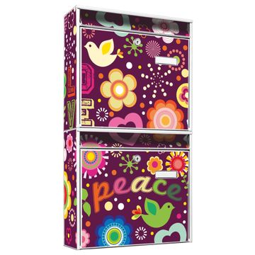 FUNKTION: Die Burg-Wächter Briefkastenanlage mit Motiv Love and Peace bietet Ihnen ausreichend Fassungsvermögen um auch A4 und C4 Sendungen zu empfangen. Das integrierte Namensschild lässt sich individuell beschriften. Wählen Sie aus den Grundfarben weiß, silber und schwarz. DESIGN: Die 2 Briefkästen haben ein ansprechendes und zeitloses Design, ohne dabei auf Funktionalität zu verzichten. Das Material ist sehr stabil, wetterfest und rostfrei. Durch das Motiv Love and Peace werden die Postkästen zu einem Blickfang. DETAILS: Die Postkästen bestehen aus verzinktem Stahl der zusätzlich mit Klarlack versiegelt wurde. Die Kästen sind gesamt 64,5cm hoch, 36,2cm breit und 10cm tief. Das Motiv besteht aus einer wetter- und UV-festen Folie, die Ihren Briefkasten zusätzlich vor Kratzern schützt. Die Postkästen werden mit Montagematerial, je einem Namensschild und je zwei Schlüsseln geliefert. NUTZEN: Das Briefkastenset eignet sich für die Wandmontage, die Größe bietet genügend Platz für Sendungen aller Art. Das zeitlose Design sowie die stabile Bauart bieten Ihnen einen treuen Begleiter für Ihre Post. BANJADO: