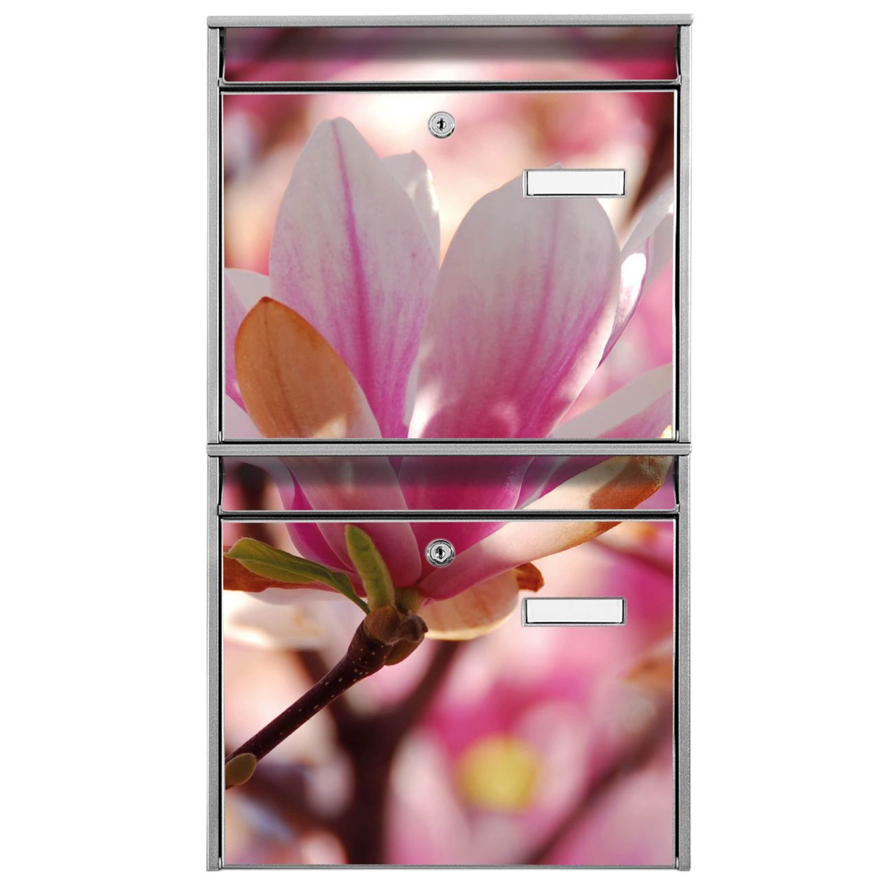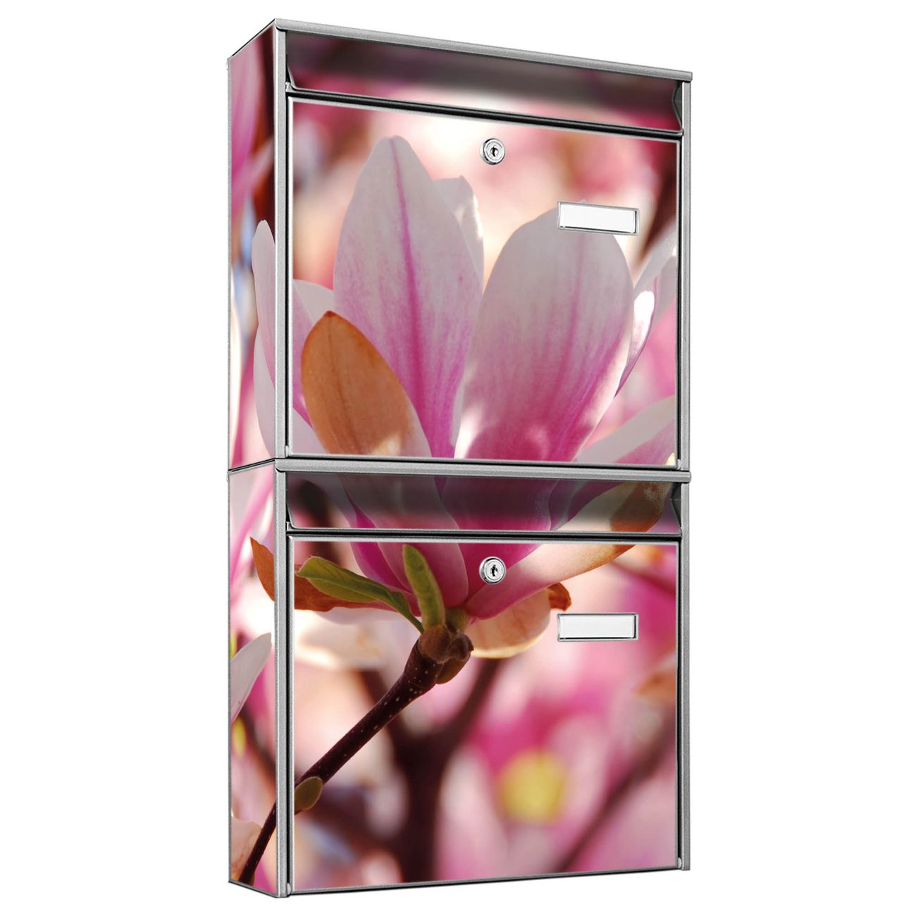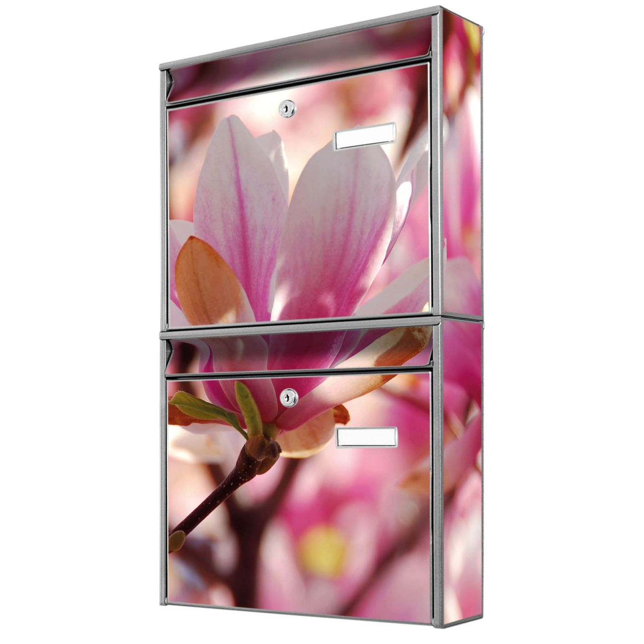 FUNKTION: Die Burg-Wächter Briefkastenanlage mit Motiv Magnolia bietet Ihnen ausreichend Fassungsvermögen um auch A4 und C4 Sendungen zu empfangen. Das integrierte Namensschild lässt sich individuell beschriften. Wählen Sie aus den Grundfarben weiß, silber und schwarz. DESIGN: Die 2 Briefkästen haben ein ansprechendes und zeitloses Design, ohne dabei auf Funktionalität zu verzichten. Das Material ist sehr stabil, wetterfest und rostfrei. Durch das Motiv Magnolia werden die Postkästen zu einem Blickfang. DETAILS: Die Postkästen bestehen aus verzinktem Stahl der zusätzlich mit Klarlack versiegelt wurde. Die Kästen sind gesamt 64,5cm hoch, 36,2cm breit und 10cm tief. Das Motiv besteht aus einer wetter- und UV-festen Folie, die Ihren Briefkasten zusätzlich vor Kratzern schützt. Die Postkästen werden mit Montagematerial, je einem Namensschild und je zwei Schlüsseln geliefert. NUTZEN: Das Briefkastenset eignet sich für die Wandmontage, die Größe bietet genügend Platz für Sendungen aller Art. Das zeitlose Design sowie die stabile Bauart bieten Ihnen einen treuen Begleiter für Ihre Post. BANJADO: