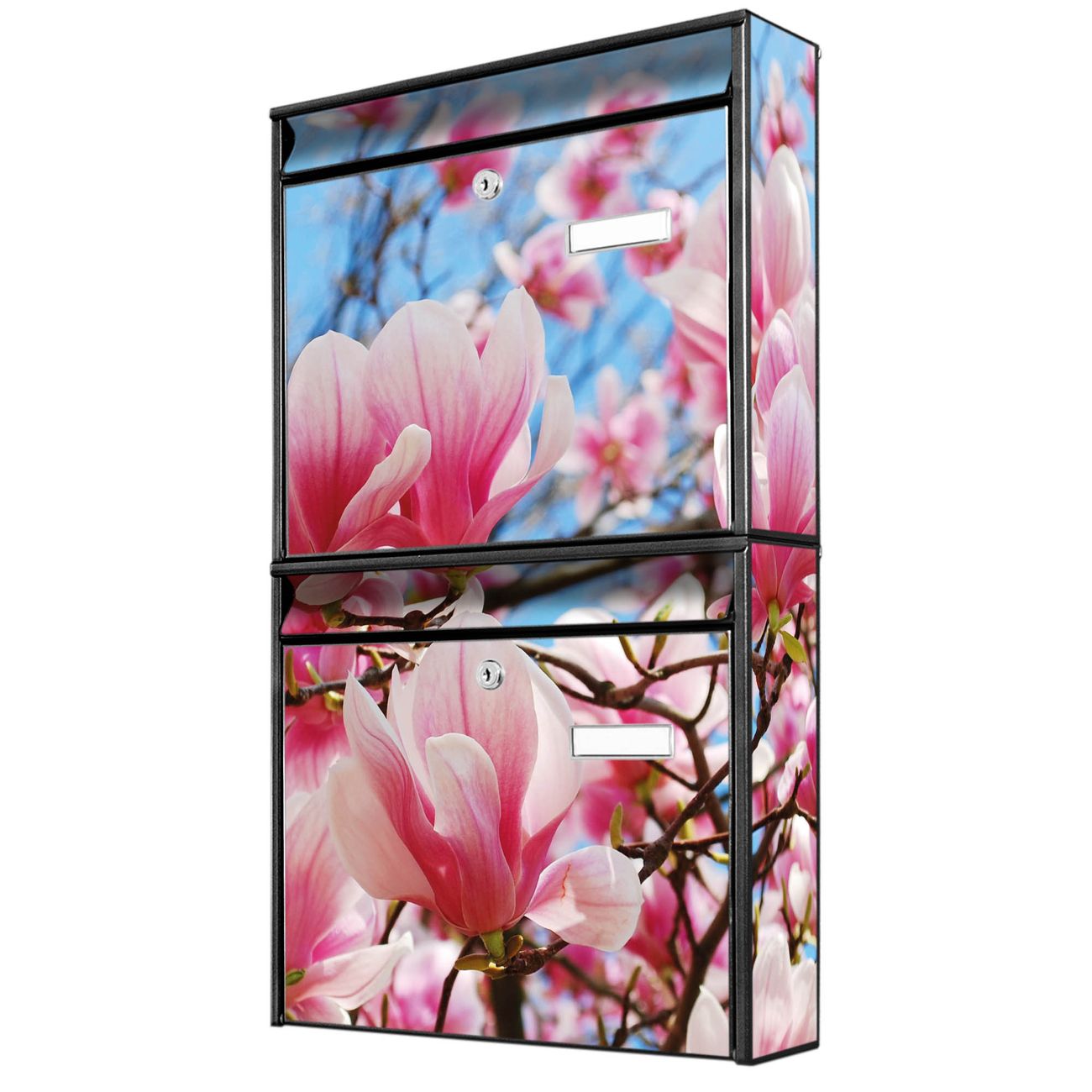 FUNKTION: Die Burg-Wächter Briefkastenanlage mit Motiv Magnolienbaum bietet Ihnen ausreichend Fassungsvermögen um auch A4 und C4 Sendungen zu empfangen. Das integrierte Namensschild lässt sich individuell beschriften. Wählen Sie aus den Grundfarben weiß, silber und schwarz. DESIGN: Die 2 Briefkästen haben ein ansprechendes und zeitloses Design, ohne dabei auf Funktionalität zu verzichten. Das Material ist sehr stabil, wetterfest und rostfrei. Durch das Motiv Magnolienbaum werden die Postkästen zu einem Blickfang. DETAILS: Die Postkästen bestehen aus verzinktem Stahl der zusätzlich mit Klarlack versiegelt wurde. Die Kästen sind gesamt 64,5cm hoch, 36,2cm breit und 10cm tief. Das Motiv besteht aus einer wetter- und UV-festen Folie, die Ihren Briefkasten zusätzlich vor Kratzern schützt. Die Postkästen werden mit Montagematerial, je einem Namensschild und je zwei Schlüsseln geliefert. NUTZEN: Das Briefkastenset eignet sich für die Wandmontage, die Größe bietet genügend Platz für Sendungen aller Art. Das zeitlose Design sowie die stabile Bauart bieten Ihnen einen treuen Begleiter für Ihre Post. BANJADO: