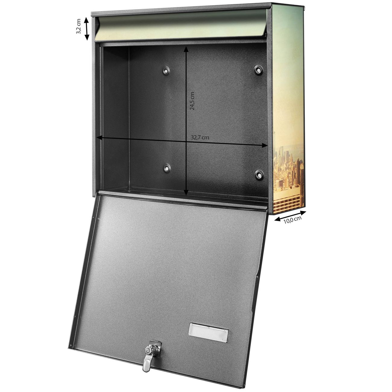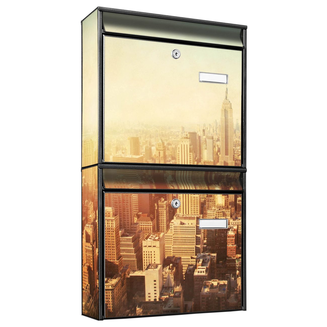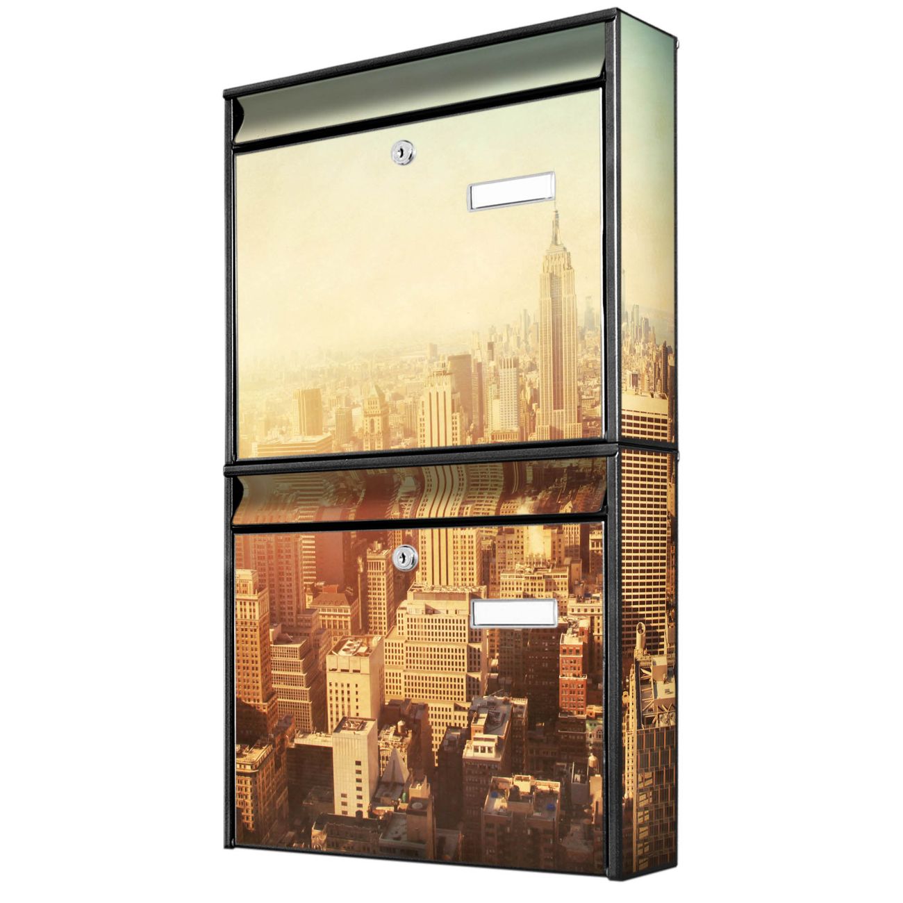 FUNKTION: Die Burg-Wächter Briefkastenanlage mit Motiv Manhattan 2 bietet Ihnen ausreichend Fassungsvermögen um auch A4 und C4 Sendungen zu empfangen. Das integrierte Namensschild lässt sich individuell beschriften. Wählen Sie aus den Grundfarben weiß, silber und schwarz. DESIGN: Die 2 Briefkästen haben ein ansprechendes und zeitloses Design, ohne dabei auf Funktionalität zu verzichten. Das Material ist sehr stabil, wetterfest und rostfrei. Durch das Motiv Manhattan 2 werden die Postkästen zu einem Blickfang. DETAILS: Die Postkästen bestehen aus verzinktem Stahl der zusätzlich mit Klarlack versiegelt wurde. Die Kästen sind gesamt 64,5cm hoch, 36,2cm breit und 10cm tief. Das Motiv besteht aus einer wetter- und UV-festen Folie, die Ihren Briefkasten zusätzlich vor Kratzern schützt. Die Postkästen werden mit Montagematerial, je einem Namensschild und je zwei Schlüsseln geliefert. NUTZEN: Das Briefkastenset eignet sich für die Wandmontage, die Größe bietet genügend Platz für Sendungen aller Art. Das zeitlose Design sowie die stabile Bauart bieten Ihnen einen treuen Begleiter für Ihre Post. BANJADO: