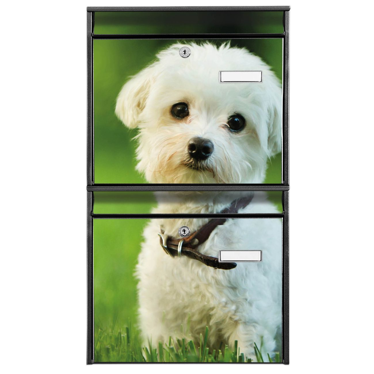 FUNKTION: Die Burg-Wächter Briefkastenanlage mit Motiv Mareike bietet Ihnen ausreichend Fassungsvermögen um auch A4 und C4 Sendungen zu empfangen. Das integrierte Namensschild lässt sich individuell beschriften. Wählen Sie aus den Grundfarben weiß, silber und schwarz. DESIGN: Die 2 Briefkästen haben ein ansprechendes und zeitloses Design, ohne dabei auf Funktionalität zu verzichten. Das Material ist sehr stabil, wetterfest und rostfrei. Durch das Motiv Mareike werden die Postkästen zu einem Blickfang. DETAILS: Die Postkästen bestehen aus verzinktem Stahl der zusätzlich mit Klarlack versiegelt wurde. Die Kästen sind gesamt 64,5cm hoch, 36,2cm breit und 10cm tief. Das Motiv besteht aus einer wetter- und UV-festen Folie, die Ihren Briefkasten zusätzlich vor Kratzern schützt. Die Postkästen werden mit Montagematerial, je einem Namensschild und je zwei Schlüsseln geliefert. NUTZEN: Das Briefkastenset eignet sich für die Wandmontage, die Größe bietet genügend Platz für Sendungen aller Art. Das zeitlose Design sowie die stabile Bauart bieten Ihnen einen treuen Begleiter für Ihre Post. BANJADO: