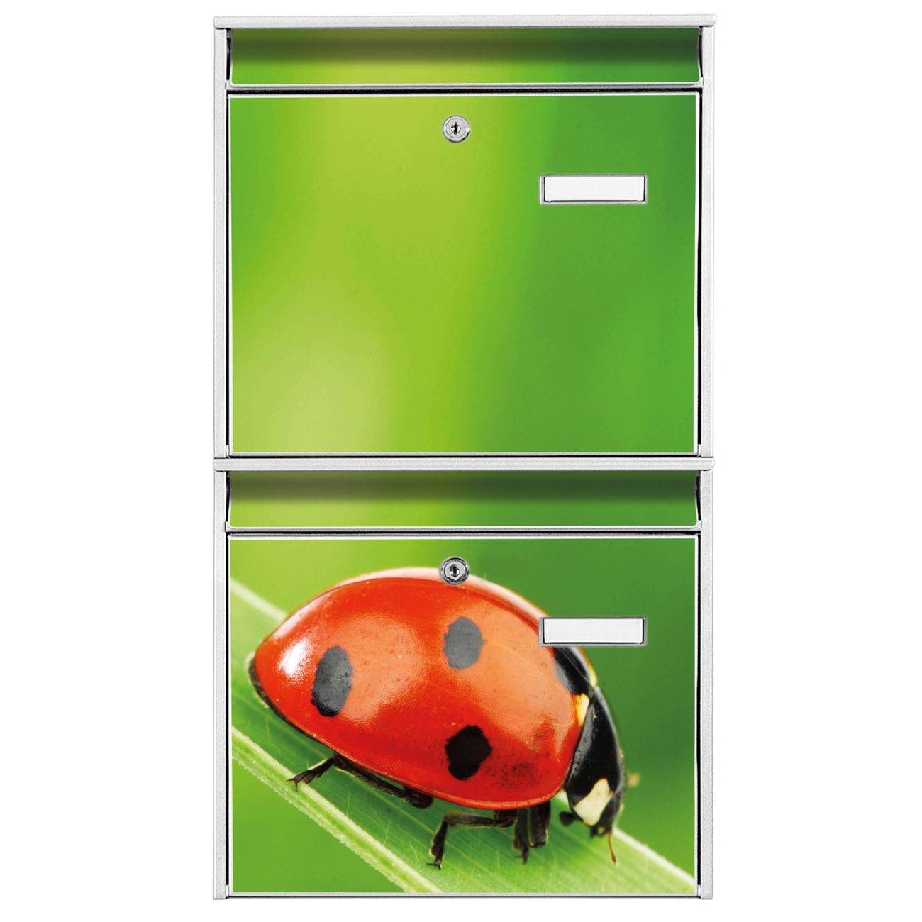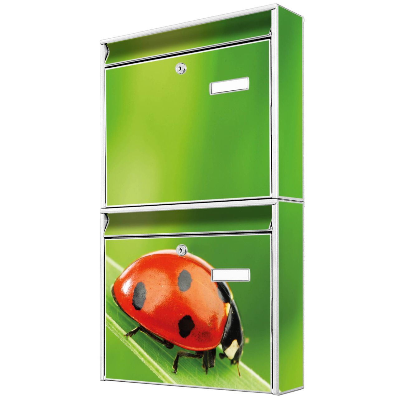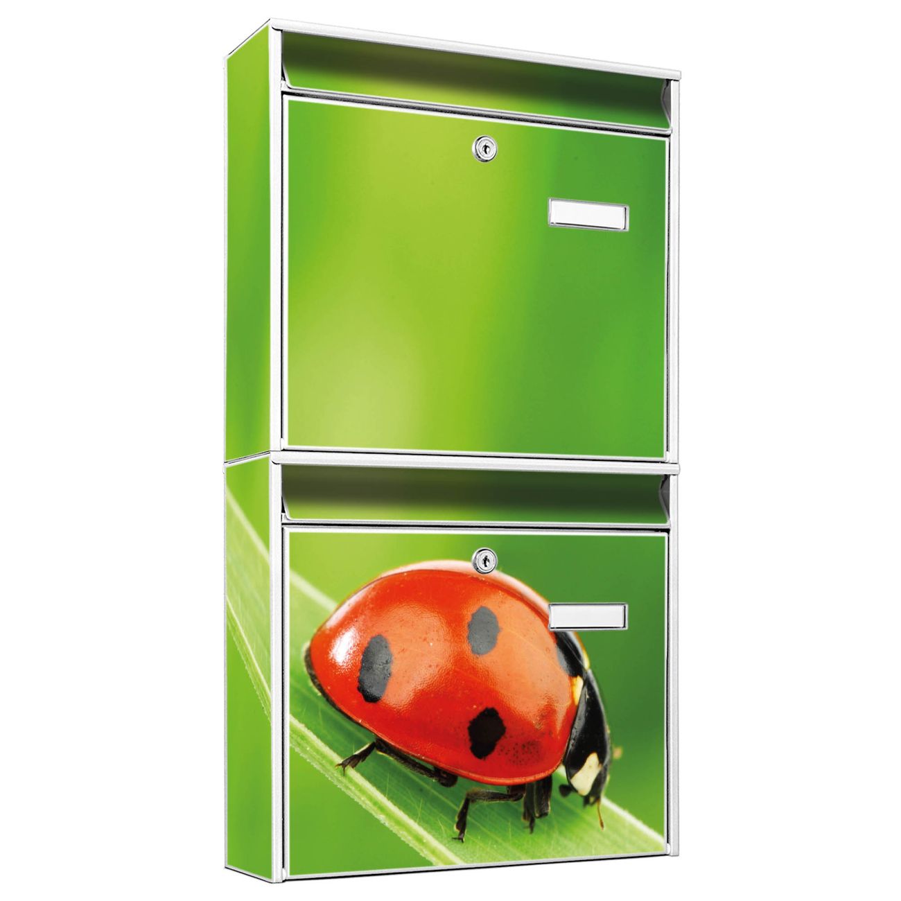 FUNKTION: Die Burg-Wächter Briefkastenanlage mit Motiv Marienkäfer bietet Ihnen ausreichend Fassungsvermögen um auch A4 und C4 Sendungen zu empfangen. Das integrierte Namensschild lässt sich individuell beschriften. Wählen Sie aus den Grundfarben weiß, silber und schwarz. DESIGN: Die 2 Briefkästen haben ein ansprechendes und zeitloses Design, ohne dabei auf Funktionalität zu verzichten. Das Material ist sehr stabil, wetterfest und rostfrei. Durch das Motiv Marienkäfer werden die Postkästen zu einem Blickfang. DETAILS: Die Postkästen bestehen aus verzinktem Stahl der zusätzlich mit Klarlack versiegelt wurde. Die Kästen sind gesamt 64,5cm hoch, 36,2cm breit und 10cm tief. Das Motiv besteht aus einer wetter- und UV-festen Folie, die Ihren Briefkasten zusätzlich vor Kratzern schützt. Die Postkästen werden mit Montagematerial, je einem Namensschild und je zwei Schlüsseln geliefert. NUTZEN: Das Briefkastenset eignet sich für die Wandmontage, die Größe bietet genügend Platz für Sendungen aller Art. Das zeitlose Design sowie die stabile Bauart bieten Ihnen einen treuen Begleiter für Ihre Post. BANJADO: