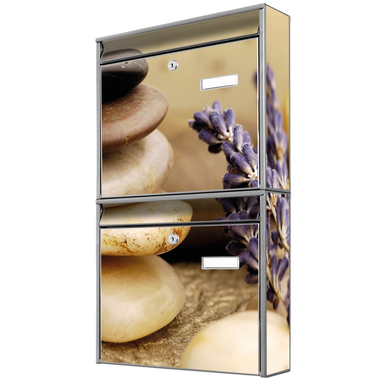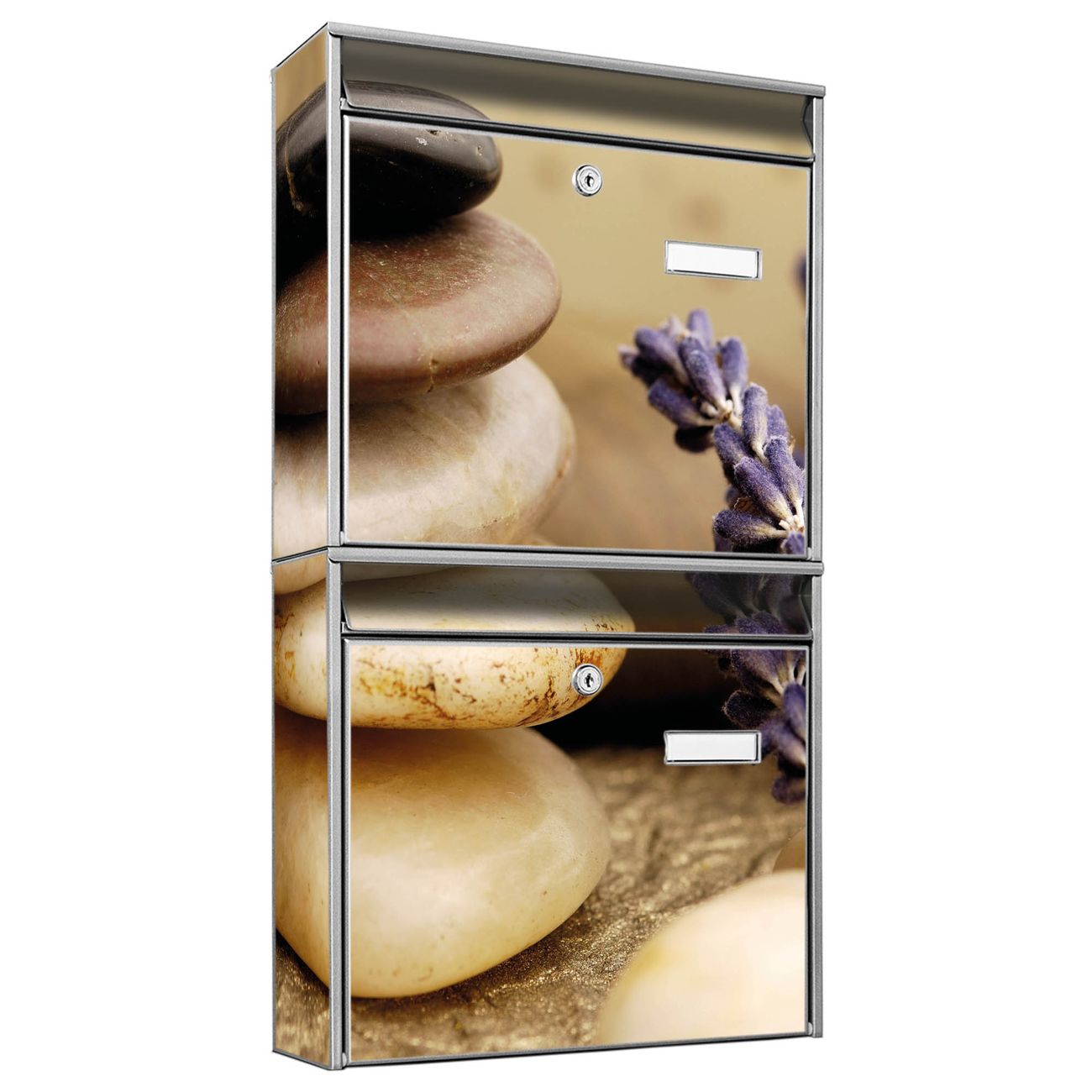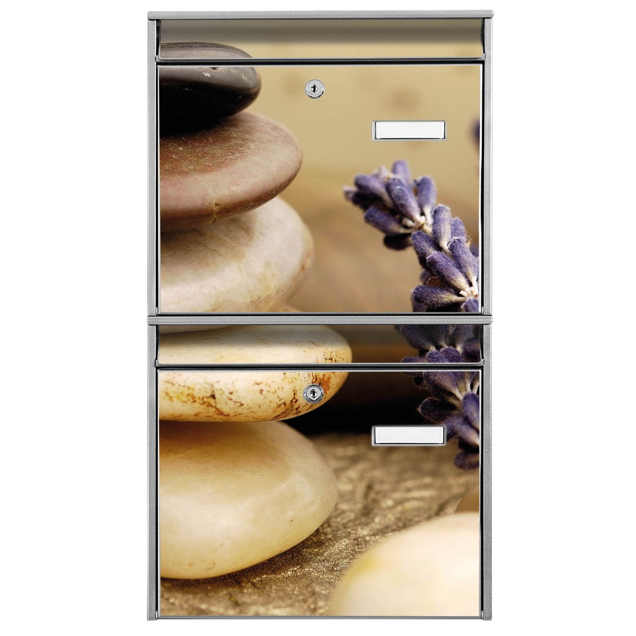 FUNKTION: Die Burg-Wächter Briefkastenanlage mit Motiv Meditation bietet Ihnen ausreichend Fassungsvermögen um auch A4 und C4 Sendungen zu empfangen. Das integrierte Namensschild lässt sich individuell beschriften. Wählen Sie aus den Grundfarben weiß, silber und schwarz. DESIGN: Die 2 Briefkästen haben ein ansprechendes und zeitloses Design, ohne dabei auf Funktionalität zu verzichten. Das Material ist sehr stabil, wetterfest und rostfrei. Durch das Motiv Meditation werden die Postkästen zu einem Blickfang. DETAILS: Die Postkästen bestehen aus verzinktem Stahl der zusätzlich mit Klarlack versiegelt wurde. Die Kästen sind gesamt 64,5cm hoch, 36,2cm breit und 10cm tief. Das Motiv besteht aus einer wetter- und UV-festen Folie, die Ihren Briefkasten zusätzlich vor Kratzern schützt. Die Postkästen werden mit Montagematerial, je einem Namensschild und je zwei Schlüsseln geliefert. NUTZEN: Das Briefkastenset eignet sich für die Wandmontage, die Größe bietet genügend Platz für Sendungen aller Art. Das zeitlose Design sowie die stabile Bauart bieten Ihnen einen treuen Begleiter für Ihre Post. BANJADO: