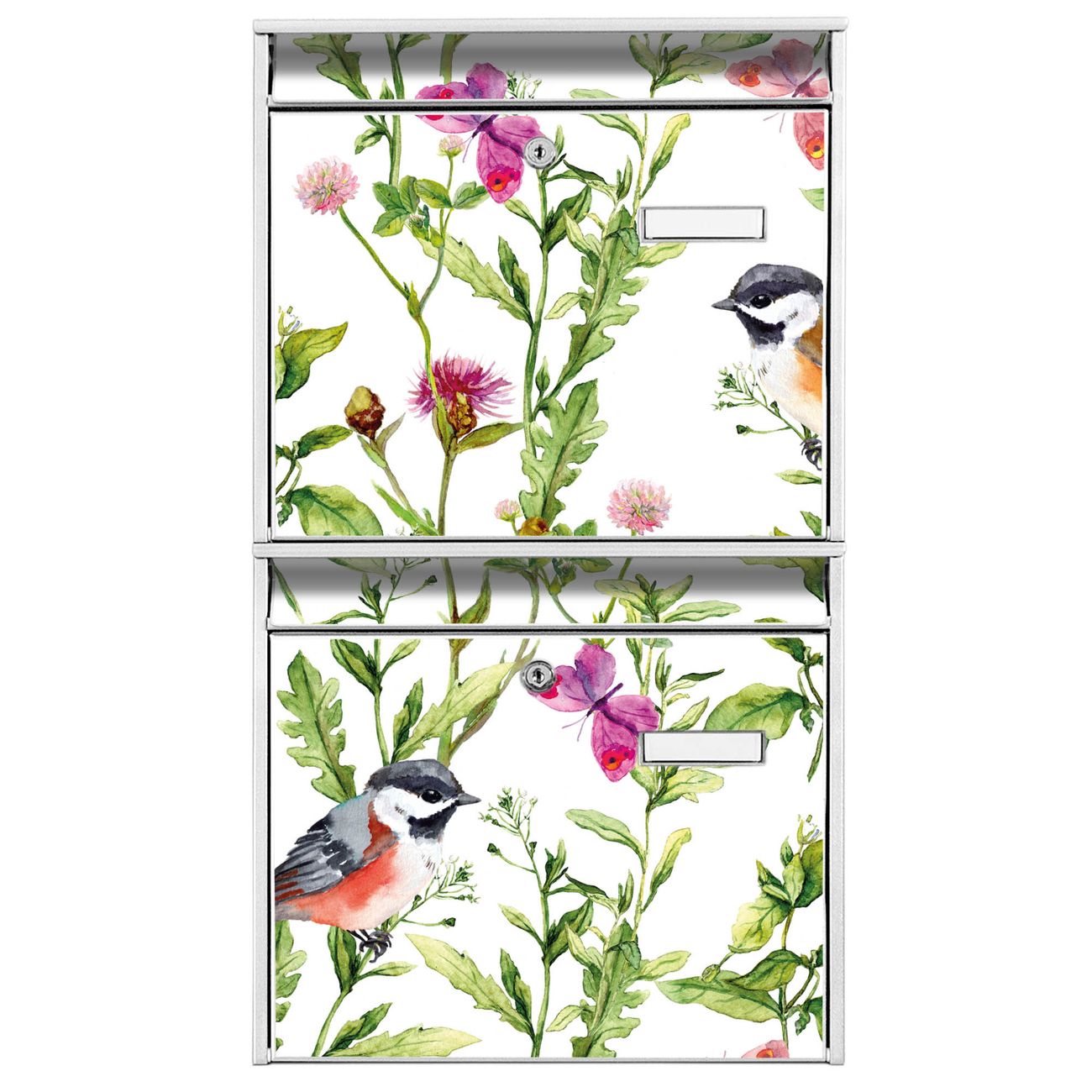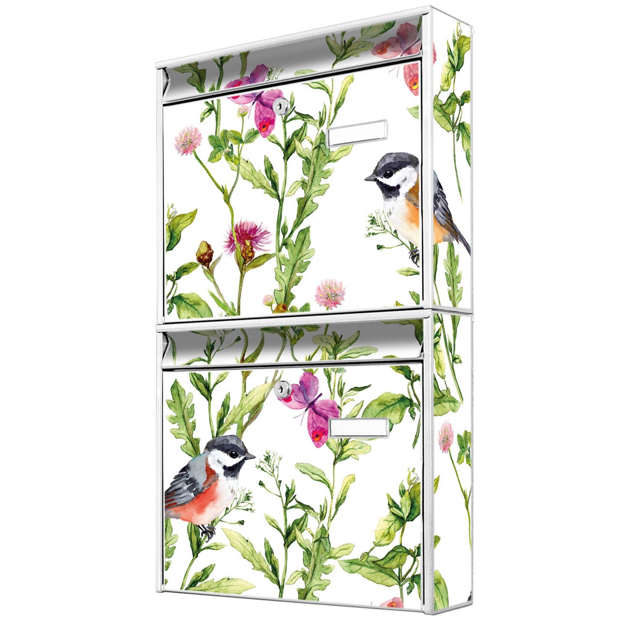 FUNKTION: Die Burg-Wächter Briefkastenanlage mit Motiv Meisen im Klee bietet Ihnen ausreichend Fassungsvermögen um auch A4 und C4 Sendungen zu empfangen. Das integrierte Namensschild lässt sich individuell beschriften. Wählen Sie aus den Grundfarben weiß, silber und schwarz. DESIGN: Die 2 Briefkästen haben ein ansprechendes und zeitloses Design, ohne dabei auf Funktionalität zu verzichten. Das Material ist sehr stabil, wetterfest und rostfrei. Durch das Motiv Meisen im Klee werden die Postkästen zu einem Blickfang. DETAILS: Die Postkästen bestehen aus verzinktem Stahl der zusätzlich mit Klarlack versiegelt wurde. Die Kästen sind gesamt 64,5cm hoch, 36,2cm breit und 10cm tief. Das Motiv besteht aus einer wetter- und UV-festen Folie, die Ihren Briefkasten zusätzlich vor Kratzern schützt. Die Postkästen werden mit Montagematerial, je einem Namensschild und je zwei Schlüsseln geliefert. NUTZEN: Das Briefkastenset eignet sich für die Wandmontage, die Größe bietet genügend Platz für Sendungen aller Art. Das zeitlose Design sowie die stabile Bauart bieten Ihnen einen treuen Begleiter für Ihre Post. BANJADO: