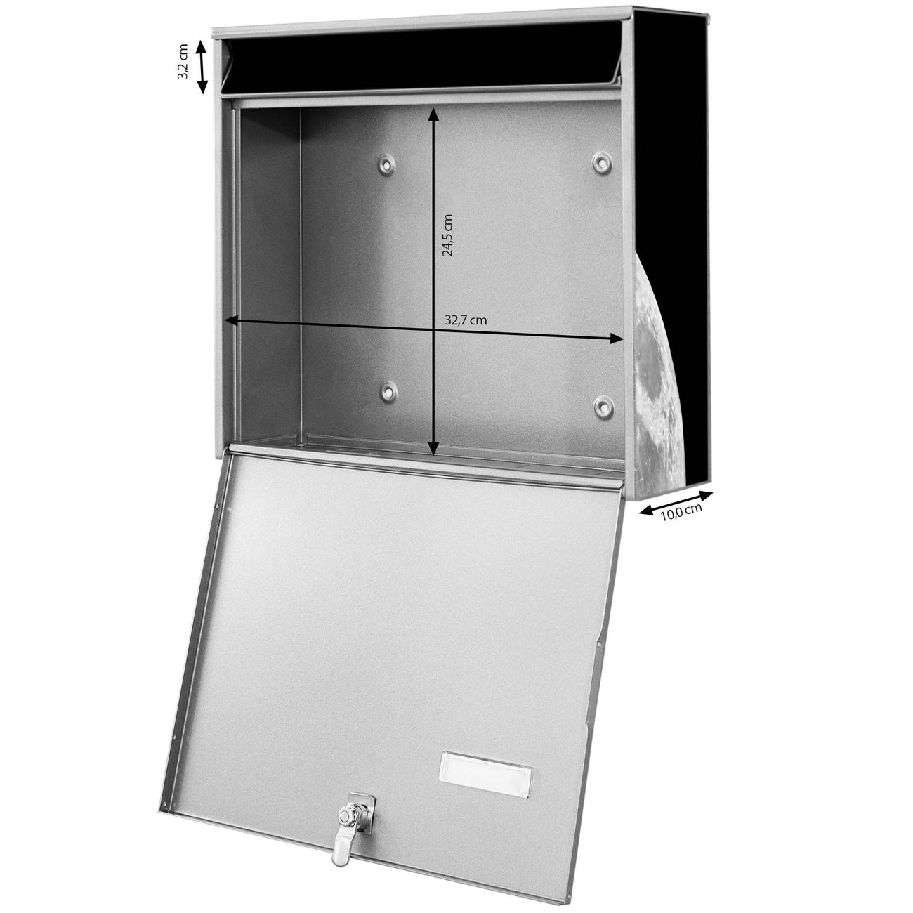 FUNKTION: Die Burg-Wächter Briefkastenanlage mit Motiv Mond bietet Ihnen ausreichend Fassungsvermögen um auch A4 und C4 Sendungen zu empfangen. Das integrierte Namensschild lässt sich individuell beschriften. Wählen Sie aus den Grundfarben weiß, silber und schwarz. DESIGN: Die 2 Briefkästen haben ein ansprechendes und zeitloses Design, ohne dabei auf Funktionalität zu verzichten. Das Material ist sehr stabil, wetterfest und rostfrei. Durch das Motiv Mond werden die Postkästen zu einem Blickfang. DETAILS: Die Postkästen bestehen aus verzinktem Stahl der zusätzlich mit Klarlack versiegelt wurde. Die Kästen sind gesamt 64,5cm hoch, 36,2cm breit und 10cm tief. Das Motiv besteht aus einer wetter- und UV-festen Folie, die Ihren Briefkasten zusätzlich vor Kratzern schützt. Die Postkästen werden mit Montagematerial, je einem Namensschild und je zwei Schlüsseln geliefert. NUTZEN: Das Briefkastenset eignet sich für die Wandmontage, die Größe bietet genügend Platz für Sendungen aller Art. Das zeitlose Design sowie die stabile Bauart bieten Ihnen einen treuen Begleiter für Ihre Post. BANJADO: