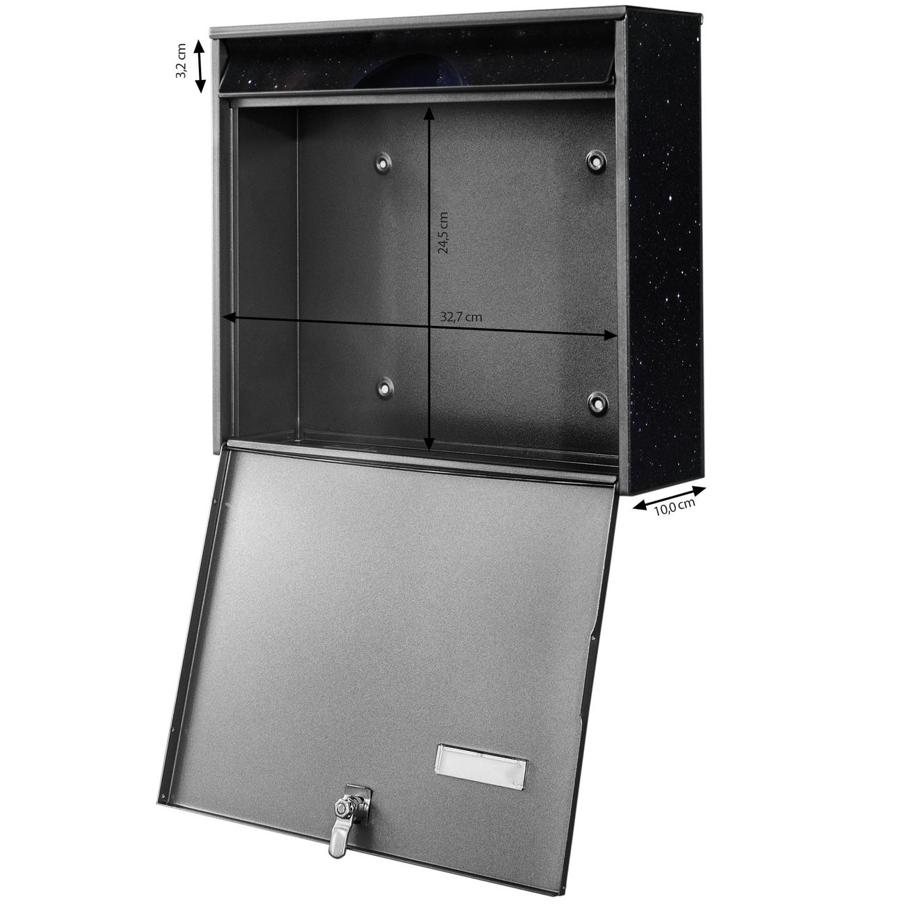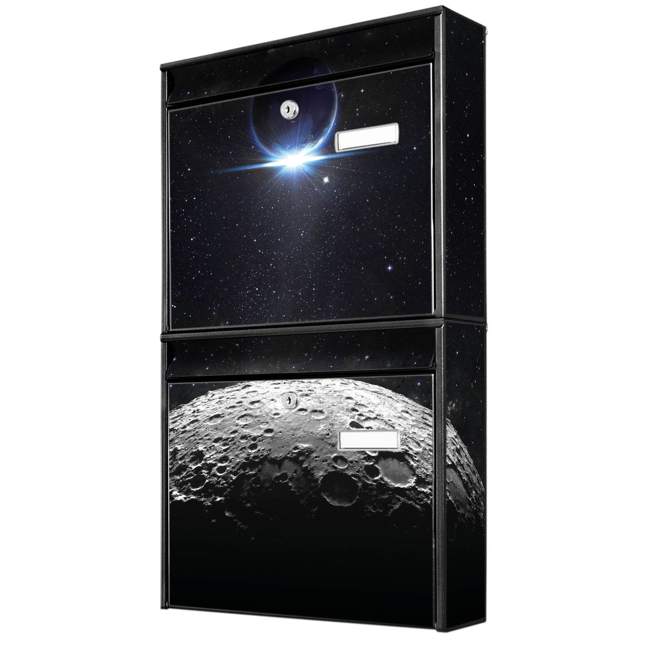 FUNKTION: Die Burg-Wächter Briefkastenanlage mit Motiv Mondlandschaft bietet Ihnen ausreichend Fassungsvermögen um auch A4 und C4 Sendungen zu empfangen. Das integrierte Namensschild lässt sich individuell beschriften. Wählen Sie aus den Grundfarben weiß, silber und schwarz. DESIGN: Die 2 Briefkästen haben ein ansprechendes und zeitloses Design, ohne dabei auf Funktionalität zu verzichten. Das Material ist sehr stabil, wetterfest und rostfrei. Durch das Motiv Mondlandschaft werden die Postkästen zu einem Blickfang. DETAILS: Die Postkästen bestehen aus verzinktem Stahl der zusätzlich mit Klarlack versiegelt wurde. Die Kästen sind gesamt 64,5cm hoch, 36,2cm breit und 10cm tief. Das Motiv besteht aus einer wetter- und UV-festen Folie, die Ihren Briefkasten zusätzlich vor Kratzern schützt. Die Postkästen werden mit Montagematerial, je einem Namensschild und je zwei Schlüsseln geliefert. NUTZEN: Das Briefkastenset eignet sich für die Wandmontage, die Größe bietet genügend Platz für Sendungen aller Art. Das zeitlose Design sowie die stabile Bauart bieten Ihnen einen treuen Begleiter für Ihre Post. BANJADO: