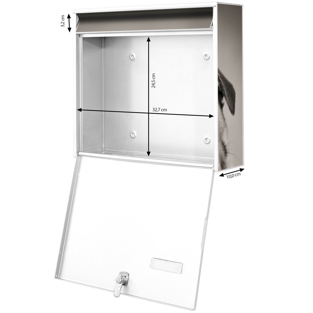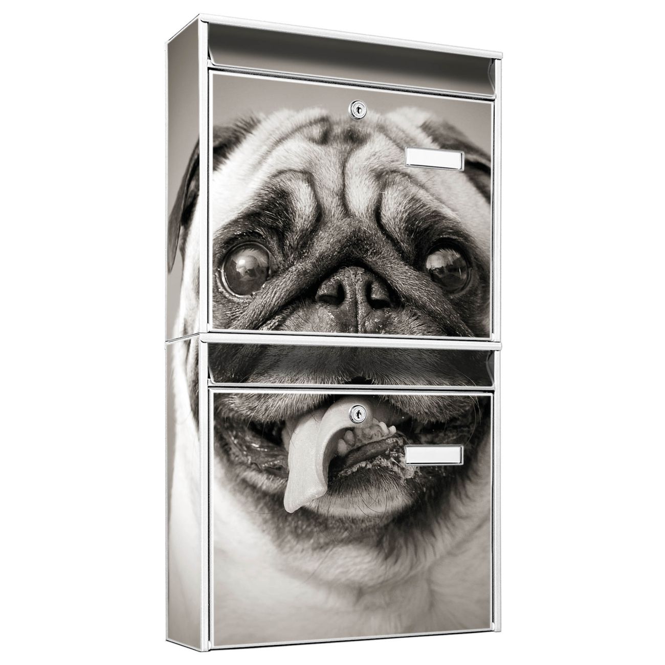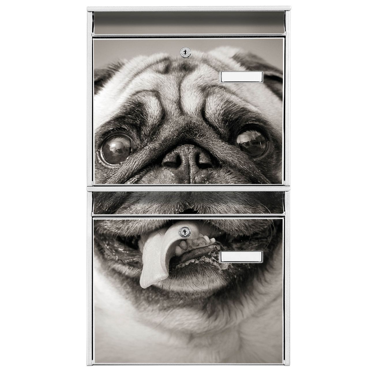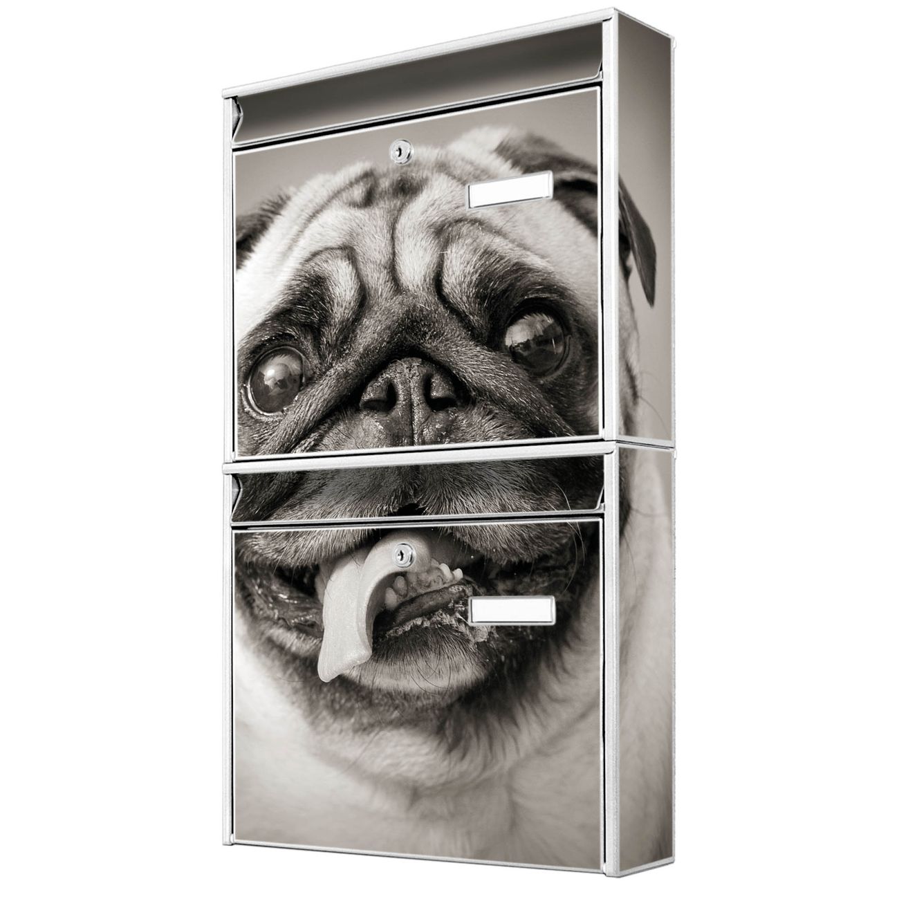FUNKTION: Die Burg-Wächter Briefkastenanlage mit Motiv Mops Porträt bietet Ihnen ausreichend Fassungsvermögen um auch A4 und C4 Sendungen zu empfangen. Das integrierte Namensschild lässt sich individuell beschriften. Wählen Sie aus den Grundfarben weiß, silber und schwarz. DESIGN: Die 2 Briefkästen haben ein ansprechendes und zeitloses Design, ohne dabei auf Funktionalität zu verzichten. Das Material ist sehr stabil, wetterfest und rostfrei. Durch das Motiv Mops Porträt werden die Postkästen zu einem Blickfang. DETAILS: Die Postkästen bestehen aus verzinktem Stahl der zusätzlich mit Klarlack versiegelt wurde. Die Kästen sind gesamt 64,5cm hoch, 36,2cm breit und 10cm tief. Das Motiv besteht aus einer wetter- und UV-festen Folie, die Ihren Briefkasten zusätzlich vor Kratzern schützt. Die Postkästen werden mit Montagematerial, je einem Namensschild und je zwei Schlüsseln geliefert. NUTZEN: Das Briefkastenset eignet sich für die Wandmontage, die Größe bietet genügend Platz für Sendungen aller Art. Das zeitlose Design sowie die stabile Bauart bieten Ihnen einen treuen Begleiter für Ihre Post. BANJADO: