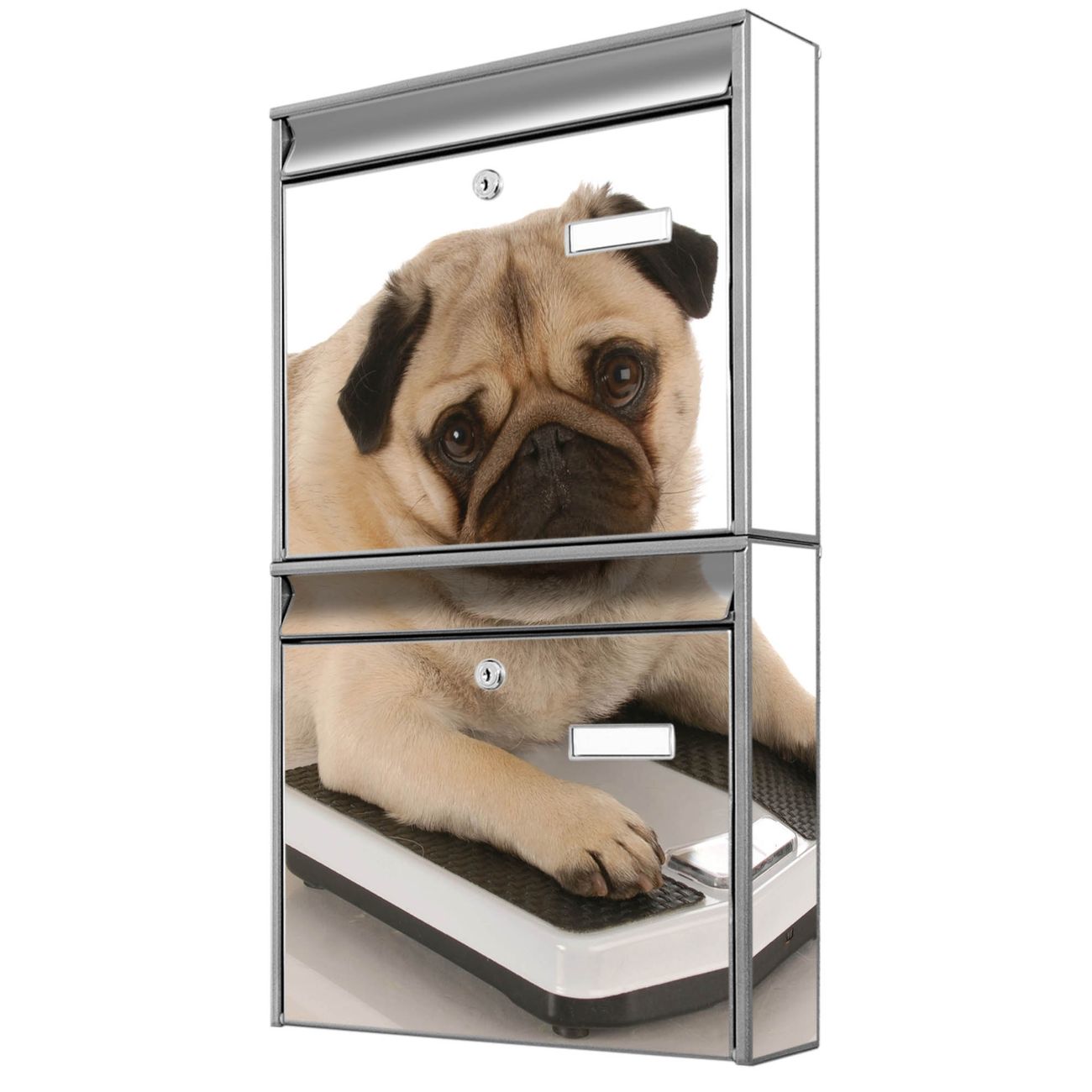FUNKTION: Die Burg-Wächter Briefkastenanlage mit Motiv Mops bietet Ihnen ausreichend Fassungsvermögen um auch A4 und C4 Sendungen zu empfangen. Das integrierte Namensschild lässt sich individuell beschriften. Wählen Sie aus den Grundfarben weiß, silber und schwarz. DESIGN: Die 2 Briefkästen haben ein ansprechendes und zeitloses Design, ohne dabei auf Funktionalität zu verzichten. Das Material ist sehr stabil, wetterfest und rostfrei. Durch das Motiv Mops werden die Postkästen zu einem Blickfang. DETAILS: Die Postkästen bestehen aus verzinktem Stahl der zusätzlich mit Klarlack versiegelt wurde. Die Kästen sind gesamt 64,5cm hoch, 36,2cm breit und 10cm tief. Das Motiv besteht aus einer wetter- und UV-festen Folie, die Ihren Briefkasten zusätzlich vor Kratzern schützt. Die Postkästen werden mit Montagematerial, je einem Namensschild und je zwei Schlüsseln geliefert. NUTZEN: Das Briefkastenset eignet sich für die Wandmontage, die Größe bietet genügend Platz für Sendungen aller Art. Das zeitlose Design sowie die stabile Bauart bieten Ihnen einen treuen Begleiter für Ihre Post. BANJADO: