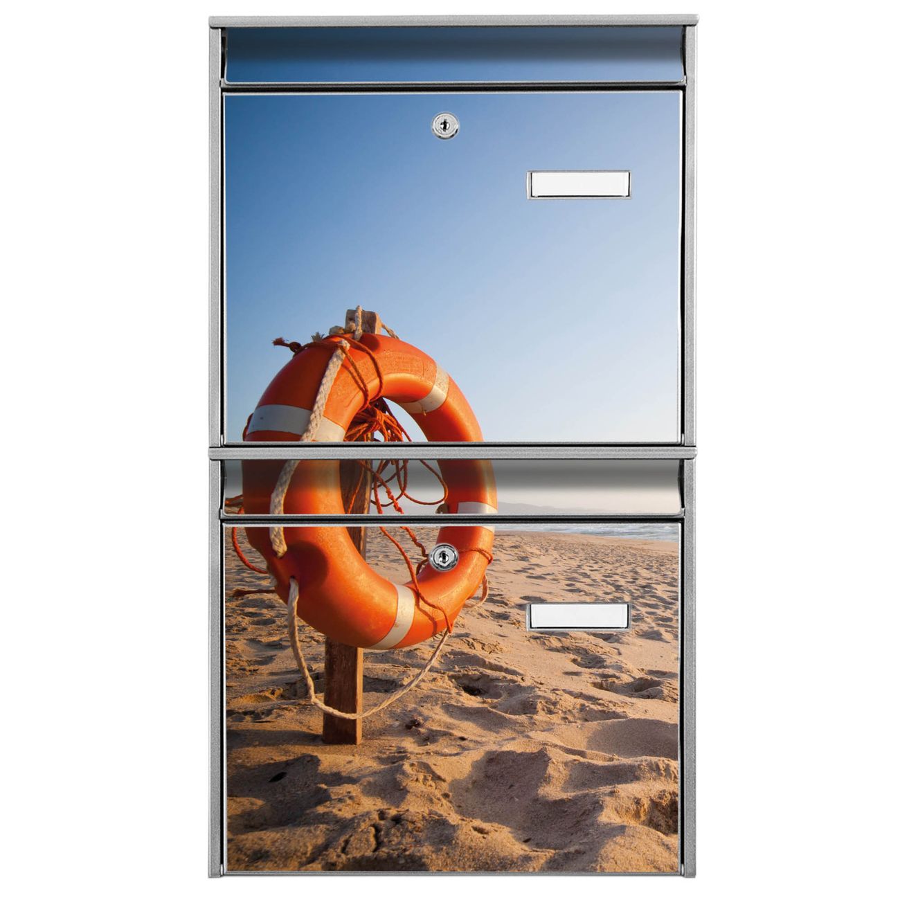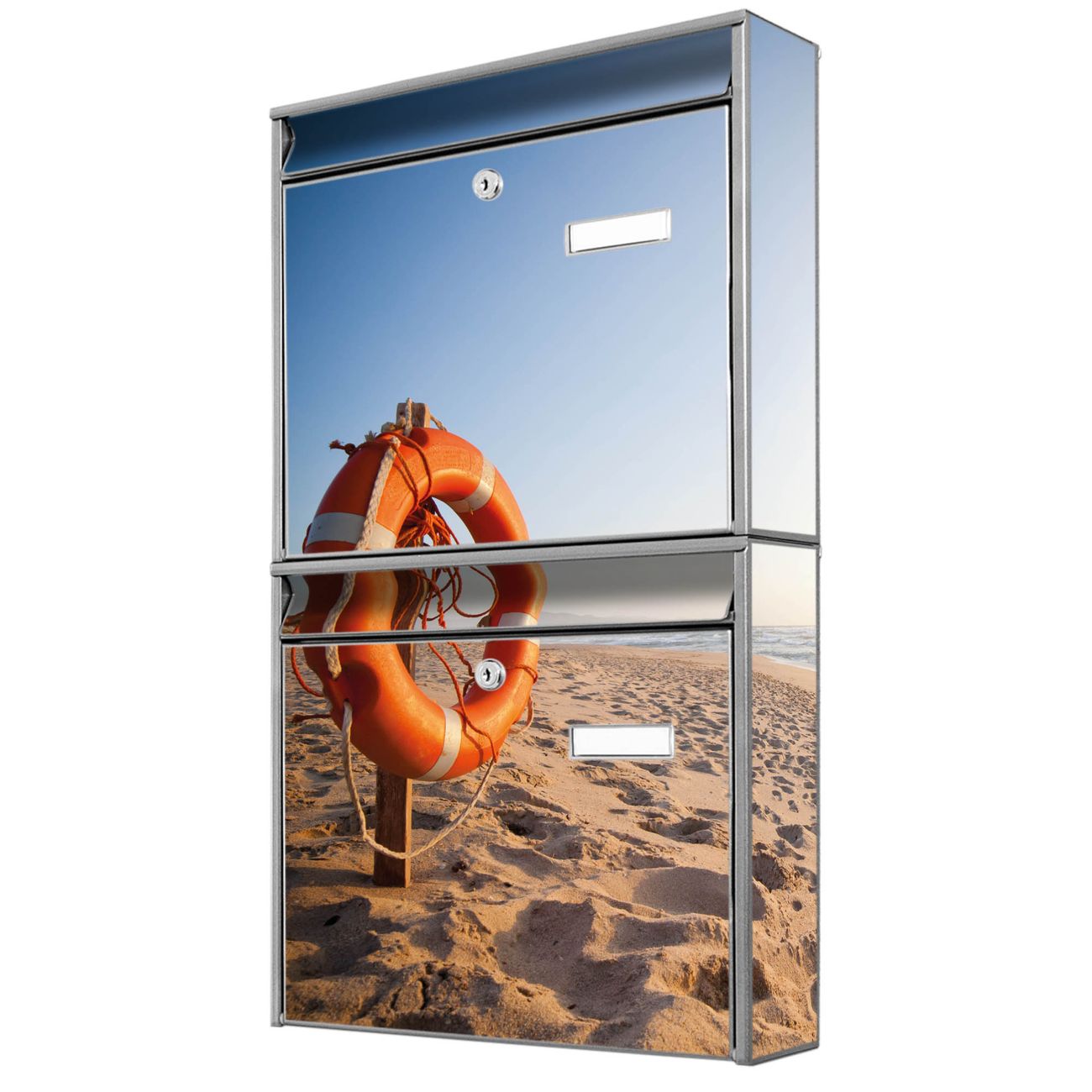 FUNKTION: Die Burg-Wächter Briefkastenanlage mit Motiv Morgens Am Strand bietet Ihnen ausreichend Fassungsvermögen um auch A4 und C4 Sendungen zu empfangen. Das integrierte Namensschild lässt sich individuell beschriften. Wählen Sie aus den Grundfarben weiß, silber und schwarz. DESIGN: Die 2 Briefkästen haben ein ansprechendes und zeitloses Design, ohne dabei auf Funktionalität zu verzichten. Das Material ist sehr stabil, wetterfest und rostfrei. Durch das Motiv Morgens Am Strand werden die Postkästen zu einem Blickfang. DETAILS: Die Postkästen bestehen aus verzinktem Stahl der zusätzlich mit Klarlack versiegelt wurde. Die Kästen sind gesamt 64,5cm hoch, 36,2cm breit und 10cm tief. Das Motiv besteht aus einer wetter- und UV-festen Folie, die Ihren Briefkasten zusätzlich vor Kratzern schützt. Die Postkästen werden mit Montagematerial, je einem Namensschild und je zwei Schlüsseln geliefert. NUTZEN: Das Briefkastenset eignet sich für die Wandmontage, die Größe bietet genügend Platz für Sendungen aller Art. Das zeitlose Design sowie die stabile Bauart bieten Ihnen einen treuen Begleiter für Ihre Post. BANJADO: