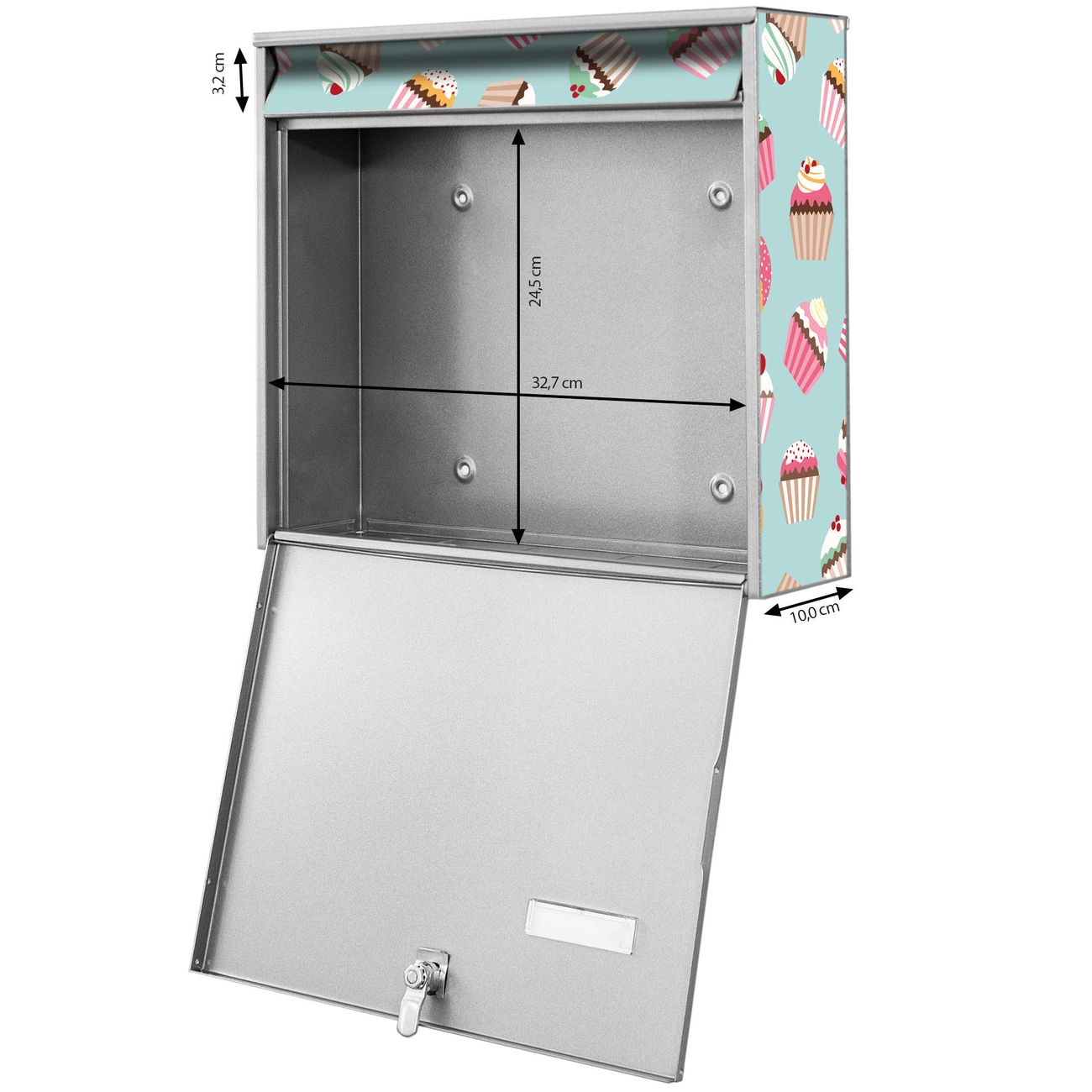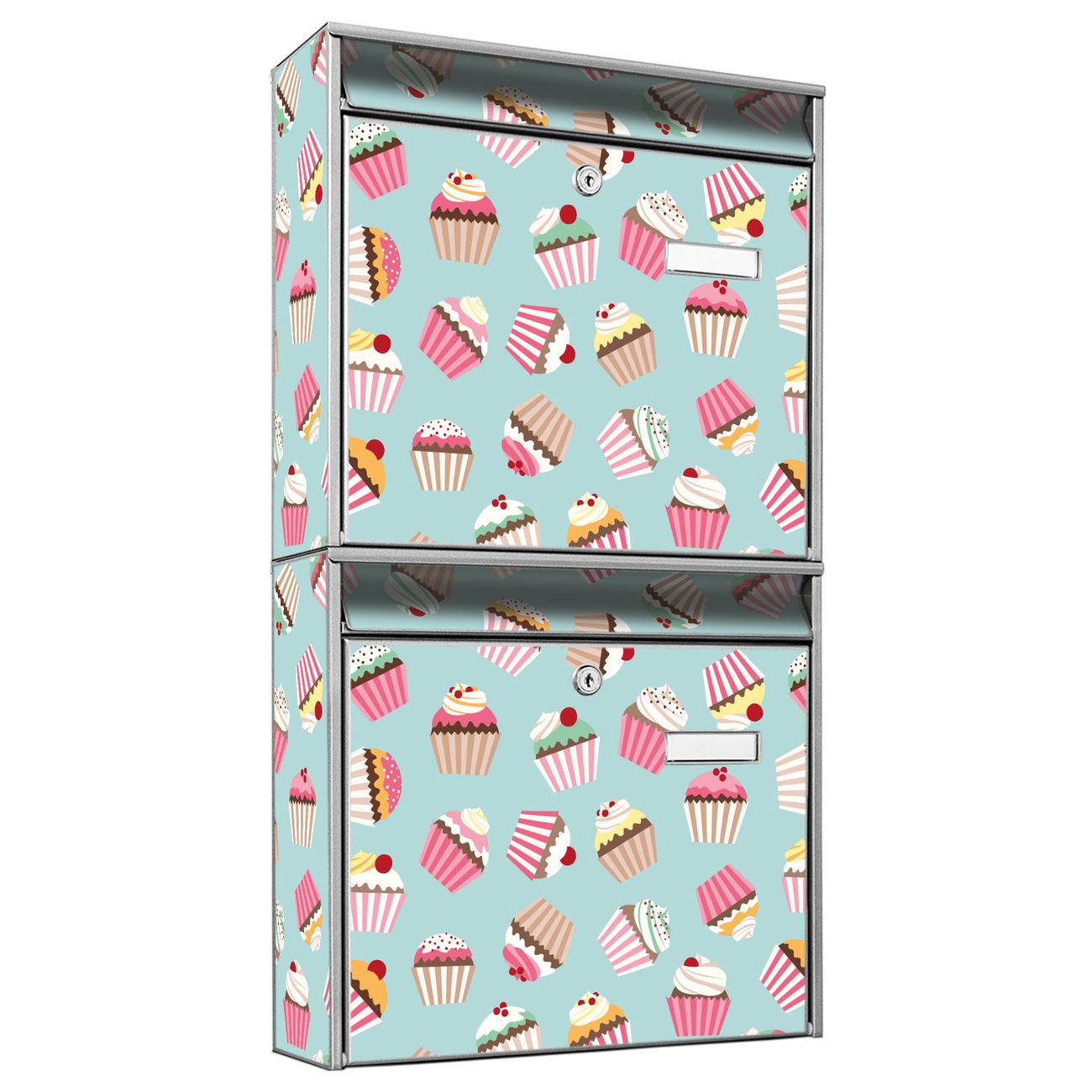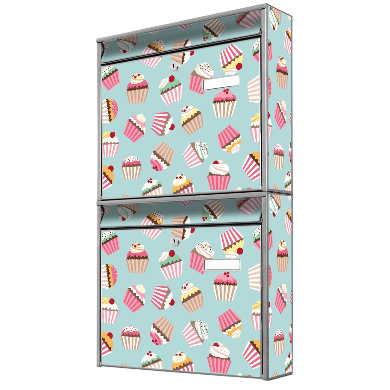 FUNKTION: Die Burg-Wächter Briefkastenanlage mit Motiv Muffins bietet Ihnen ausreichend Fassungsvermögen um auch A4 und C4 Sendungen zu empfangen. Das integrierte Namensschild lässt sich individuell beschriften. Wählen Sie aus den Grundfarben weiß, silber und schwarz. DESIGN: Die 2 Briefkästen haben ein ansprechendes und zeitloses Design, ohne dabei auf Funktionalität zu verzichten. Das Material ist sehr stabil, wetterfest und rostfrei. Durch das Motiv Muffins werden die Postkästen zu einem Blickfang. DETAILS: Die Postkästen bestehen aus verzinktem Stahl der zusätzlich mit Klarlack versiegelt wurde. Die Kästen sind gesamt 64,5cm hoch, 36,2cm breit und 10cm tief. Das Motiv besteht aus einer wetter- und UV-festen Folie, die Ihren Briefkasten zusätzlich vor Kratzern schützt. Die Postkästen werden mit Montagematerial, je einem Namensschild und je zwei Schlüsseln geliefert. NUTZEN: Das Briefkastenset eignet sich für die Wandmontage, die Größe bietet genügend Platz für Sendungen aller Art. Das zeitlose Design sowie die stabile Bauart bieten Ihnen einen treuen Begleiter für Ihre Post. BANJADO: