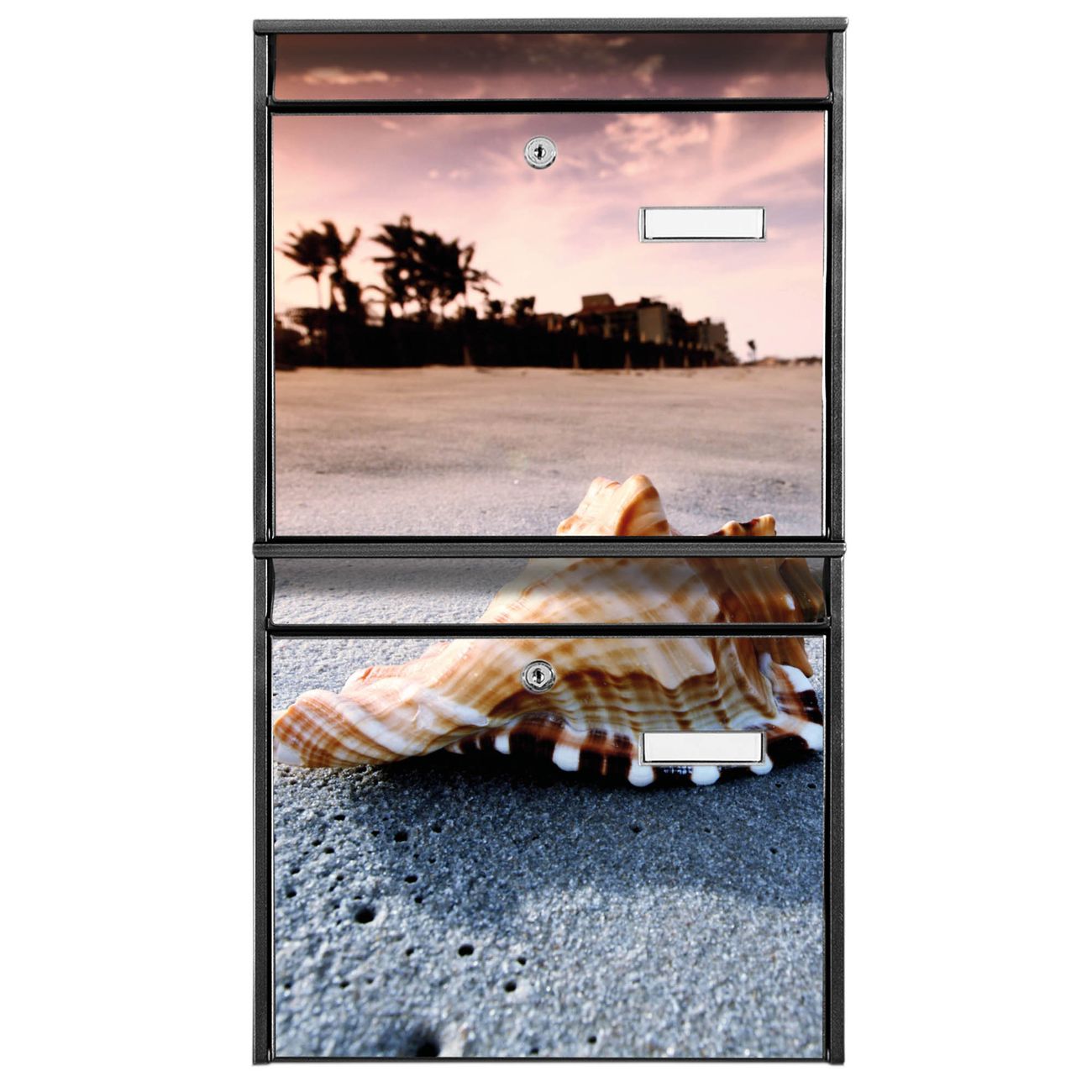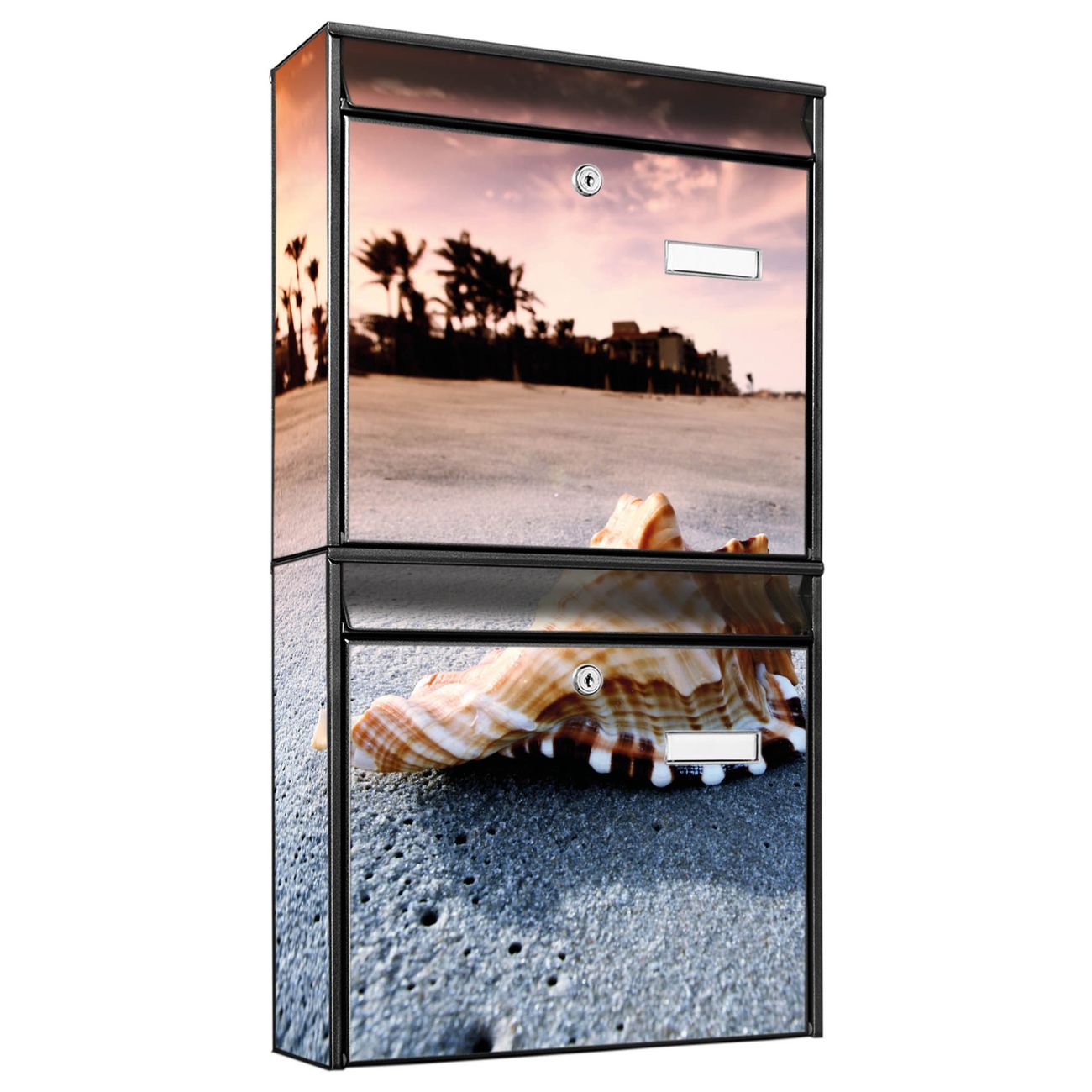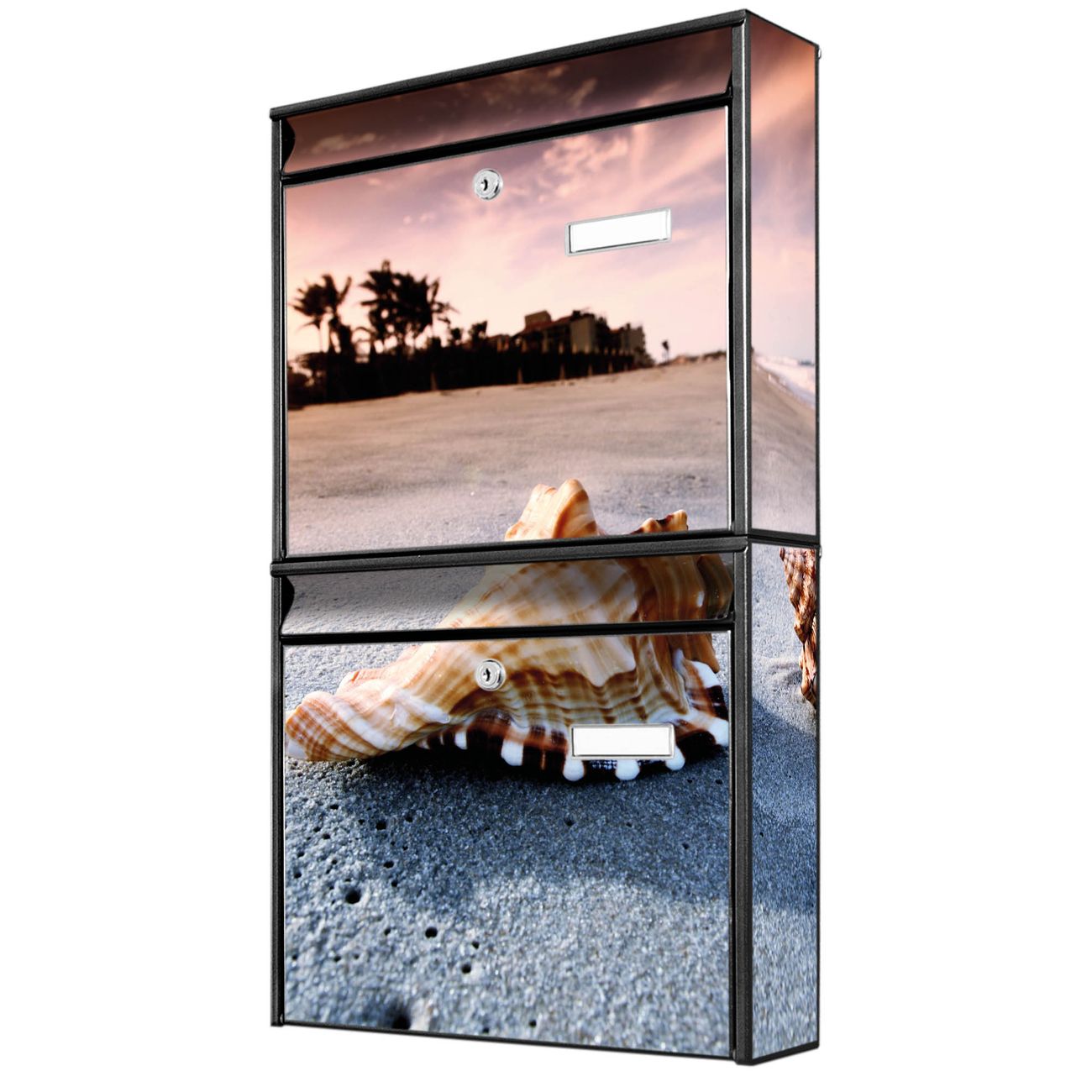 FUNKTION: Die Burg-Wächter Briefkastenanlage mit Motiv Muscheln bietet Ihnen ausreichend Fassungsvermögen um auch A4 und C4 Sendungen zu empfangen. Das integrierte Namensschild lässt sich individuell beschriften. Wählen Sie aus den Grundfarben weiß, silber und schwarz. DESIGN: Die 2 Briefkästen haben ein ansprechendes und zeitloses Design, ohne dabei auf Funktionalität zu verzichten. Das Material ist sehr stabil, wetterfest und rostfrei. Durch das Motiv Muscheln werden die Postkästen zu einem Blickfang. DETAILS: Die Postkästen bestehen aus verzinktem Stahl der zusätzlich mit Klarlack versiegelt wurde. Die Kästen sind gesamt 64,5cm hoch, 36,2cm breit und 10cm tief. Das Motiv besteht aus einer wetter- und UV-festen Folie, die Ihren Briefkasten zusätzlich vor Kratzern schützt. Die Postkästen werden mit Montagematerial, je einem Namensschild und je zwei Schlüsseln geliefert. NUTZEN: Das Briefkastenset eignet sich für die Wandmontage, die Größe bietet genügend Platz für Sendungen aller Art. Das zeitlose Design sowie die stabile Bauart bieten Ihnen einen treuen Begleiter für Ihre Post. BANJADO:
