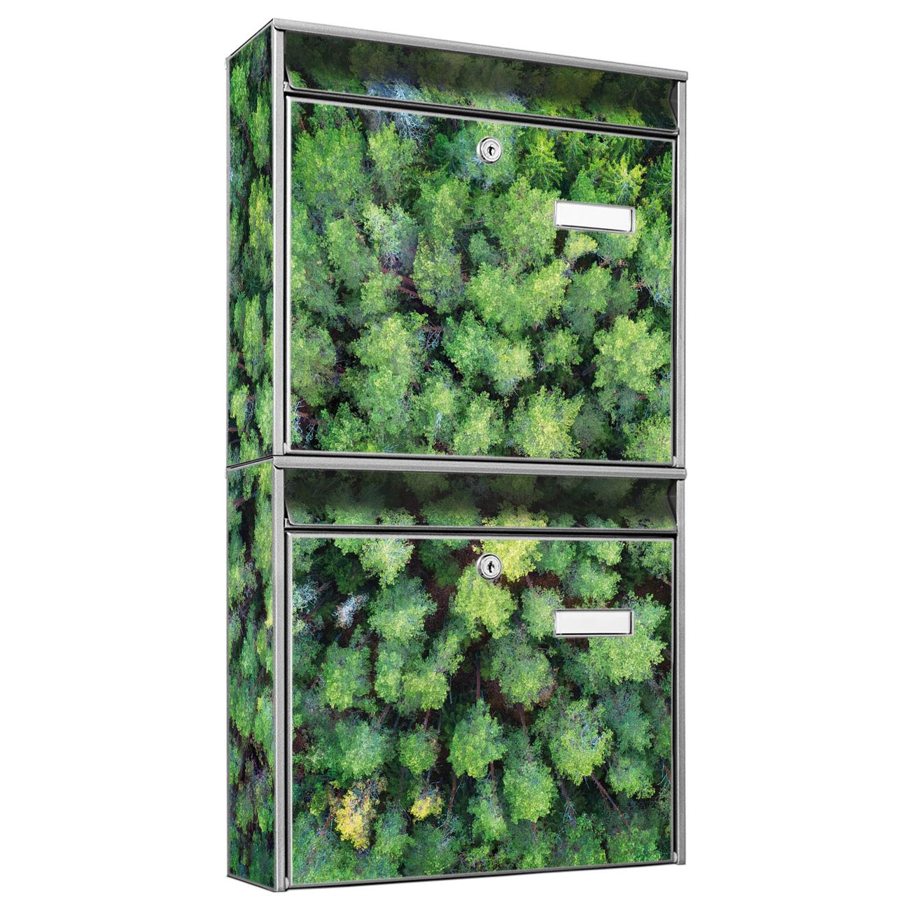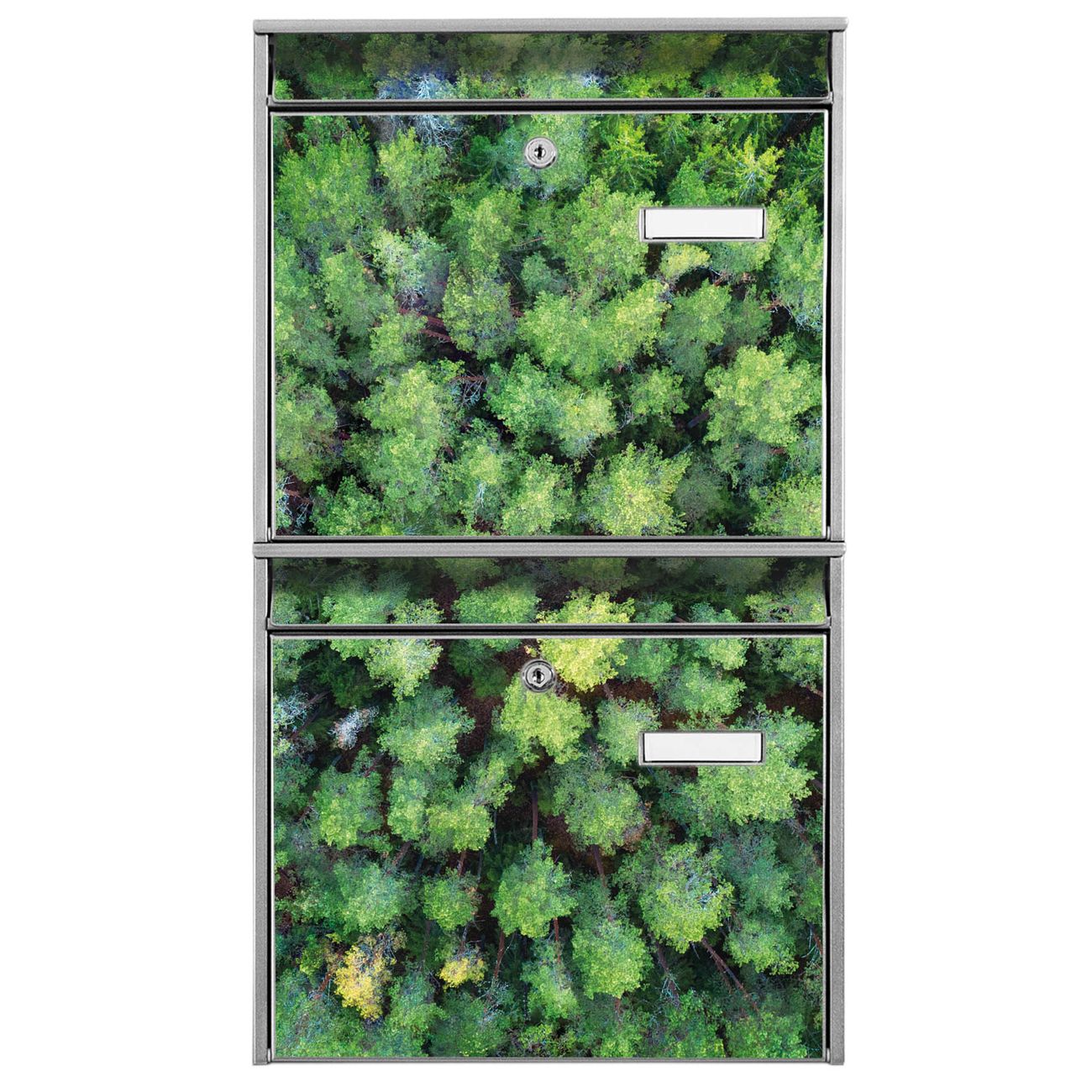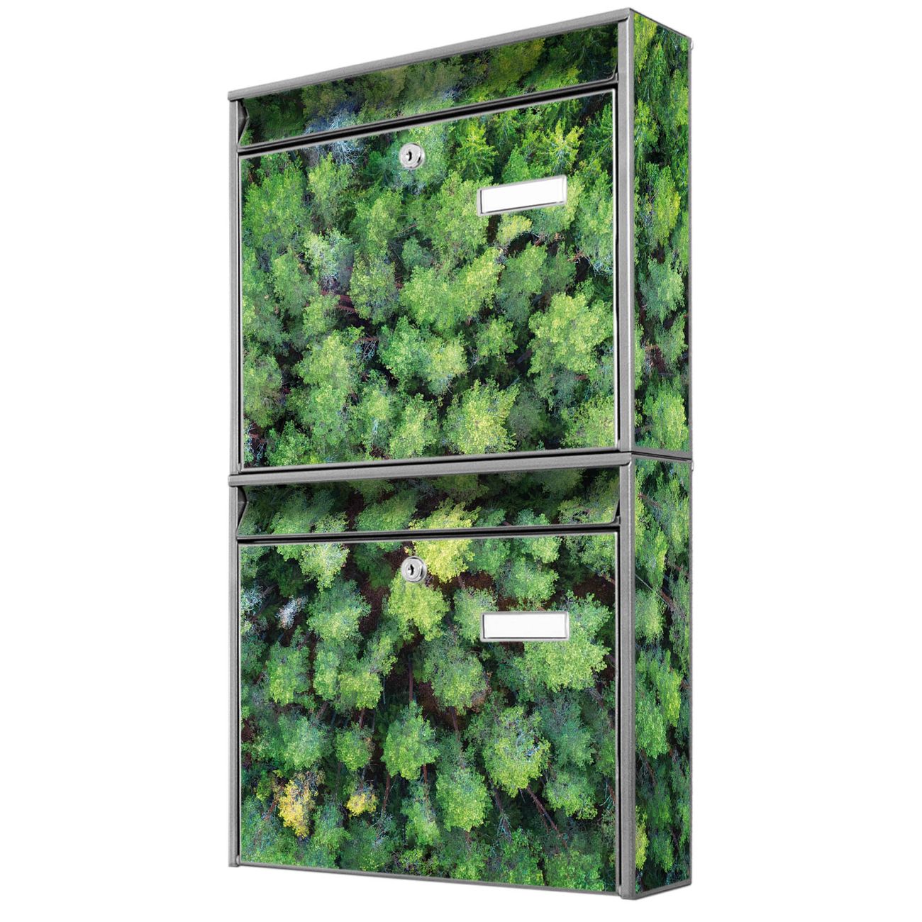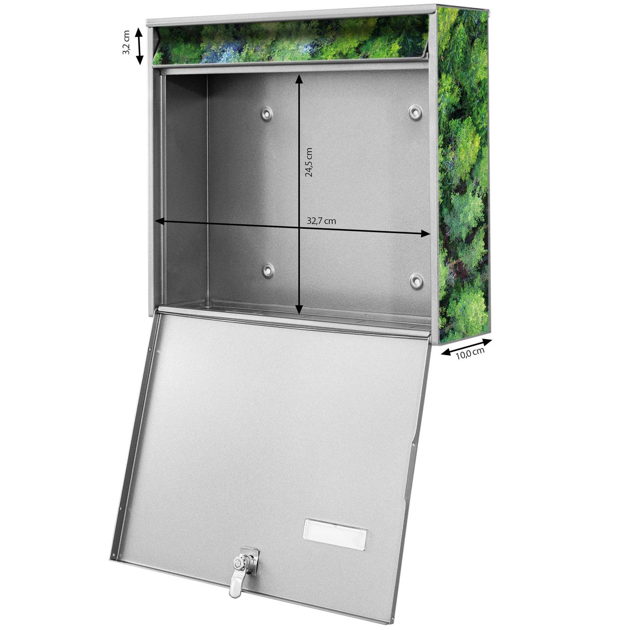 FUNKTION: Die Burg-Wächter Briefkastenanlage mit Motiv Nadelwald bietet Ihnen ausreichend Fassungsvermögen um auch A4 und C4 Sendungen zu empfangen. Das integrierte Namensschild lässt sich individuell beschriften. Wählen Sie aus den Grundfarben weiß, silber und schwarz. DESIGN: Die 2 Briefkästen haben ein ansprechendes und zeitloses Design, ohne dabei auf Funktionalität zu verzichten. Das Material ist sehr stabil, wetterfest und rostfrei. Durch das Motiv Nadelwald werden die Postkästen zu einem Blickfang. DETAILS: Die Postkästen bestehen aus verzinktem Stahl der zusätzlich mit Klarlack versiegelt wurde. Die Kästen sind gesamt 64,5cm hoch, 36,2cm breit und 10cm tief. Das Motiv besteht aus einer wetter- und UV-festen Folie, die Ihren Briefkasten zusätzlich vor Kratzern schützt. Die Postkästen werden mit Montagematerial, je einem Namensschild und je zwei Schlüsseln geliefert. NUTZEN: Das Briefkastenset eignet sich für die Wandmontage, die Größe bietet genügend Platz für Sendungen aller Art. Das zeitlose Design sowie die stabile Bauart bieten Ihnen einen treuen Begleiter für Ihre Post. BANJADO: