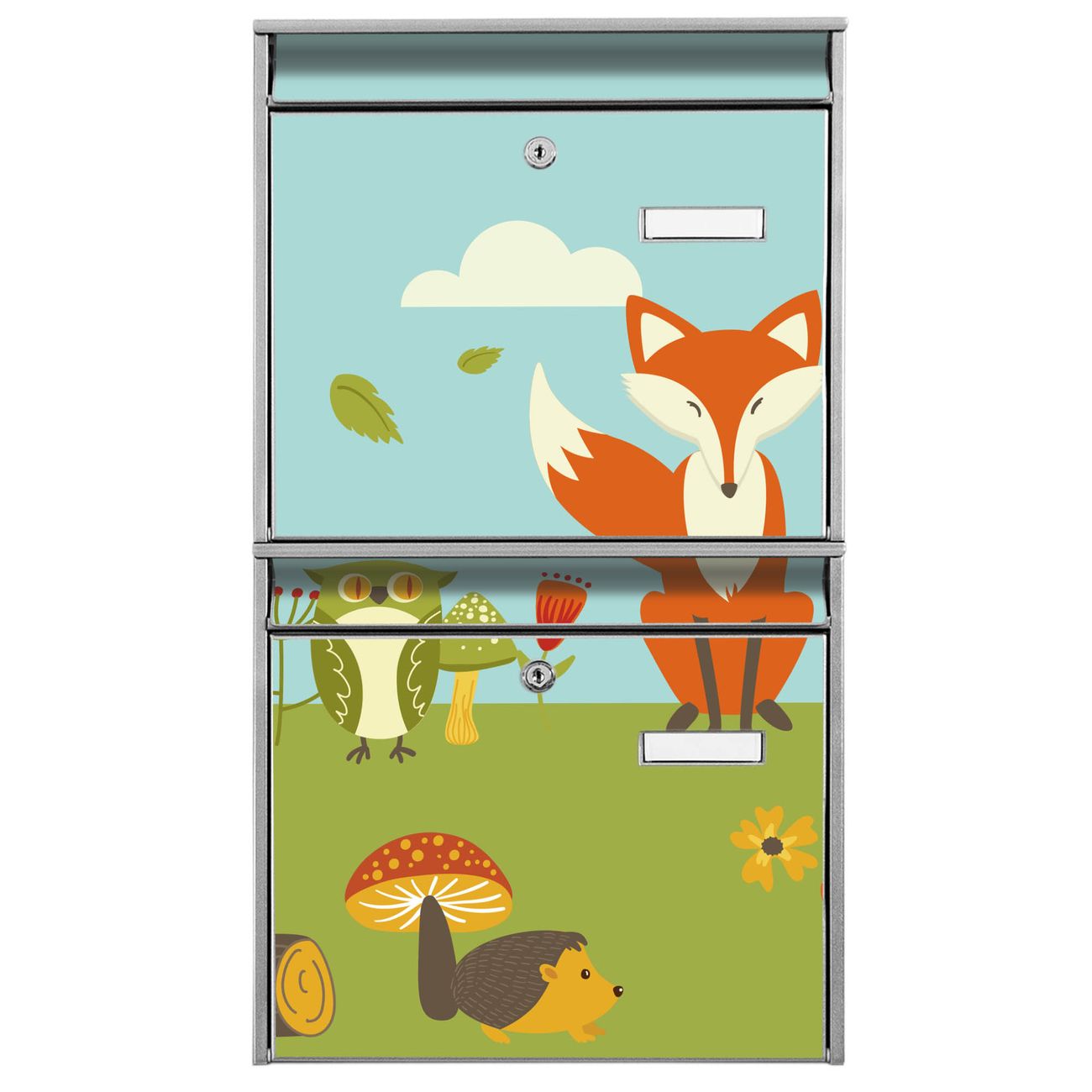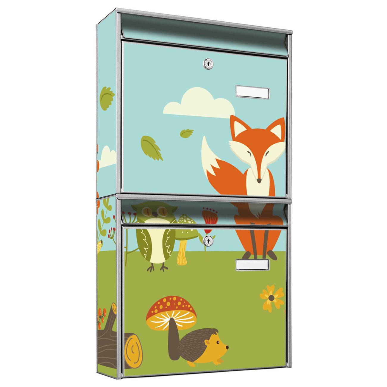 FUNKTION: Die Burg-Wächter Briefkastenanlage mit Motiv Neulich Im Wald bietet Ihnen ausreichend Fassungsvermögen um auch A4 und C4 Sendungen zu empfangen. Das integrierte Namensschild lässt sich individuell beschriften. Wählen Sie aus den Grundfarben weiß, silber und schwarz. DESIGN: Die 2 Briefkästen haben ein ansprechendes und zeitloses Design, ohne dabei auf Funktionalität zu verzichten. Das Material ist sehr stabil, wetterfest und rostfrei. Durch das Motiv Neulich Im Wald werden die Postkästen zu einem Blickfang. DETAILS: Die Postkästen bestehen aus verzinktem Stahl der zusätzlich mit Klarlack versiegelt wurde. Die Kästen sind gesamt 64,5cm hoch, 36,2cm breit und 10cm tief. Das Motiv besteht aus einer wetter- und UV-festen Folie, die Ihren Briefkasten zusätzlich vor Kratzern schützt. Die Postkästen werden mit Montagematerial, je einem Namensschild und je zwei Schlüsseln geliefert. NUTZEN: Das Briefkastenset eignet sich für die Wandmontage, die Größe bietet genügend Platz für Sendungen aller Art. Das zeitlose Design sowie die stabile Bauart bieten Ihnen einen treuen Begleiter für Ihre Post. BANJADO: