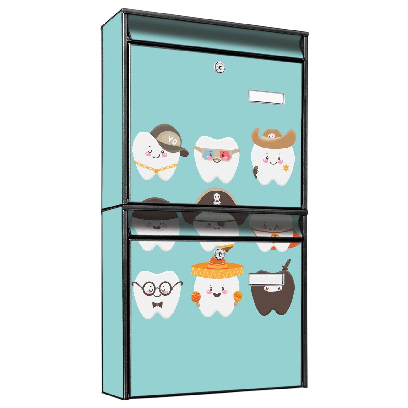 FUNKTION: Die Burg-Wächter Briefkastenanlage mit Motiv Neun Zähne bietet Ihnen ausreichend Fassungsvermögen um auch A4 und C4 Sendungen zu empfangen. Das integrierte Namensschild lässt sich individuell beschriften. Wählen Sie aus den Grundfarben weiß, silber und schwarz. DESIGN: Die 2 Briefkästen haben ein ansprechendes und zeitloses Design, ohne dabei auf Funktionalität zu verzichten. Das Material ist sehr stabil, wetterfest und rostfrei. Durch das Motiv Neun Zähne werden die Postkästen zu einem Blickfang. DETAILS: Die Postkästen bestehen aus verzinktem Stahl der zusätzlich mit Klarlack versiegelt wurde. Die Kästen sind gesamt 64,5cm hoch, 36,2cm breit und 10cm tief. Das Motiv besteht aus einer wetter- und UV-festen Folie, die Ihren Briefkasten zusätzlich vor Kratzern schützt. Die Postkästen werden mit Montagematerial, je einem Namensschild und je zwei Schlüsseln geliefert. NUTZEN: Das Briefkastenset eignet sich für die Wandmontage, die Größe bietet genügend Platz für Sendungen aller Art. Das zeitlose Design sowie die stabile Bauart bieten Ihnen einen treuen Begleiter für Ihre Post. BANJADO: