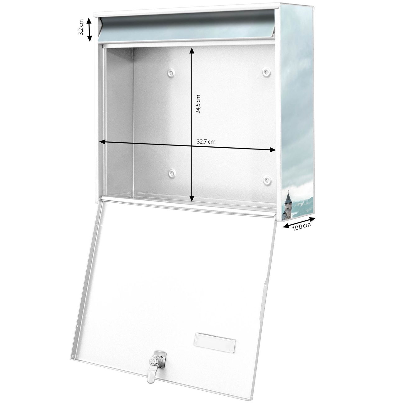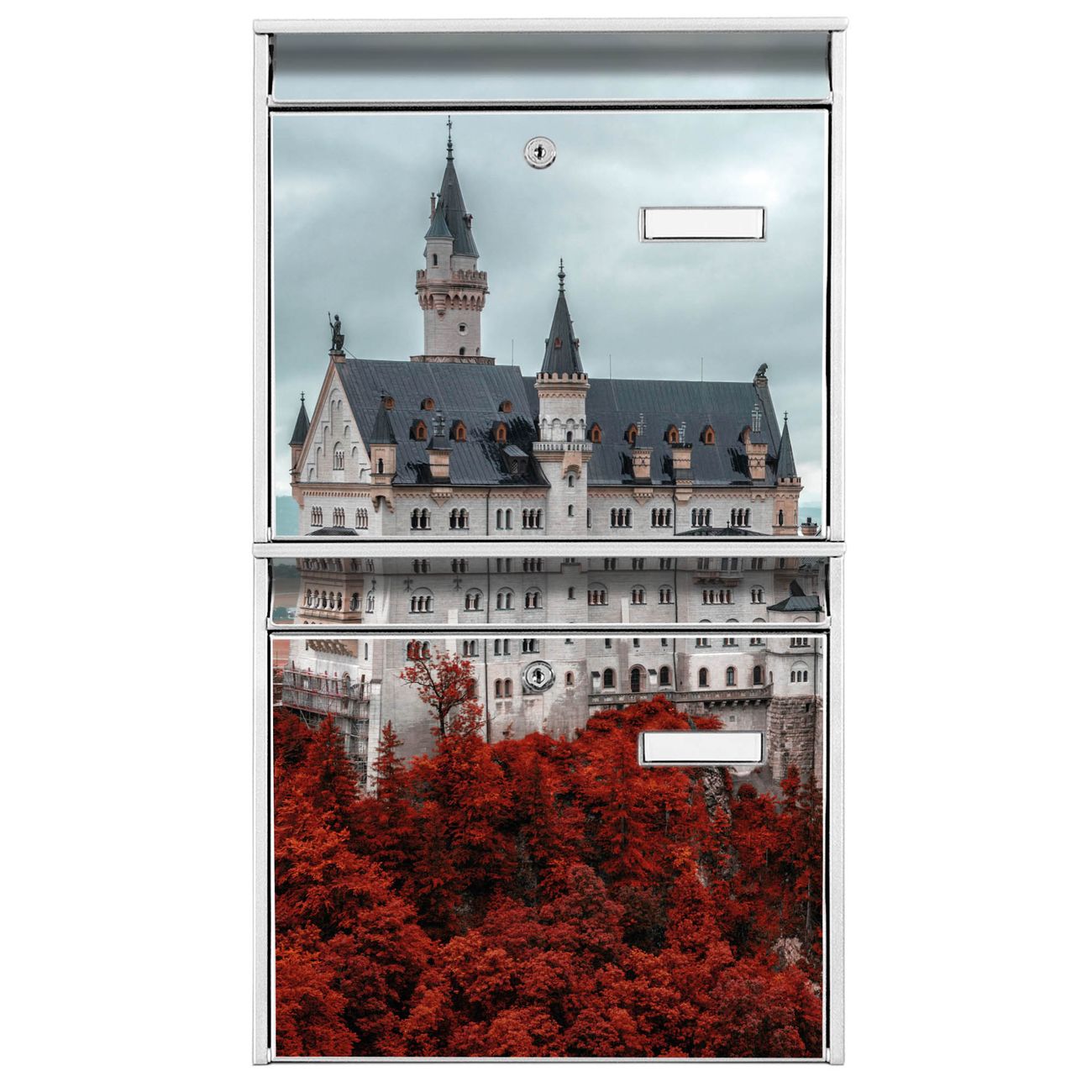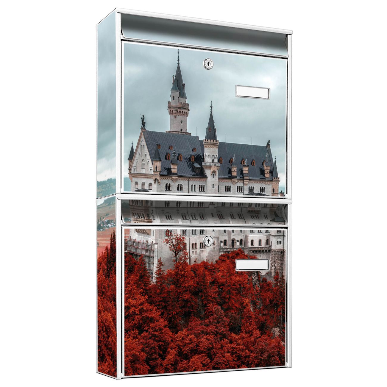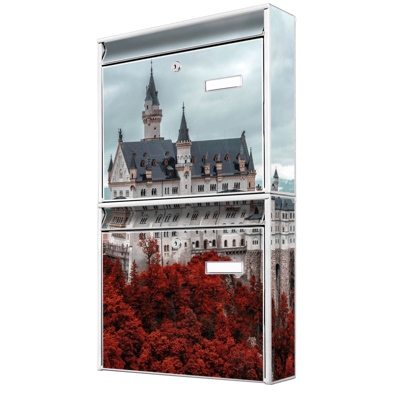 FUNKTION: Die Burg-Wächter Briefkastenanlage mit Motiv Neuschwanstein bietet Ihnen ausreichend Fassungsvermögen um auch A4 und C4 Sendungen zu empfangen. Das integrierte Namensschild lässt sich individuell beschriften. Wählen Sie aus den Grundfarben weiß, silber und schwarz. DESIGN: Die 2 Briefkästen haben ein ansprechendes und zeitloses Design, ohne dabei auf Funktionalität zu verzichten. Das Material ist sehr stabil, wetterfest und rostfrei. Durch das Motiv Neuschwanstein werden die Postkästen zu einem Blickfang. DETAILS: Die Postkästen bestehen aus verzinktem Stahl der zusätzlich mit Klarlack versiegelt wurde. Die Kästen sind gesamt 64,5cm hoch, 36,2cm breit und 10cm tief. Das Motiv besteht aus einer wetter- und UV-festen Folie, die Ihren Briefkasten zusätzlich vor Kratzern schützt. Die Postkästen werden mit Montagematerial, je einem Namensschild und je zwei Schlüsseln geliefert. NUTZEN: Das Briefkastenset eignet sich für die Wandmontage, die Größe bietet genügend Platz für Sendungen aller Art. Das zeitlose Design sowie die stabile Bauart bieten Ihnen einen treuen Begleiter für Ihre Post. BANJADO: