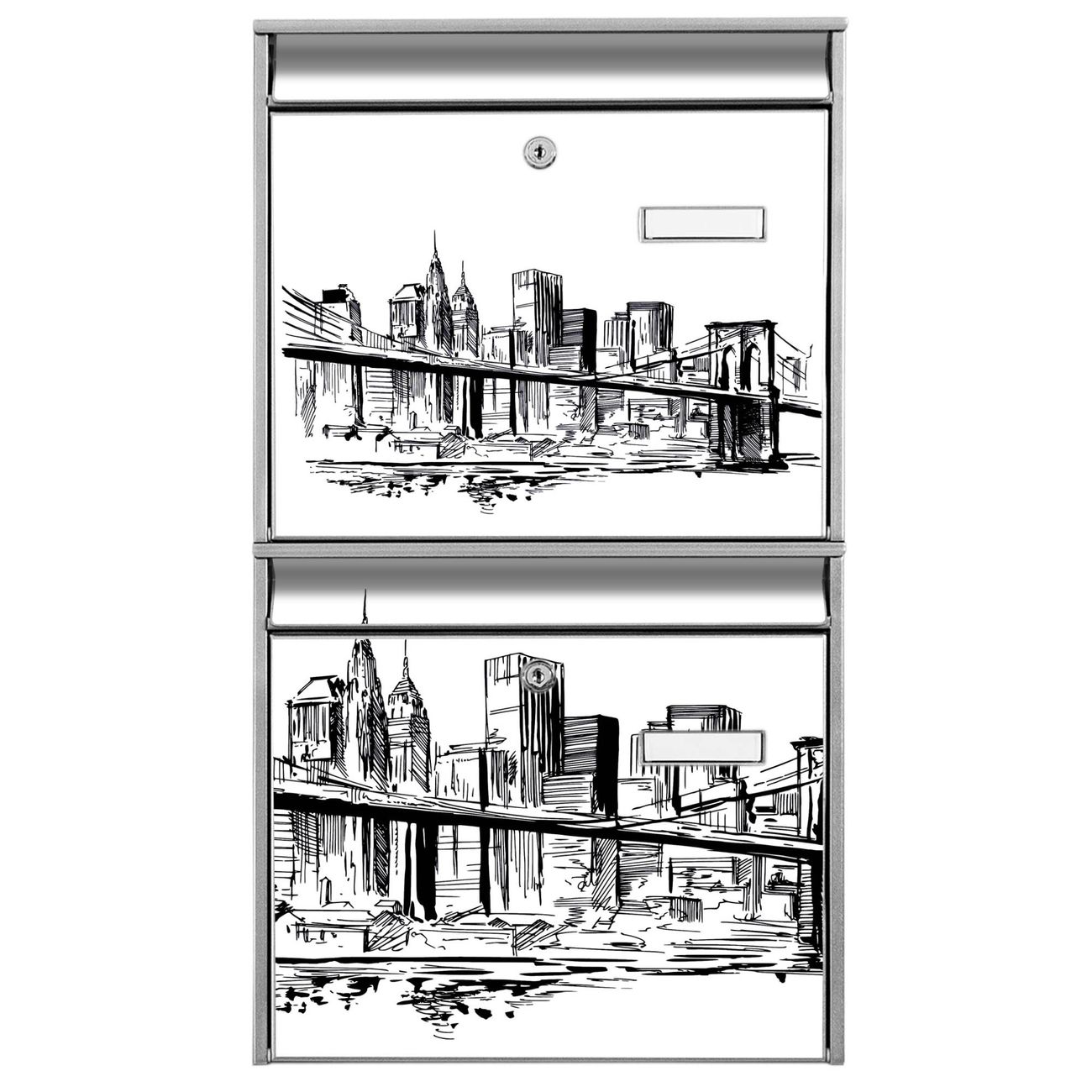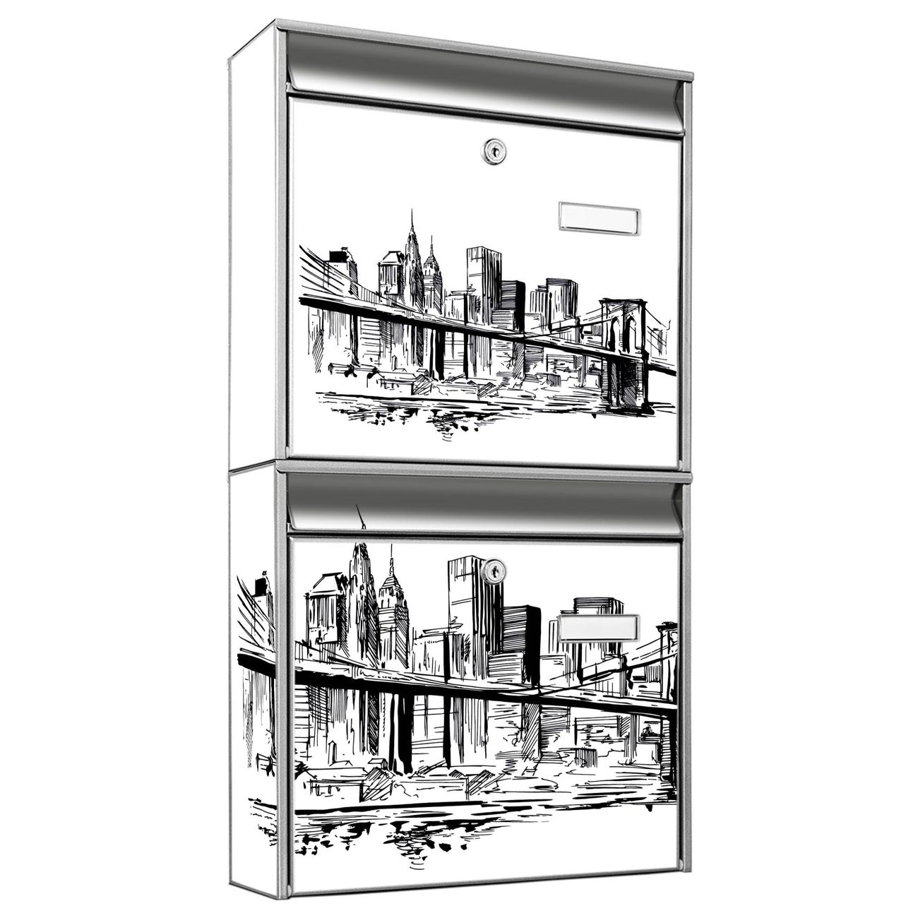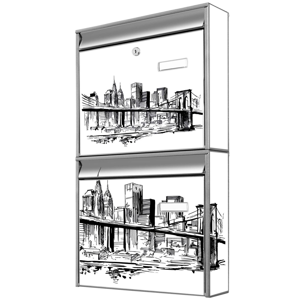 FUNKTION: Die Burg-Wächter Briefkastenanlage mit Motiv New York Skizze bietet Ihnen ausreichend Fassungsvermögen um auch A4 und C4 Sendungen zu empfangen. Das integrierte Namensschild lässt sich individuell beschriften. Wählen Sie aus den Grundfarben weiß, silber und schwarz. DESIGN: Die 2 Briefkästen haben ein ansprechendes und zeitloses Design, ohne dabei auf Funktionalität zu verzichten. Das Material ist sehr stabil, wetterfest und rostfrei. Durch das Motiv New York Skizze werden die Postkästen zu einem Blickfang. DETAILS: Die Postkästen bestehen aus verzinktem Stahl der zusätzlich mit Klarlack versiegelt wurde. Die Kästen sind gesamt 64,5cm hoch, 36,2cm breit und 10cm tief. Das Motiv besteht aus einer wetter- und UV-festen Folie, die Ihren Briefkasten zusätzlich vor Kratzern schützt. Die Postkästen werden mit Montagematerial, je einem Namensschild und je zwei Schlüsseln geliefert. NUTZEN: Das Briefkastenset eignet sich für die Wandmontage, die Größe bietet genügend Platz für Sendungen aller Art. Das zeitlose Design sowie die stabile Bauart bieten Ihnen einen treuen Begleiter für Ihre Post. BANJADO: