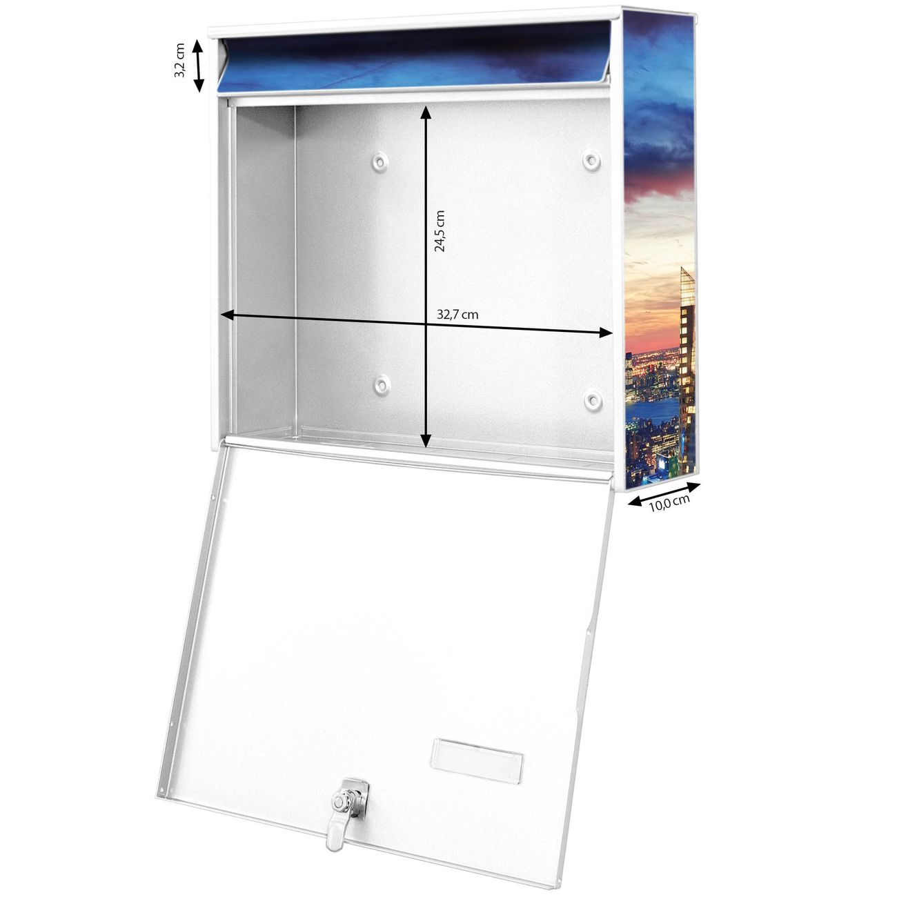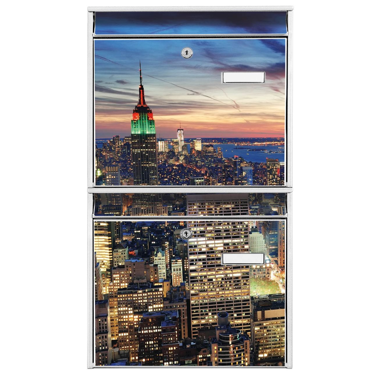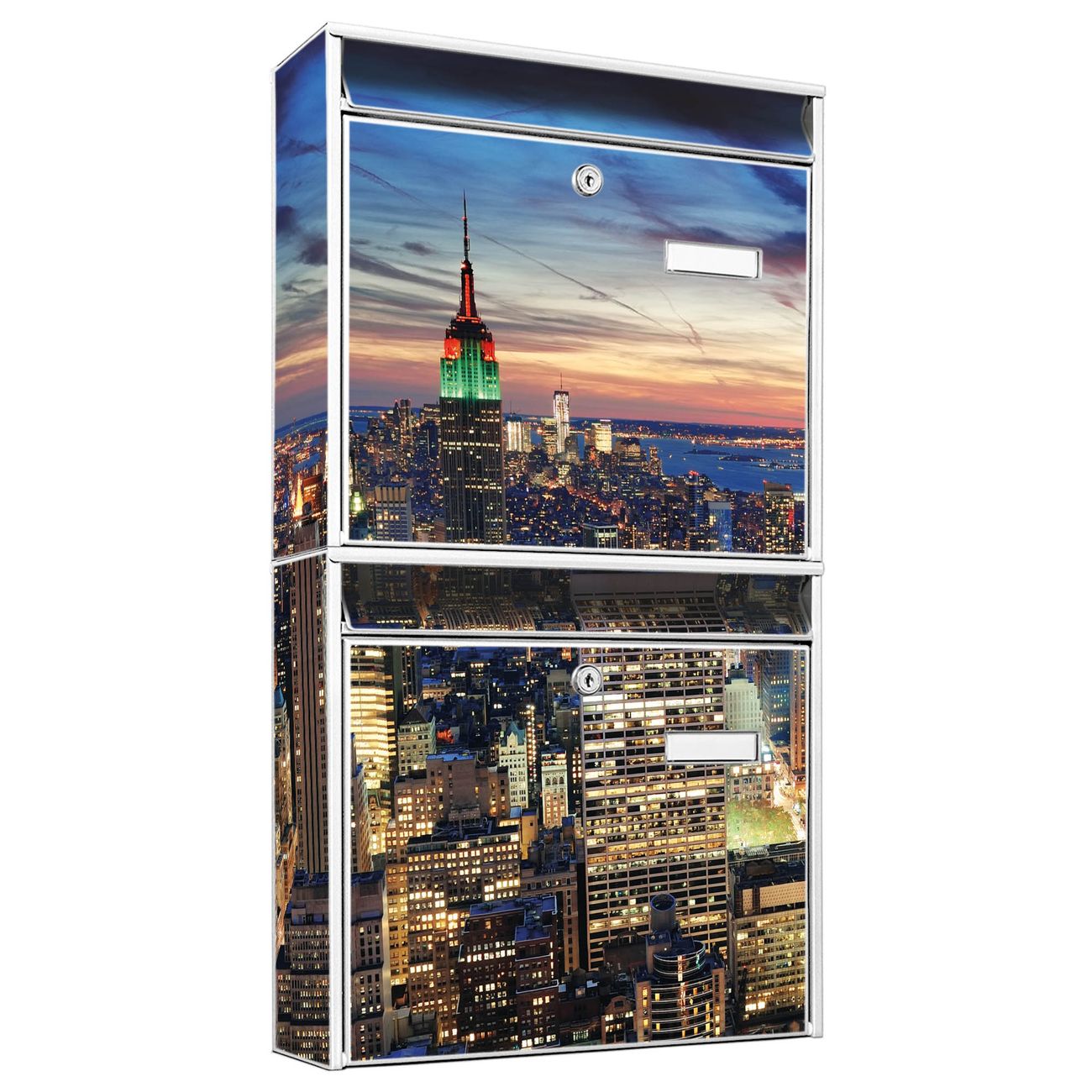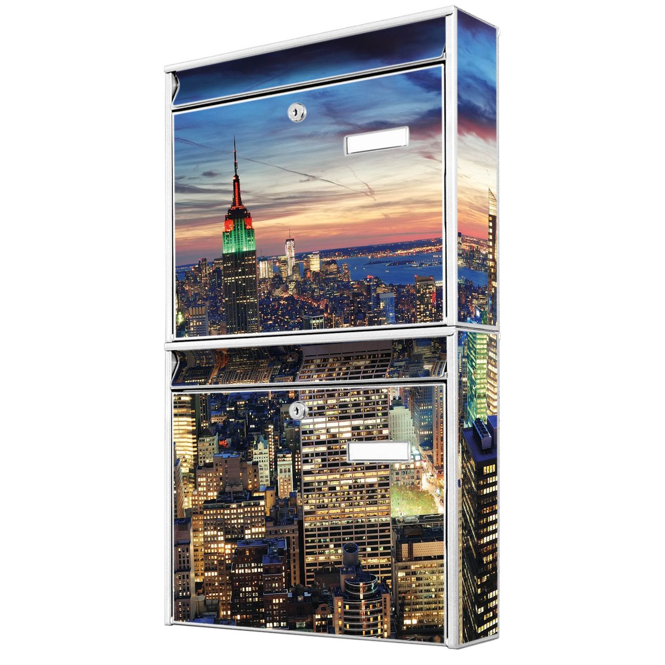 FUNKTION: Die Burg-Wächter Briefkastenanlage mit Motiv New York Sunset bietet Ihnen ausreichend Fassungsvermögen um auch A4 und C4 Sendungen zu empfangen. Das integrierte Namensschild lässt sich individuell beschriften. Wählen Sie aus den Grundfarben weiß, silber und schwarz. DESIGN: Die 2 Briefkästen haben ein ansprechendes und zeitloses Design, ohne dabei auf Funktionalität zu verzichten. Das Material ist sehr stabil, wetterfest und rostfrei. Durch das Motiv New York Sunset werden die Postkästen zu einem Blickfang. DETAILS: Die Postkästen bestehen aus verzinktem Stahl der zusätzlich mit Klarlack versiegelt wurde. Die Kästen sind gesamt 64,5cm hoch, 36,2cm breit und 10cm tief. Das Motiv besteht aus einer wetter- und UV-festen Folie, die Ihren Briefkasten zusätzlich vor Kratzern schützt. Die Postkästen werden mit Montagematerial, je einem Namensschild und je zwei Schlüsseln geliefert. NUTZEN: Das Briefkastenset eignet sich für die Wandmontage, die Größe bietet genügend Platz für Sendungen aller Art. Das zeitlose Design sowie die stabile Bauart bieten Ihnen einen treuen Begleiter für Ihre Post. BANJADO: