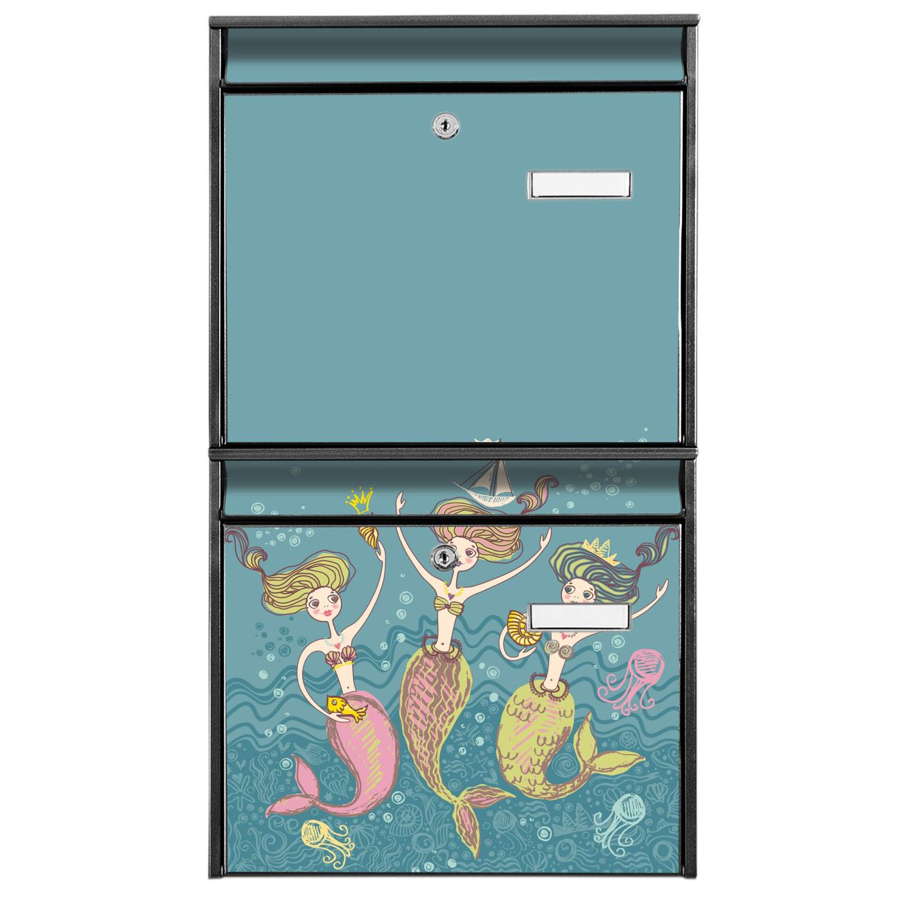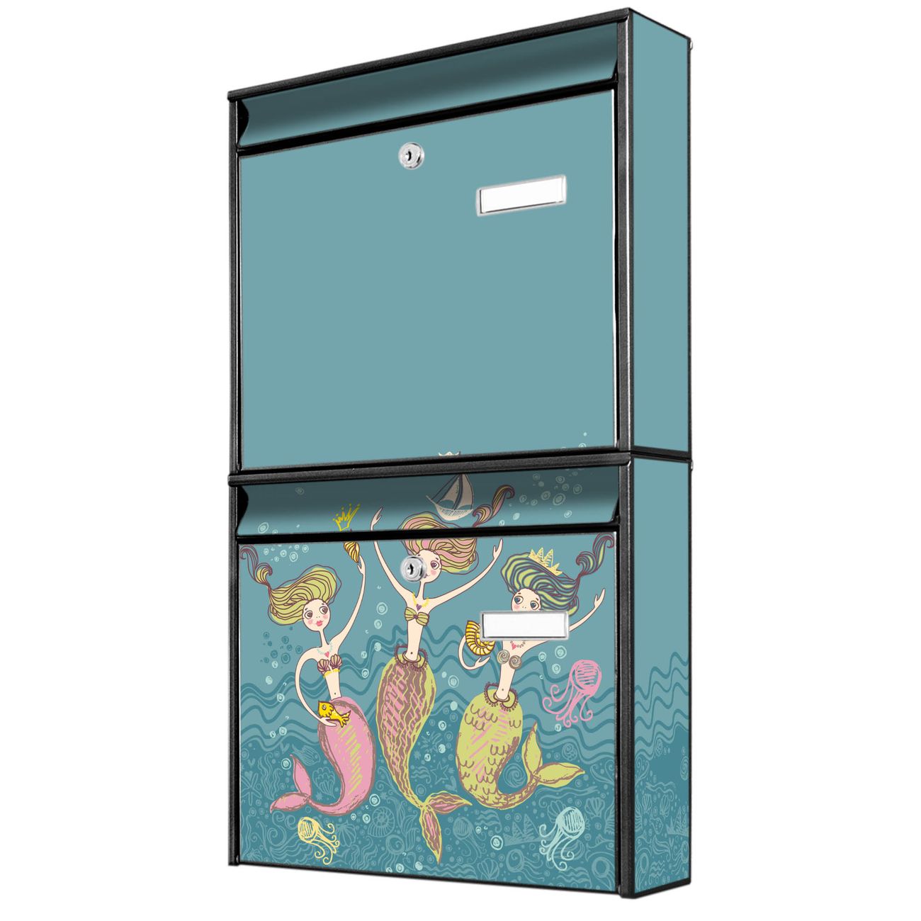 FUNKTION: Die Burg-Wächter Briefkastenanlage mit Motiv Nixen bietet Ihnen ausreichend Fassungsvermögen um auch A4 und C4 Sendungen zu empfangen. Das integrierte Namensschild lässt sich individuell beschriften. Wählen Sie aus den Grundfarben weiß, silber und schwarz. DESIGN: Die 2 Briefkästen haben ein ansprechendes und zeitloses Design, ohne dabei auf Funktionalität zu verzichten. Das Material ist sehr stabil, wetterfest und rostfrei. Durch das Motiv Nixen werden die Postkästen zu einem Blickfang. DETAILS: Die Postkästen bestehen aus verzinktem Stahl der zusätzlich mit Klarlack versiegelt wurde. Die Kästen sind gesamt 64,5cm hoch, 36,2cm breit und 10cm tief. Das Motiv besteht aus einer wetter- und UV-festen Folie, die Ihren Briefkasten zusätzlich vor Kratzern schützt. Die Postkästen werden mit Montagematerial, je einem Namensschild und je zwei Schlüsseln geliefert. NUTZEN: Das Briefkastenset eignet sich für die Wandmontage, die Größe bietet genügend Platz für Sendungen aller Art. Das zeitlose Design sowie die stabile Bauart bieten Ihnen einen treuen Begleiter für Ihre Post. BANJADO: