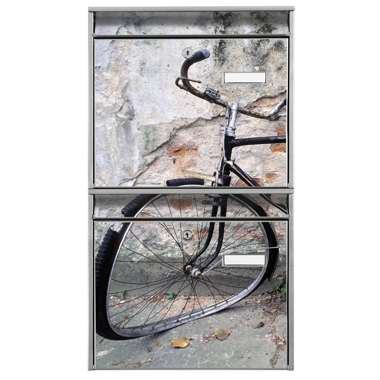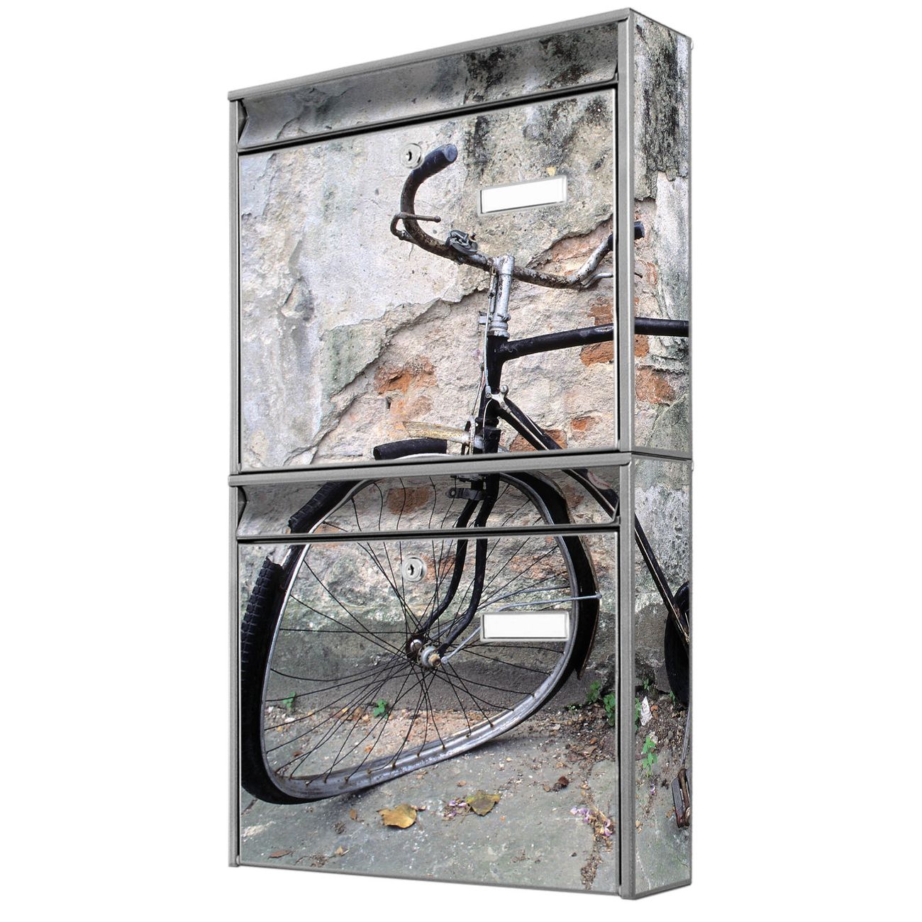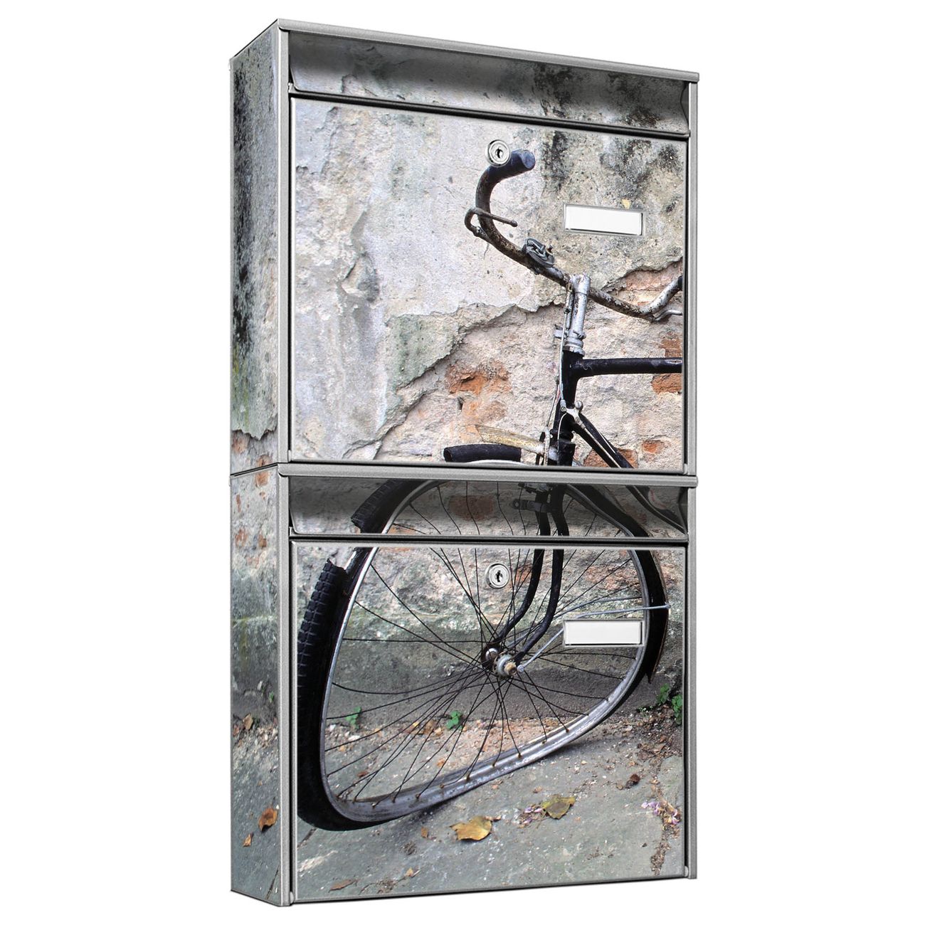 FUNKTION: Die Burg-Wächter Briefkastenanlage mit Motiv Nostalgie Rad bietet Ihnen ausreichend Fassungsvermögen um auch A4 und C4 Sendungen zu empfangen. Das integrierte Namensschild lässt sich individuell beschriften. Wählen Sie aus den Grundfarben weiß, silber und schwarz. DESIGN: Die 2 Briefkästen haben ein ansprechendes und zeitloses Design, ohne dabei auf Funktionalität zu verzichten. Das Material ist sehr stabil, wetterfest und rostfrei. Durch das Motiv Nostalgie Rad werden die Postkästen zu einem Blickfang. DETAILS: Die Postkästen bestehen aus verzinktem Stahl der zusätzlich mit Klarlack versiegelt wurde. Die Kästen sind gesamt 64,5cm hoch, 36,2cm breit und 10cm tief. Das Motiv besteht aus einer wetter- und UV-festen Folie, die Ihren Briefkasten zusätzlich vor Kratzern schützt. Die Postkästen werden mit Montagematerial, je einem Namensschild und je zwei Schlüsseln geliefert. NUTZEN: Das Briefkastenset eignet sich für die Wandmontage, die Größe bietet genügend Platz für Sendungen aller Art. Das zeitlose Design sowie die stabile Bauart bieten Ihnen einen treuen Begleiter für Ihre Post. BANJADO: