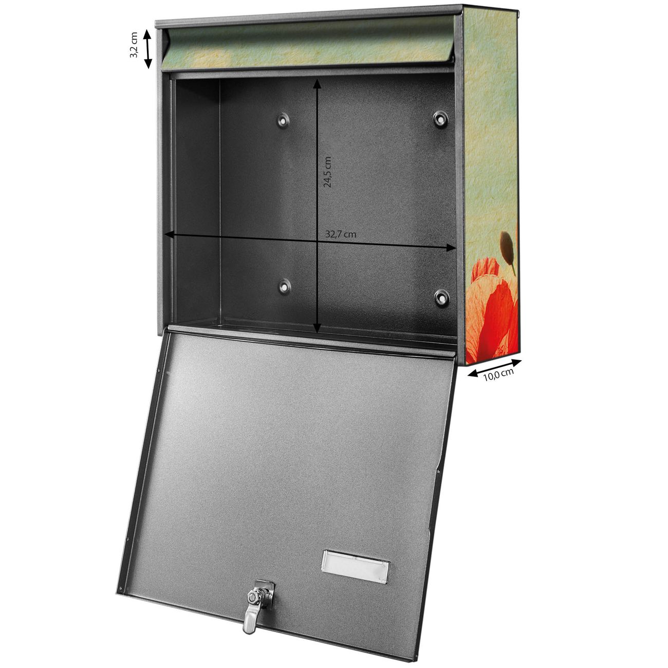 FUNKTION: Die Burg-Wächter Briefkastenanlage mit Motiv Oktobermohn bietet Ihnen ausreichend Fassungsvermögen um auch A4 und C4 Sendungen zu empfangen. Das integrierte Namensschild lässt sich individuell beschriften. Wählen Sie aus den Grundfarben weiß, silber und schwarz. DESIGN: Die 2 Briefkästen haben ein ansprechendes und zeitloses Design, ohne dabei auf Funktionalität zu verzichten. Das Material ist sehr stabil, wetterfest und rostfrei. Durch das Motiv Oktobermohn werden die Postkästen zu einem Blickfang. DETAILS: Die Postkästen bestehen aus verzinktem Stahl der zusätzlich mit Klarlack versiegelt wurde. Die Kästen sind gesamt 64,5cm hoch, 36,2cm breit und 10cm tief. Das Motiv besteht aus einer wetter- und UV-festen Folie, die Ihren Briefkasten zusätzlich vor Kratzern schützt. Die Postkästen werden mit Montagematerial, je einem Namensschild und je zwei Schlüsseln geliefert. NUTZEN: Das Briefkastenset eignet sich für die Wandmontage, die Größe bietet genügend Platz für Sendungen aller Art. Das zeitlose Design sowie die stabile Bauart bieten Ihnen einen treuen Begleiter für Ihre Post. BANJADO: