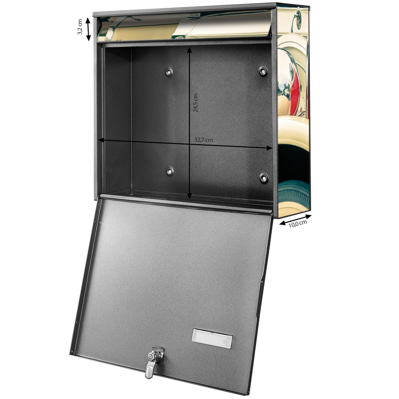 FUNKTION: Die Burg-Wächter Briefkastenanlage mit Motiv Oldtimer Räder bietet Ihnen ausreichend Fassungsvermögen um auch A4 und C4 Sendungen zu empfangen. Das integrierte Namensschild lässt sich individuell beschriften. Wählen Sie aus den Grundfarben weiß, silber und schwarz. DESIGN: Die 2 Briefkästen haben ein ansprechendes und zeitloses Design, ohne dabei auf Funktionalität zu verzichten. Das Material ist sehr stabil, wetterfest und rostfrei. Durch das Motiv Oldtimer Räder werden die Postkästen zu einem Blickfang. DETAILS: Die Postkästen bestehen aus verzinktem Stahl der zusätzlich mit Klarlack versiegelt wurde. Die Kästen sind gesamt 64,5cm hoch, 36,2cm breit und 10cm tief. Das Motiv besteht aus einer wetter- und UV-festen Folie, die Ihren Briefkasten zusätzlich vor Kratzern schützt. Die Postkästen werden mit Montagematerial, je einem Namensschild und je zwei Schlüsseln geliefert. NUTZEN: Das Briefkastenset eignet sich für die Wandmontage, die Größe bietet genügend Platz für Sendungen aller Art. Das zeitlose Design sowie die stabile Bauart bieten Ihnen einen treuen Begleiter für Ihre Post. BANJADO: