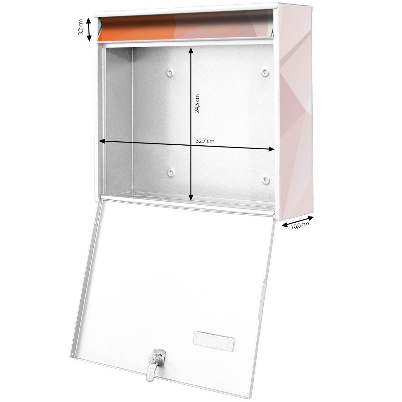 FUNKTION: Die Burg-Wächter Briefkastenanlage mit Motiv Orange Polygon bietet Ihnen ausreichend Fassungsvermögen um auch A4 und C4 Sendungen zu empfangen. Das integrierte Namensschild lässt sich individuell beschriften. Wählen Sie aus den Grundfarben weiß, silber und schwarz. DESIGN: Die 2 Briefkästen haben ein ansprechendes und zeitloses Design, ohne dabei auf Funktionalität zu verzichten. Das Material ist sehr stabil, wetterfest und rostfrei. Durch das Motiv Orange Polygon werden die Postkästen zu einem Blickfang. DETAILS: Die Postkästen bestehen aus verzinktem Stahl der zusätzlich mit Klarlack versiegelt wurde. Die Kästen sind gesamt 64,5cm hoch, 36,2cm breit und 10cm tief. Das Motiv besteht aus einer wetter- und UV-festen Folie, die Ihren Briefkasten zusätzlich vor Kratzern schützt. Die Postkästen werden mit Montagematerial, je einem Namensschild und je zwei Schlüsseln geliefert. NUTZEN: Das Briefkastenset eignet sich für die Wandmontage, die Größe bietet genügend Platz für Sendungen aller Art. Das zeitlose Design sowie die stabile Bauart bieten Ihnen einen treuen Begleiter für Ihre Post. BANJADO: