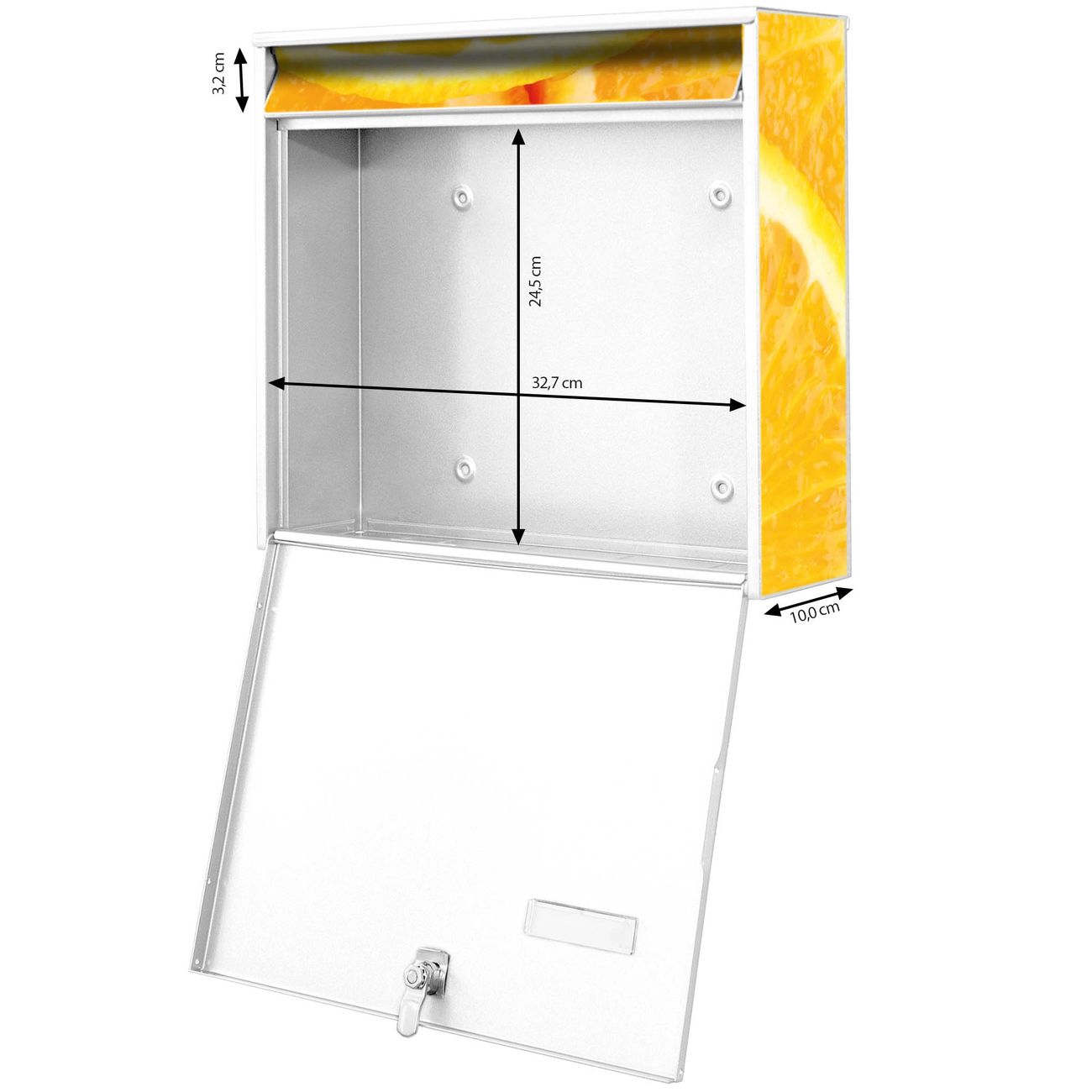 FUNKTION: Die Burg-Wächter Briefkastenanlage mit Motiv Orangenscheiben bietet Ihnen ausreichend Fassungsvermögen um auch A4 und C4 Sendungen zu empfangen. Das integrierte Namensschild lässt sich individuell beschriften. Wählen Sie aus den Grundfarben weiß, silber und schwarz. DESIGN: Die 2 Briefkästen haben ein ansprechendes und zeitloses Design, ohne dabei auf Funktionalität zu verzichten. Das Material ist sehr stabil, wetterfest und rostfrei. Durch das Motiv Orangenscheiben werden die Postkästen zu einem Blickfang. DETAILS: Die Postkästen bestehen aus verzinktem Stahl der zusätzlich mit Klarlack versiegelt wurde. Die Kästen sind gesamt 64,5cm hoch, 36,2cm breit und 10cm tief. Das Motiv besteht aus einer wetter- und UV-festen Folie, die Ihren Briefkasten zusätzlich vor Kratzern schützt. Die Postkästen werden mit Montagematerial, je einem Namensschild und je zwei Schlüsseln geliefert. NUTZEN: Das Briefkastenset eignet sich für die Wandmontage, die Größe bietet genügend Platz für Sendungen aller Art. Das zeitlose Design sowie die stabile Bauart bieten Ihnen einen treuen Begleiter für Ihre Post. BANJADO: