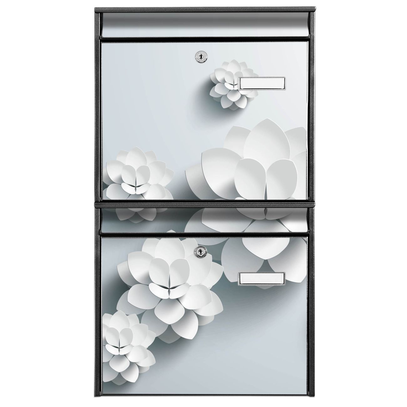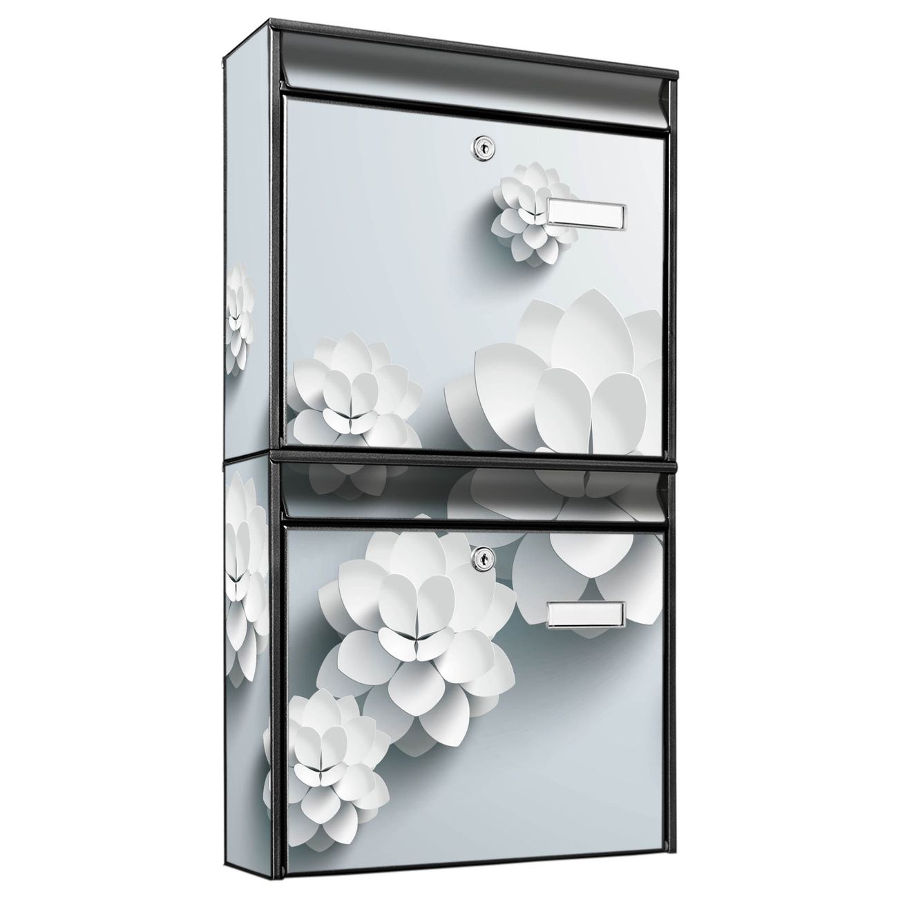 FUNKTION: Die Burg-Wächter Briefkastenanlage mit Motiv Papier Lotus bietet Ihnen ausreichend Fassungsvermögen um auch A4 und C4 Sendungen zu empfangen. Das integrierte Namensschild lässt sich individuell beschriften. Wählen Sie aus den Grundfarben weiß, silber und schwarz. DESIGN: Die 2 Briefkästen haben ein ansprechendes und zeitloses Design, ohne dabei auf Funktionalität zu verzichten. Das Material ist sehr stabil, wetterfest und rostfrei. Durch das Motiv Papier Lotus werden die Postkästen zu einem Blickfang. DETAILS: Die Postkästen bestehen aus verzinktem Stahl der zusätzlich mit Klarlack versiegelt wurde. Die Kästen sind gesamt 64,5cm hoch, 36,2cm breit und 10cm tief. Das Motiv besteht aus einer wetter- und UV-festen Folie, die Ihren Briefkasten zusätzlich vor Kratzern schützt. Die Postkästen werden mit Montagematerial, je einem Namensschild und je zwei Schlüsseln geliefert. NUTZEN: Das Briefkastenset eignet sich für die Wandmontage, die Größe bietet genügend Platz für Sendungen aller Art. Das zeitlose Design sowie die stabile Bauart bieten Ihnen einen treuen Begleiter für Ihre Post. BANJADO: