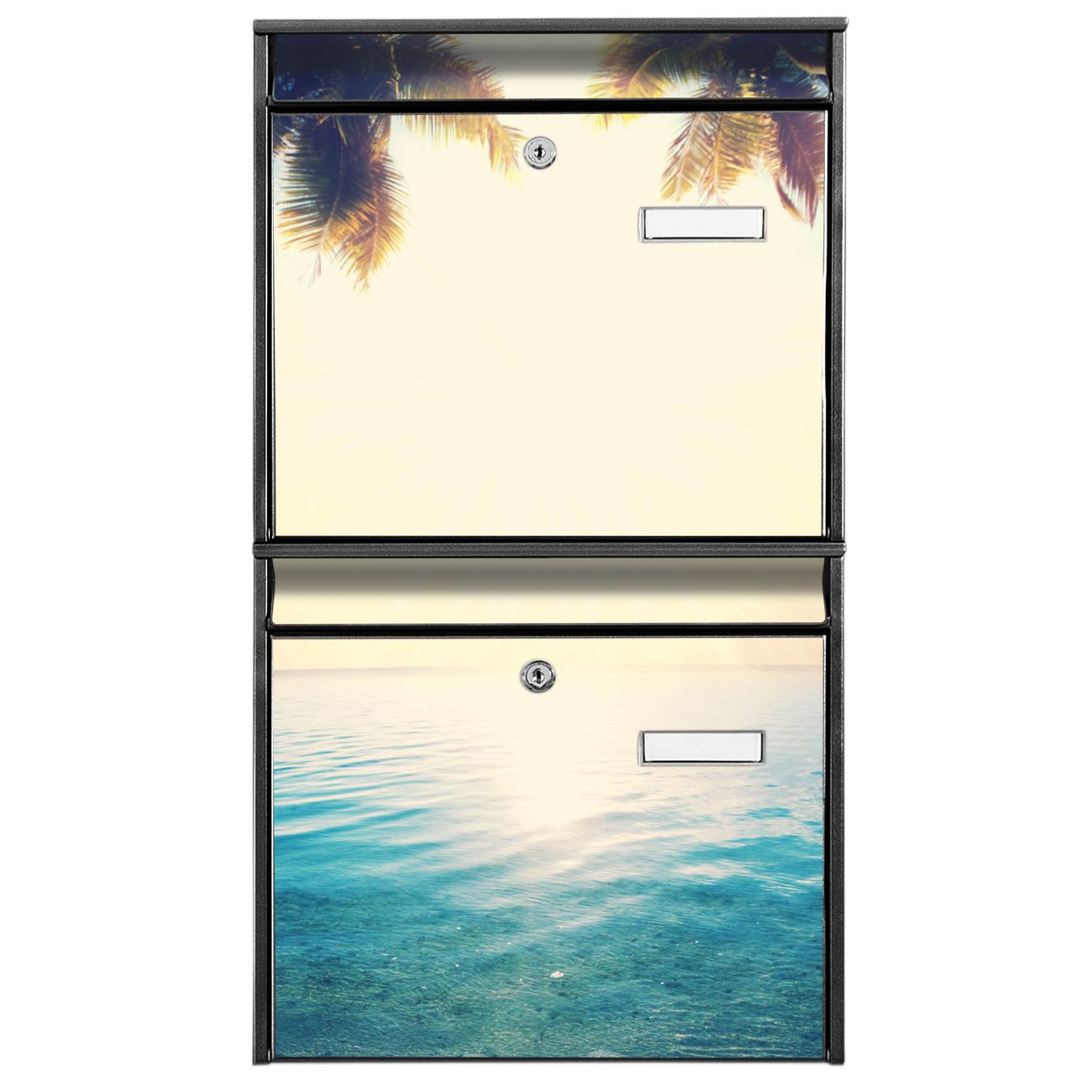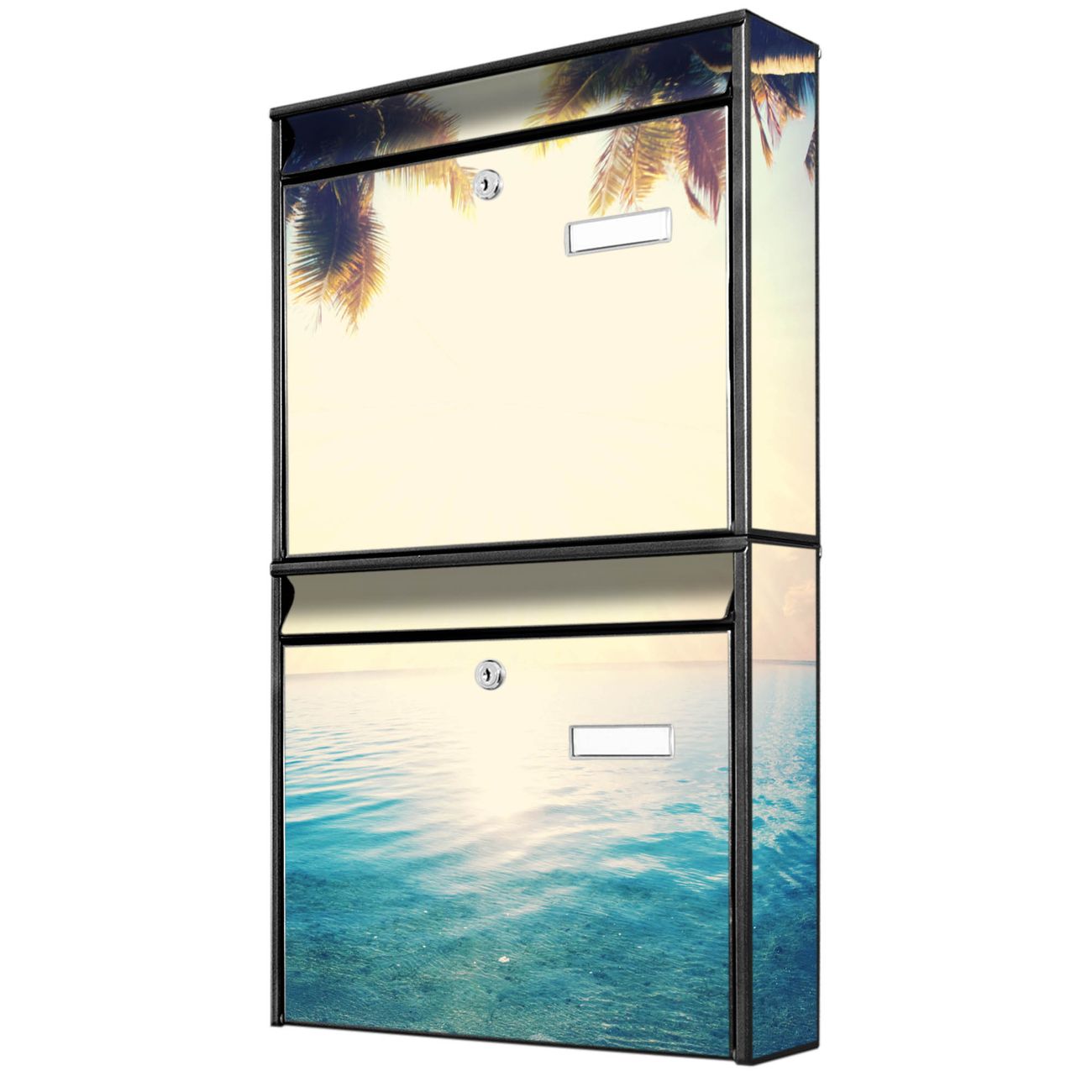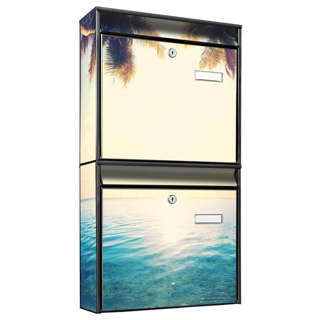 FUNKTION: Die Burg-Wächter Briefkastenanlage mit Motiv Paradis bietet Ihnen ausreichend Fassungsvermögen um auch A4 und C4 Sendungen zu empfangen. Das integrierte Namensschild lässt sich individuell beschriften. Wählen Sie aus den Grundfarben weiß, silber und schwarz. DESIGN: Die 2 Briefkästen haben ein ansprechendes und zeitloses Design, ohne dabei auf Funktionalität zu verzichten. Das Material ist sehr stabil, wetterfest und rostfrei. Durch das Motiv Paradis werden die Postkästen zu einem Blickfang. DETAILS: Die Postkästen bestehen aus verzinktem Stahl der zusätzlich mit Klarlack versiegelt wurde. Die Kästen sind gesamt 64,5cm hoch, 36,2cm breit und 10cm tief. Das Motiv besteht aus einer wetter- und UV-festen Folie, die Ihren Briefkasten zusätzlich vor Kratzern schützt. Die Postkästen werden mit Montagematerial, je einem Namensschild und je zwei Schlüsseln geliefert. NUTZEN: Das Briefkastenset eignet sich für die Wandmontage, die Größe bietet genügend Platz für Sendungen aller Art. Das zeitlose Design sowie die stabile Bauart bieten Ihnen einen treuen Begleiter für Ihre Post. BANJADO: