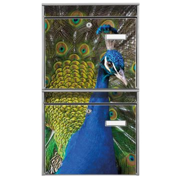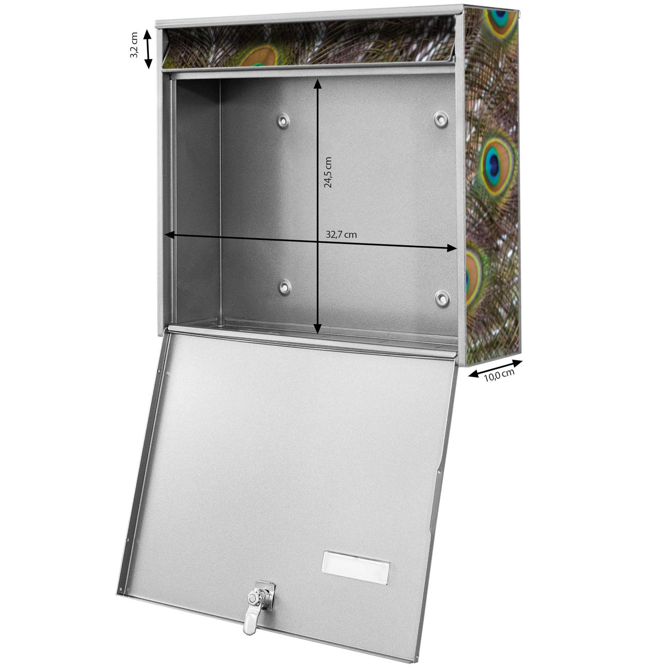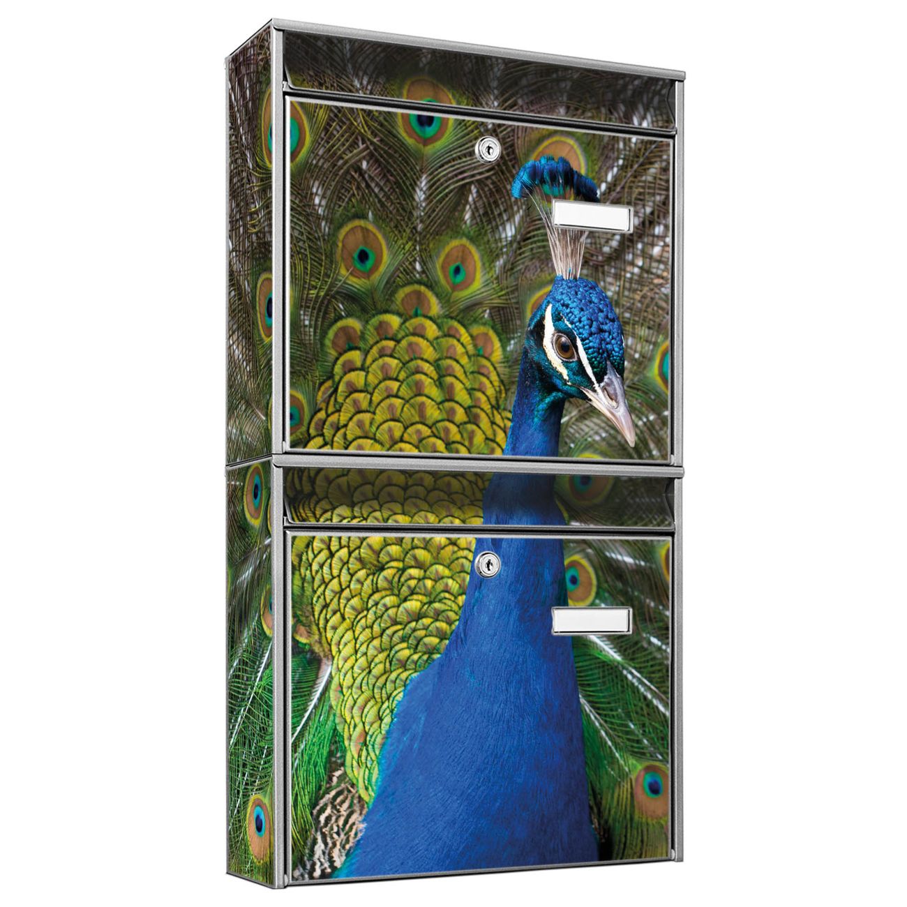 FUNKTION: Die Burg-Wächter Briefkastenanlage mit Motiv Pfau bietet Ihnen ausreichend Fassungsvermögen um auch A4 und C4 Sendungen zu empfangen. Das integrierte Namensschild lässt sich individuell beschriften. Wählen Sie aus den Grundfarben weiß, silber und schwarz. DESIGN: Die 2 Briefkästen haben ein ansprechendes und zeitloses Design, ohne dabei auf Funktionalität zu verzichten. Das Material ist sehr stabil, wetterfest und rostfrei. Durch das Motiv Pfau werden die Postkästen zu einem Blickfang. DETAILS: Die Postkästen bestehen aus verzinktem Stahl der zusätzlich mit Klarlack versiegelt wurde. Die Kästen sind gesamt 64,5cm hoch, 36,2cm breit und 10cm tief. Das Motiv besteht aus einer wetter- und UV-festen Folie, die Ihren Briefkasten zusätzlich vor Kratzern schützt. Die Postkästen werden mit Montagematerial, je einem Namensschild und je zwei Schlüsseln geliefert. NUTZEN: Das Briefkastenset eignet sich für die Wandmontage, die Größe bietet genügend Platz für Sendungen aller Art. Das zeitlose Design sowie die stabile Bauart bieten Ihnen einen treuen Begleiter für Ihre Post. BANJADO: