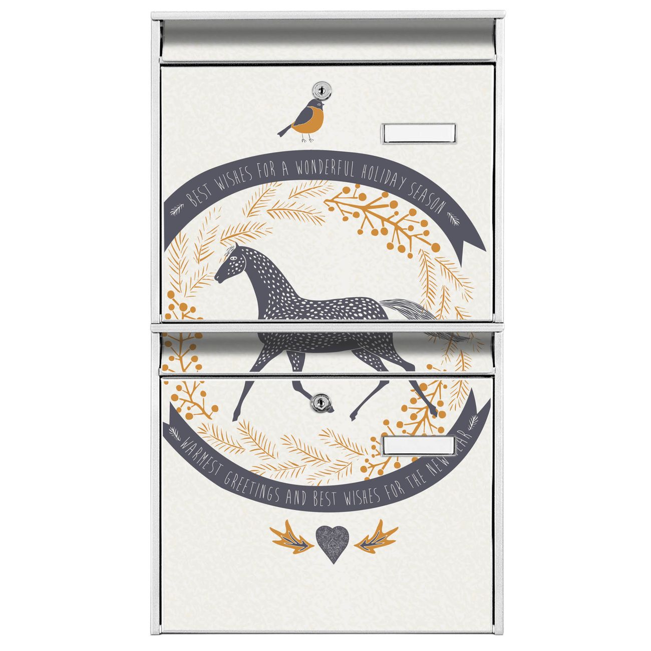 FUNKTION: Die Burg-Wächter Briefkastenanlage mit Motiv Pferd und Vogel bietet Ihnen ausreichend Fassungsvermögen um auch A4 und C4 Sendungen zu empfangen. Das integrierte Namensschild lässt sich individuell beschriften. Wählen Sie aus den Grundfarben weiß, silber und schwarz. DESIGN: Die 2 Briefkästen haben ein ansprechendes und zeitloses Design, ohne dabei auf Funktionalität zu verzichten. Das Material ist sehr stabil, wetterfest und rostfrei. Durch das Motiv Pferd und Vogel werden die Postkästen zu einem Blickfang. DETAILS: Die Postkästen bestehen aus verzinktem Stahl der zusätzlich mit Klarlack versiegelt wurde. Die Kästen sind gesamt 64,5cm hoch, 36,2cm breit und 10cm tief. Das Motiv besteht aus einer wetter- und UV-festen Folie, die Ihren Briefkasten zusätzlich vor Kratzern schützt. Die Postkästen werden mit Montagematerial, je einem Namensschild und je zwei Schlüsseln geliefert. NUTZEN: Das Briefkastenset eignet sich für die Wandmontage, die Größe bietet genügend Platz für Sendungen aller Art. Das zeitlose Design sowie die stabile Bauart bieten Ihnen einen treuen Begleiter für Ihre Post. BANJADO: