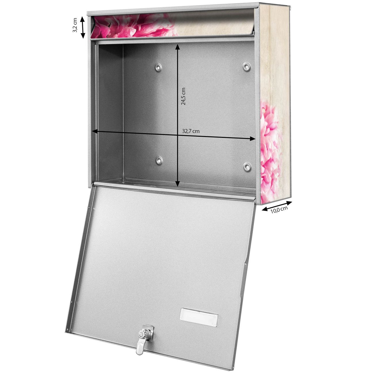 FUNKTION: Die Burg-Wächter Briefkastenanlage mit Motiv Pfingstrose bietet Ihnen ausreichend Fassungsvermögen um auch A4 und C4 Sendungen zu empfangen. Das integrierte Namensschild lässt sich individuell beschriften. Wählen Sie aus den Grundfarben weiß, silber und schwarz. DESIGN: Die 2 Briefkästen haben ein ansprechendes und zeitloses Design, ohne dabei auf Funktionalität zu verzichten. Das Material ist sehr stabil, wetterfest und rostfrei. Durch das Motiv Pfingstrose werden die Postkästen zu einem Blickfang. DETAILS: Die Postkästen bestehen aus verzinktem Stahl der zusätzlich mit Klarlack versiegelt wurde. Die Kästen sind gesamt 64,5cm hoch, 36,2cm breit und 10cm tief. Das Motiv besteht aus einer wetter- und UV-festen Folie, die Ihren Briefkasten zusätzlich vor Kratzern schützt. Die Postkästen werden mit Montagematerial, je einem Namensschild und je zwei Schlüsseln geliefert. NUTZEN: Das Briefkastenset eignet sich für die Wandmontage, die Größe bietet genügend Platz für Sendungen aller Art. Das zeitlose Design sowie die stabile Bauart bieten Ihnen einen treuen Begleiter für Ihre Post. BANJADO:
