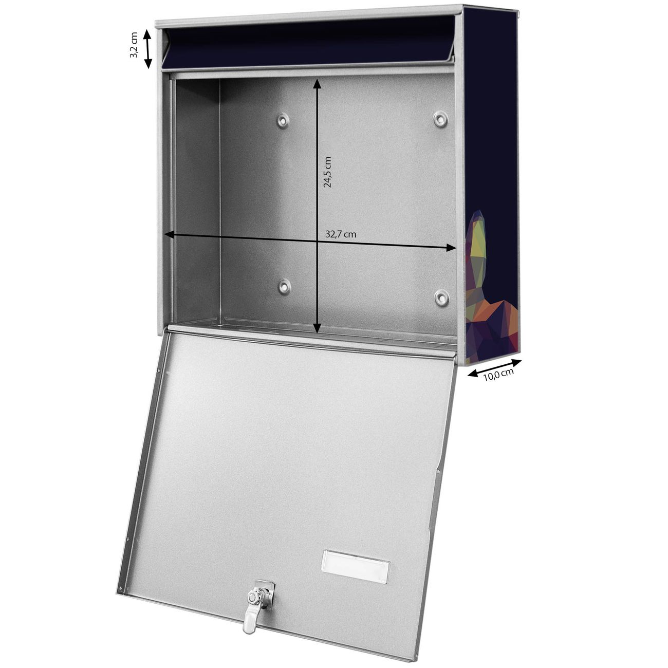 FUNKTION: Die Burg-Wächter Briefkastenanlage mit Motiv Polygon Tiger bietet Ihnen ausreichend Fassungsvermögen um auch A4 und C4 Sendungen zu empfangen. Das integrierte Namensschild lässt sich individuell beschriften. Wählen Sie aus den Grundfarben weiß, silber und schwarz. DESIGN: Die 2 Briefkästen haben ein ansprechendes und zeitloses Design, ohne dabei auf Funktionalität zu verzichten. Das Material ist sehr stabil, wetterfest und rostfrei. Durch das Motiv Polygon Tiger werden die Postkästen zu einem Blickfang. DETAILS: Die Postkästen bestehen aus verzinktem Stahl der zusätzlich mit Klarlack versiegelt wurde. Die Kästen sind gesamt 64,5cm hoch, 36,2cm breit und 10cm tief. Das Motiv besteht aus einer wetter- und UV-festen Folie, die Ihren Briefkasten zusätzlich vor Kratzern schützt. Die Postkästen werden mit Montagematerial, je einem Namensschild und je zwei Schlüsseln geliefert. NUTZEN: Das Briefkastenset eignet sich für die Wandmontage, die Größe bietet genügend Platz für Sendungen aller Art. Das zeitlose Design sowie die stabile Bauart bieten Ihnen einen treuen Begleiter für Ihre Post. BANJADO: