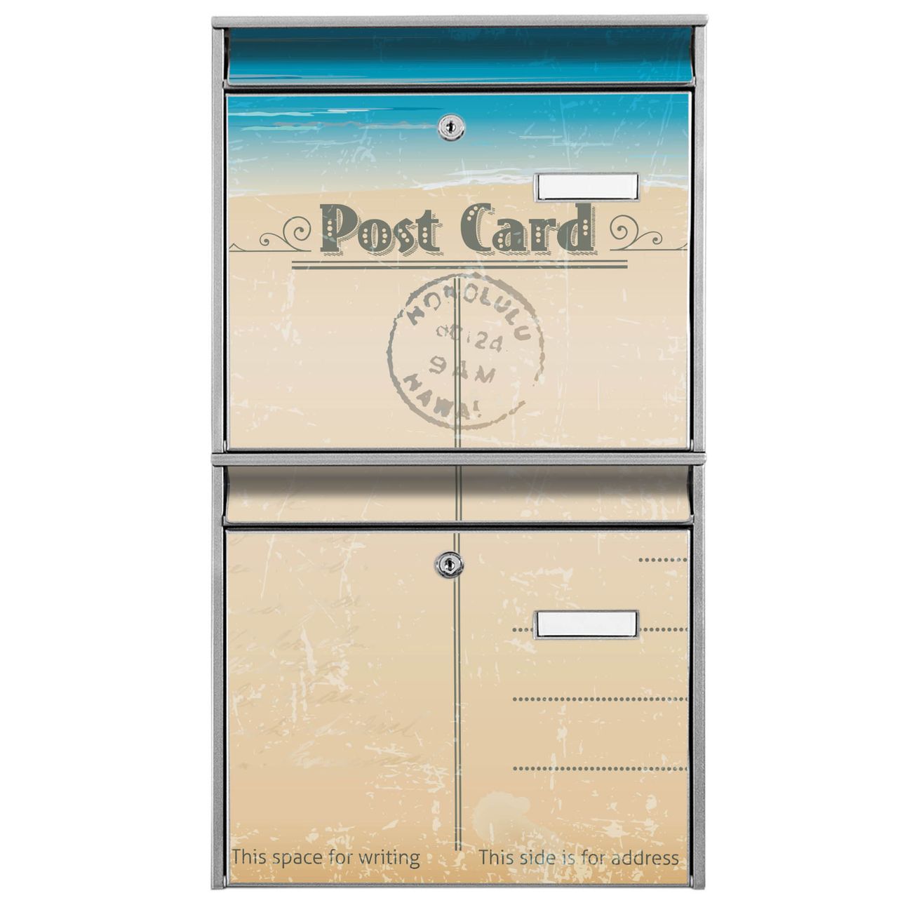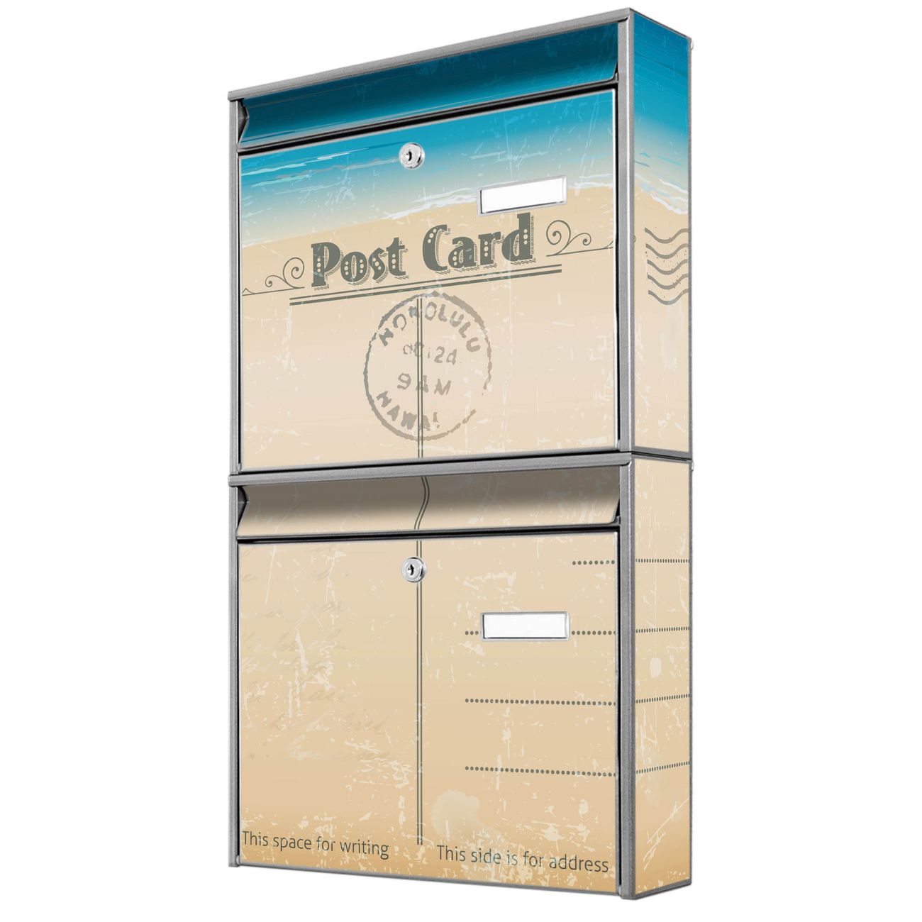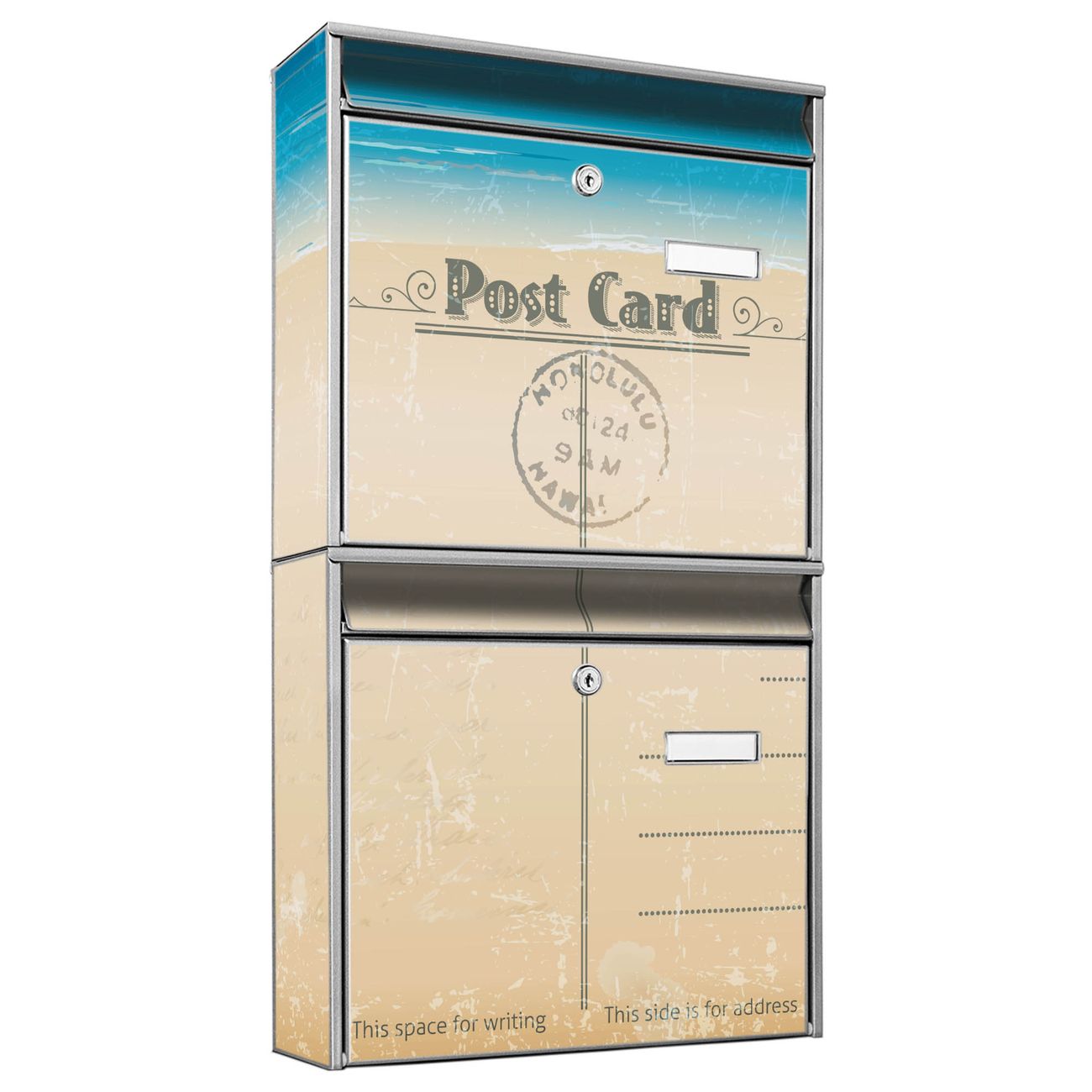 FUNKTION: Die Burg-Wächter Briefkastenanlage mit Motiv Postkarte bietet Ihnen ausreichend Fassungsvermögen um auch A4 und C4 Sendungen zu empfangen. Das integrierte Namensschild lässt sich individuell beschriften. Wählen Sie aus den Grundfarben weiß, silber und schwarz. DESIGN: Die 2 Briefkästen haben ein ansprechendes und zeitloses Design, ohne dabei auf Funktionalität zu verzichten. Das Material ist sehr stabil, wetterfest und rostfrei. Durch das Motiv Postkarte werden die Postkästen zu einem Blickfang. DETAILS: Die Postkästen bestehen aus verzinktem Stahl der zusätzlich mit Klarlack versiegelt wurde. Die Kästen sind gesamt 64,5cm hoch, 36,2cm breit und 10cm tief. Das Motiv besteht aus einer wetter- und UV-festen Folie, die Ihren Briefkasten zusätzlich vor Kratzern schützt. Die Postkästen werden mit Montagematerial, je einem Namensschild und je zwei Schlüsseln geliefert. NUTZEN: Das Briefkastenset eignet sich für die Wandmontage, die Größe bietet genügend Platz für Sendungen aller Art. Das zeitlose Design sowie die stabile Bauart bieten Ihnen einen treuen Begleiter für Ihre Post. BANJADO: