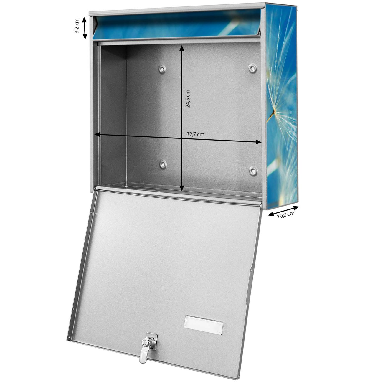 FUNKTION: Die Burg-Wächter Briefkastenanlage mit Motiv Pusteblume Detail bietet Ihnen ausreichend Fassungsvermögen um auch A4 und C4 Sendungen zu empfangen. Das integrierte Namensschild lässt sich individuell beschriften. Wählen Sie aus den Grundfarben weiß, silber und schwarz. DESIGN: Die 2 Briefkästen haben ein ansprechendes und zeitloses Design, ohne dabei auf Funktionalität zu verzichten. Das Material ist sehr stabil, wetterfest und rostfrei. Durch das Motiv Pusteblume Detail werden die Postkästen zu einem Blickfang. DETAILS: Die Postkästen bestehen aus verzinktem Stahl der zusätzlich mit Klarlack versiegelt wurde. Die Kästen sind gesamt 64,5cm hoch, 36,2cm breit und 10cm tief. Das Motiv besteht aus einer wetter- und UV-festen Folie, die Ihren Briefkasten zusätzlich vor Kratzern schützt. Die Postkästen werden mit Montagematerial, je einem Namensschild und je zwei Schlüsseln geliefert. NUTZEN: Das Briefkastenset eignet sich für die Wandmontage, die Größe bietet genügend Platz für Sendungen aller Art. Das zeitlose Design sowie die stabile Bauart bieten Ihnen einen treuen Begleiter für Ihre Post. BANJADO: