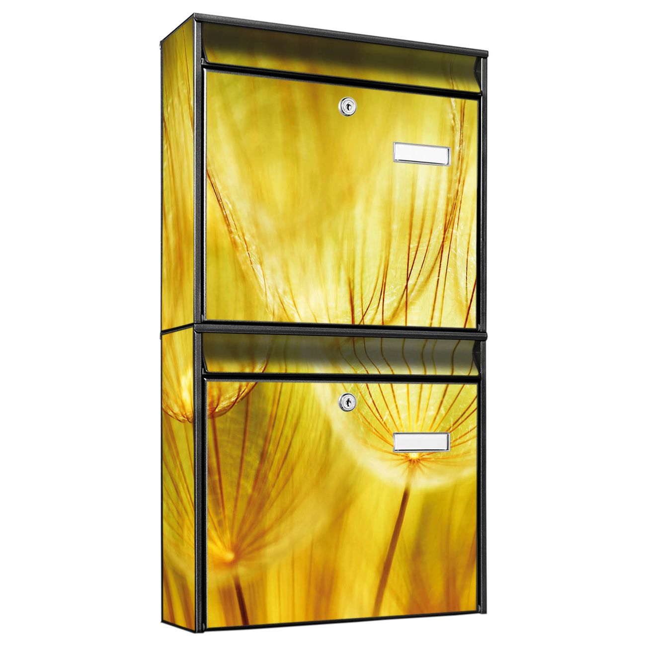 FUNKTION: Die Burg-Wächter Briefkastenanlage mit Motiv Pusteblumen Gold bietet Ihnen ausreichend Fassungsvermögen um auch A4 und C4 Sendungen zu empfangen. Das integrierte Namensschild lässt sich individuell beschriften. Wählen Sie aus den Grundfarben weiß, silber und schwarz. DESIGN: Die 2 Briefkästen haben ein ansprechendes und zeitloses Design, ohne dabei auf Funktionalität zu verzichten. Das Material ist sehr stabil, wetterfest und rostfrei. Durch das Motiv Pusteblumen Gold werden die Postkästen zu einem Blickfang. DETAILS: Die Postkästen bestehen aus verzinktem Stahl der zusätzlich mit Klarlack versiegelt wurde. Die Kästen sind gesamt 64,5cm hoch, 36,2cm breit und 10cm tief. Das Motiv besteht aus einer wetter- und UV-festen Folie, die Ihren Briefkasten zusätzlich vor Kratzern schützt. Die Postkästen werden mit Montagematerial, je einem Namensschild und je zwei Schlüsseln geliefert. NUTZEN: Das Briefkastenset eignet sich für die Wandmontage, die Größe bietet genügend Platz für Sendungen aller Art. Das zeitlose Design sowie die stabile Bauart bieten Ihnen einen treuen Begleiter für Ihre Post. BANJADO: