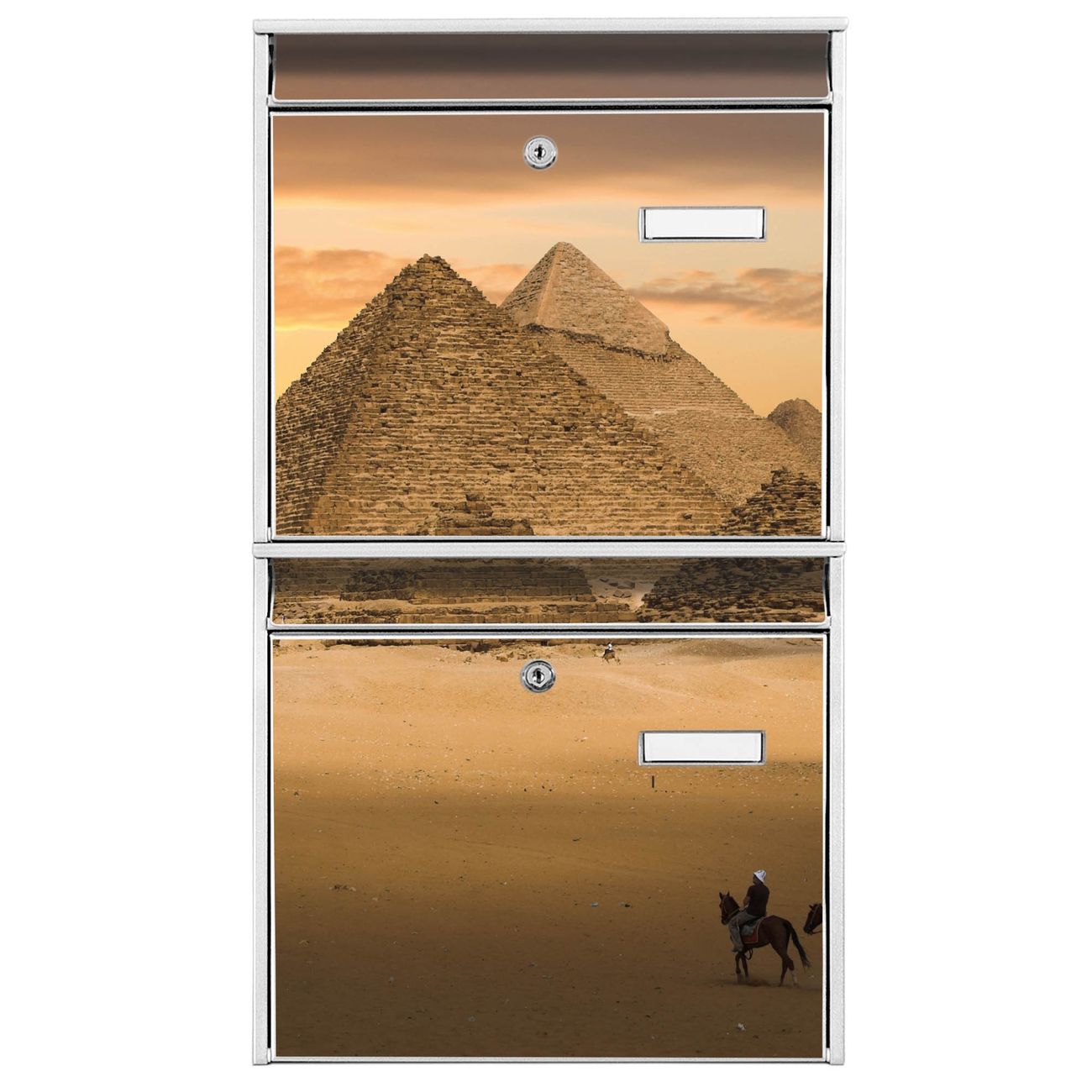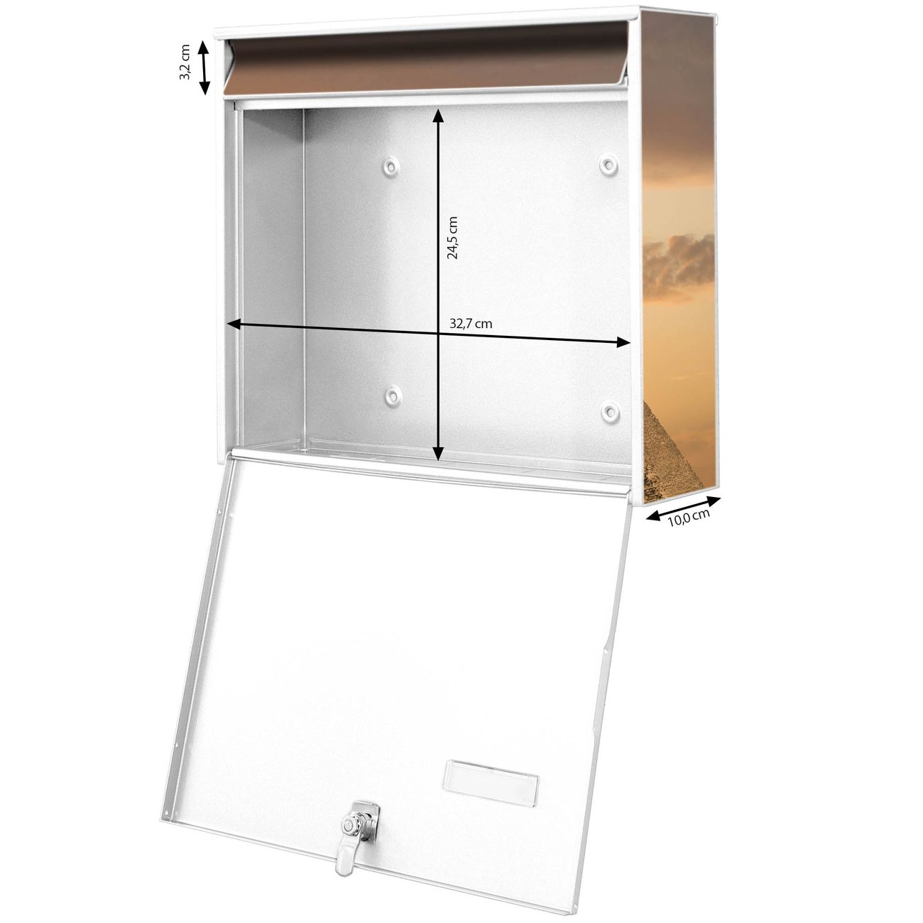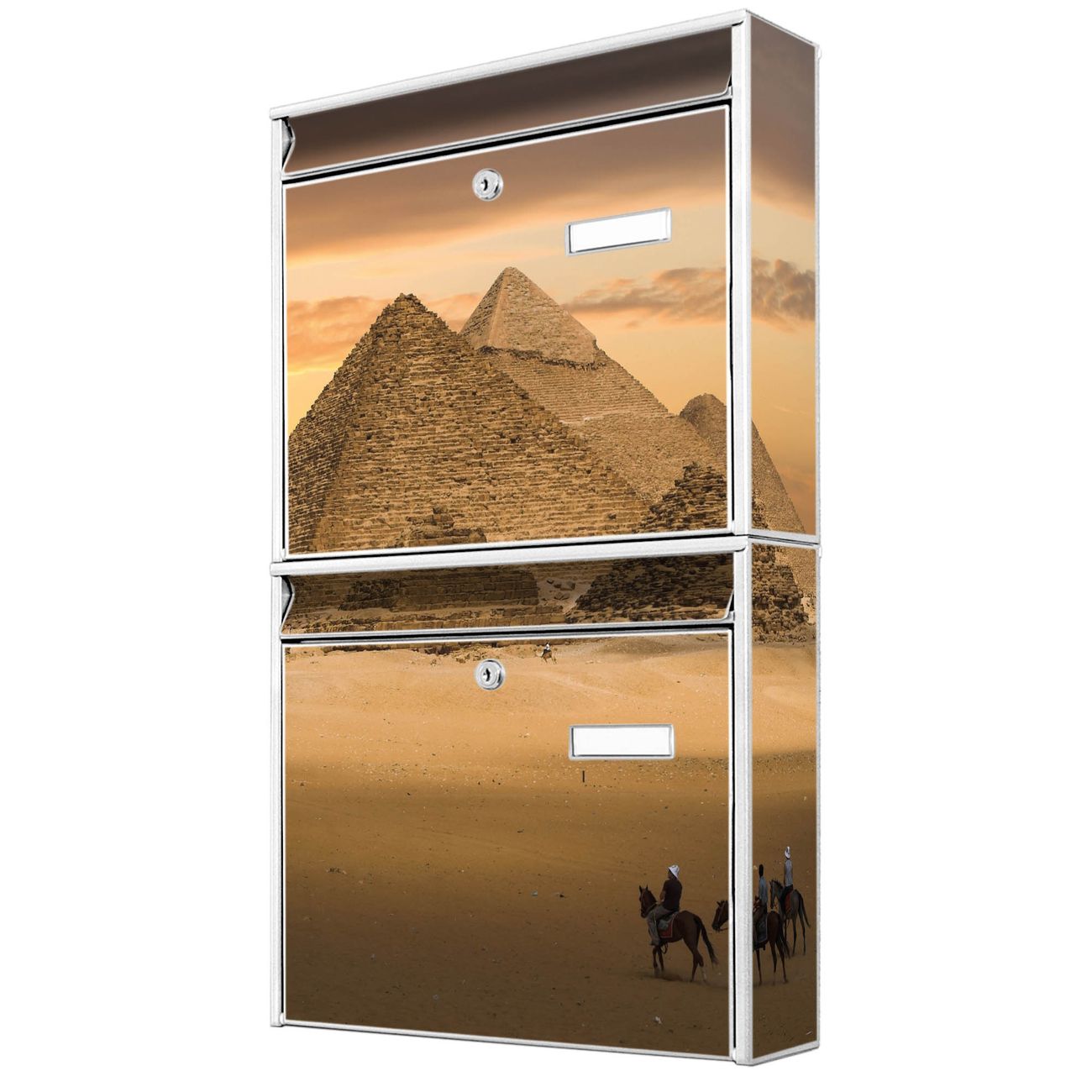 FUNKTION: Die Burg-Wächter Briefkastenanlage mit Motiv Pyramiden bietet Ihnen ausreichend Fassungsvermögen um auch A4 und C4 Sendungen zu empfangen. Das integrierte Namensschild lässt sich individuell beschriften. Wählen Sie aus den Grundfarben weiß, silber und schwarz. DESIGN: Die 2 Briefkästen haben ein ansprechendes und zeitloses Design, ohne dabei auf Funktionalität zu verzichten. Das Material ist sehr stabil, wetterfest und rostfrei. Durch das Motiv Pyramiden werden die Postkästen zu einem Blickfang. DETAILS: Die Postkästen bestehen aus verzinktem Stahl der zusätzlich mit Klarlack versiegelt wurde. Die Kästen sind gesamt 64,5cm hoch, 36,2cm breit und 10cm tief. Das Motiv besteht aus einer wetter- und UV-festen Folie, die Ihren Briefkasten zusätzlich vor Kratzern schützt. Die Postkästen werden mit Montagematerial, je einem Namensschild und je zwei Schlüsseln geliefert. NUTZEN: Das Briefkastenset eignet sich für die Wandmontage, die Größe bietet genügend Platz für Sendungen aller Art. Das zeitlose Design sowie die stabile Bauart bieten Ihnen einen treuen Begleiter für Ihre Post. BANJADO: