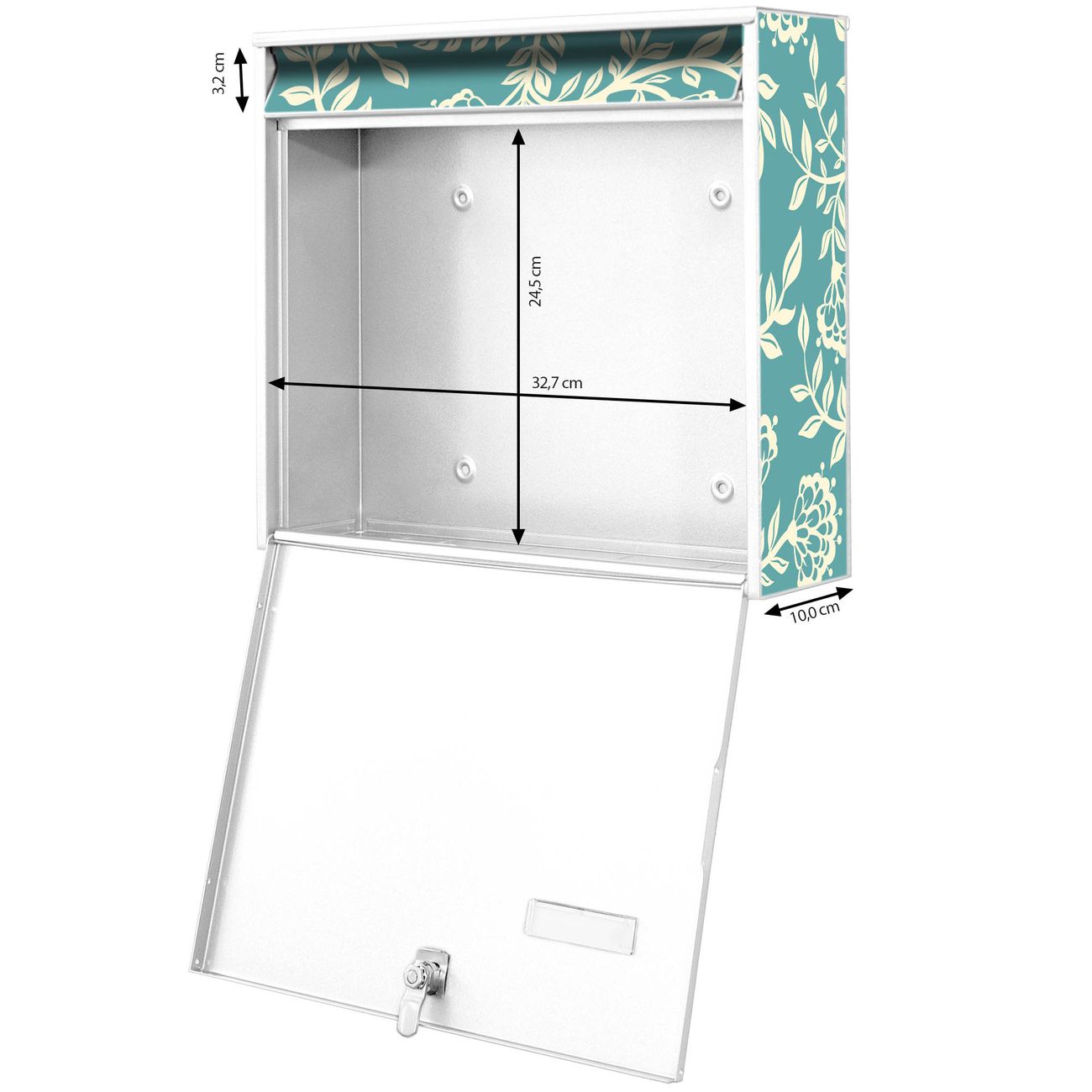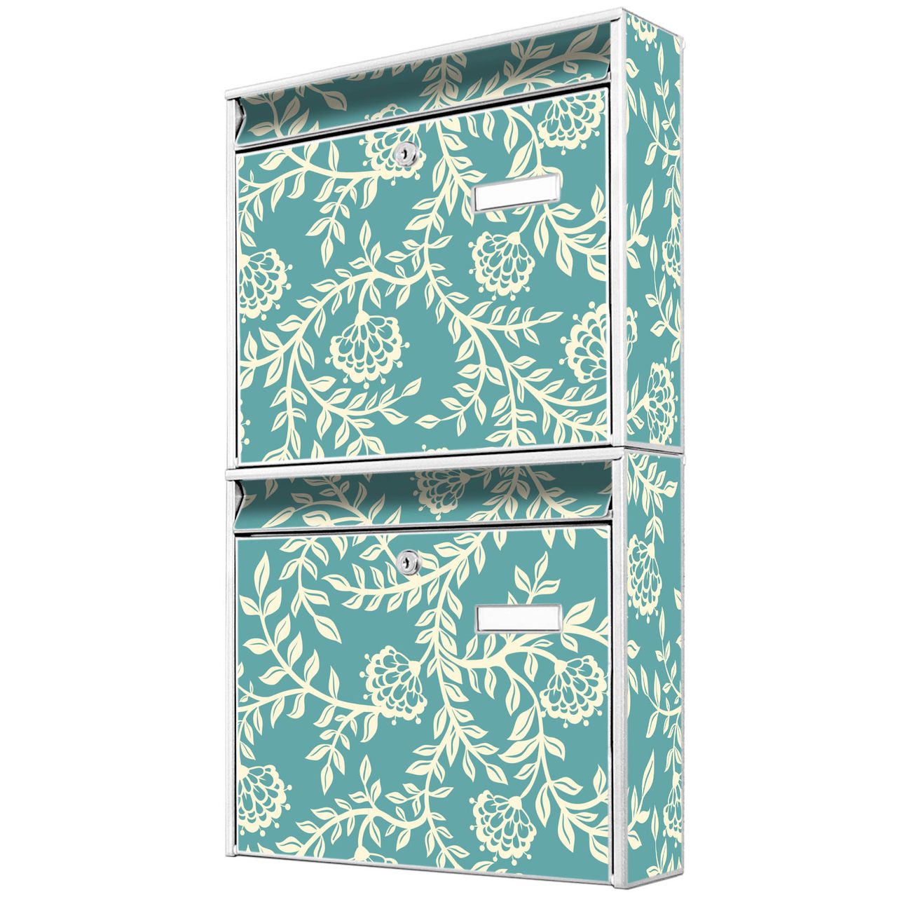 FUNKTION: Die Burg-Wächter Briefkastenanlage mit Motiv Rankenornament bietet Ihnen ausreichend Fassungsvermögen um auch A4 und C4 Sendungen zu empfangen. Das integrierte Namensschild lässt sich individuell beschriften. Wählen Sie aus den Grundfarben weiß, silber und schwarz. DESIGN: Die 2 Briefkästen haben ein ansprechendes und zeitloses Design, ohne dabei auf Funktionalität zu verzichten. Das Material ist sehr stabil, wetterfest und rostfrei. Durch das Motiv Rankenornament werden die Postkästen zu einem Blickfang. DETAILS: Die Postkästen bestehen aus verzinktem Stahl der zusätzlich mit Klarlack versiegelt wurde. Die Kästen sind gesamt 64,5cm hoch, 36,2cm breit und 10cm tief. Das Motiv besteht aus einer wetter- und UV-festen Folie, die Ihren Briefkasten zusätzlich vor Kratzern schützt. Die Postkästen werden mit Montagematerial, je einem Namensschild und je zwei Schlüsseln geliefert. NUTZEN: Das Briefkastenset eignet sich für die Wandmontage, die Größe bietet genügend Platz für Sendungen aller Art. Das zeitlose Design sowie die stabile Bauart bieten Ihnen einen treuen Begleiter für Ihre Post. BANJADO: