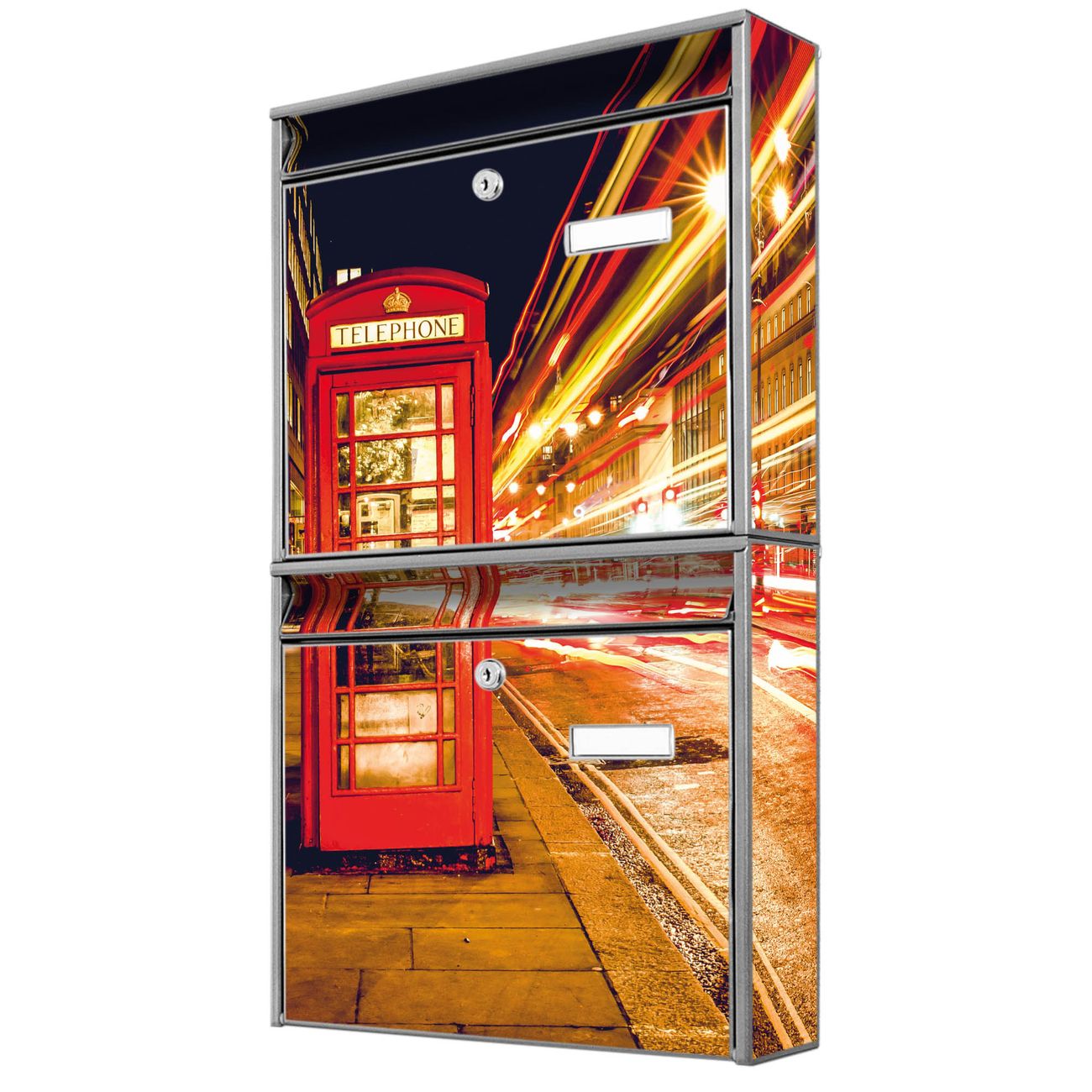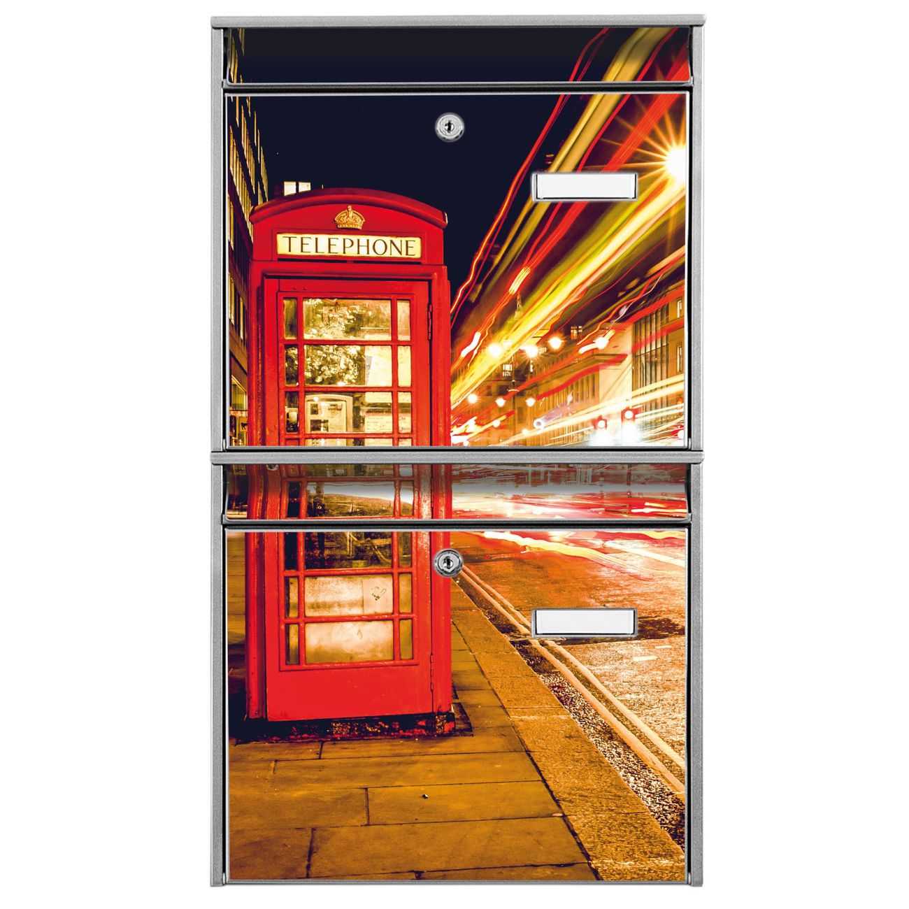 FUNKTION: Die Burg-Wächter Briefkastenanlage mit Motiv Red Telephone Trafic bietet Ihnen ausreichend Fassungsvermögen um auch A4 und C4 Sendungen zu empfangen. Das integrierte Namensschild lässt sich individuell beschriften. Wählen Sie aus den Grundfarben weiß, silber und schwarz. DESIGN: Die 2 Briefkästen haben ein ansprechendes und zeitloses Design, ohne dabei auf Funktionalität zu verzichten. Das Material ist sehr stabil, wetterfest und rostfrei. Durch das Motiv Red Telephone Trafic werden die Postkästen zu einem Blickfang. DETAILS: Die Postkästen bestehen aus verzinktem Stahl der zusätzlich mit Klarlack versiegelt wurde. Die Kästen sind gesamt 64,5cm hoch, 36,2cm breit und 10cm tief. Das Motiv besteht aus einer wetter- und UV-festen Folie, die Ihren Briefkasten zusätzlich vor Kratzern schützt. Die Postkästen werden mit Montagematerial, je einem Namensschild und je zwei Schlüsseln geliefert. NUTZEN: Das Briefkastenset eignet sich für die Wandmontage, die Größe bietet genügend Platz für Sendungen aller Art. Das zeitlose Design sowie die stabile Bauart bieten Ihnen einen treuen Begleiter für Ihre Post. BANJADO: