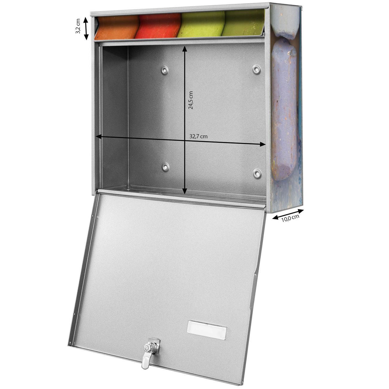 FUNKTION: Die Burg-Wächter Briefkastenanlage mit Motiv Regenbogenkreide bietet Ihnen ausreichend Fassungsvermögen um auch A4 und C4 Sendungen zu empfangen. Das integrierte Namensschild lässt sich individuell beschriften. Wählen Sie aus den Grundfarben weiß, silber und schwarz. DESIGN: Die 2 Briefkästen haben ein ansprechendes und zeitloses Design, ohne dabei auf Funktionalität zu verzichten. Das Material ist sehr stabil, wetterfest und rostfrei. Durch das Motiv Regenbogenkreide werden die Postkästen zu einem Blickfang. DETAILS: Die Postkästen bestehen aus verzinktem Stahl der zusätzlich mit Klarlack versiegelt wurde. Die Kästen sind gesamt 64,5cm hoch, 36,2cm breit und 10cm tief. Das Motiv besteht aus einer wetter- und UV-festen Folie, die Ihren Briefkasten zusätzlich vor Kratzern schützt. Die Postkästen werden mit Montagematerial, je einem Namensschild und je zwei Schlüsseln geliefert. NUTZEN: Das Briefkastenset eignet sich für die Wandmontage, die Größe bietet genügend Platz für Sendungen aller Art. Das zeitlose Design sowie die stabile Bauart bieten Ihnen einen treuen Begleiter für Ihre Post. BANJADO: