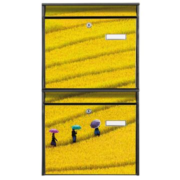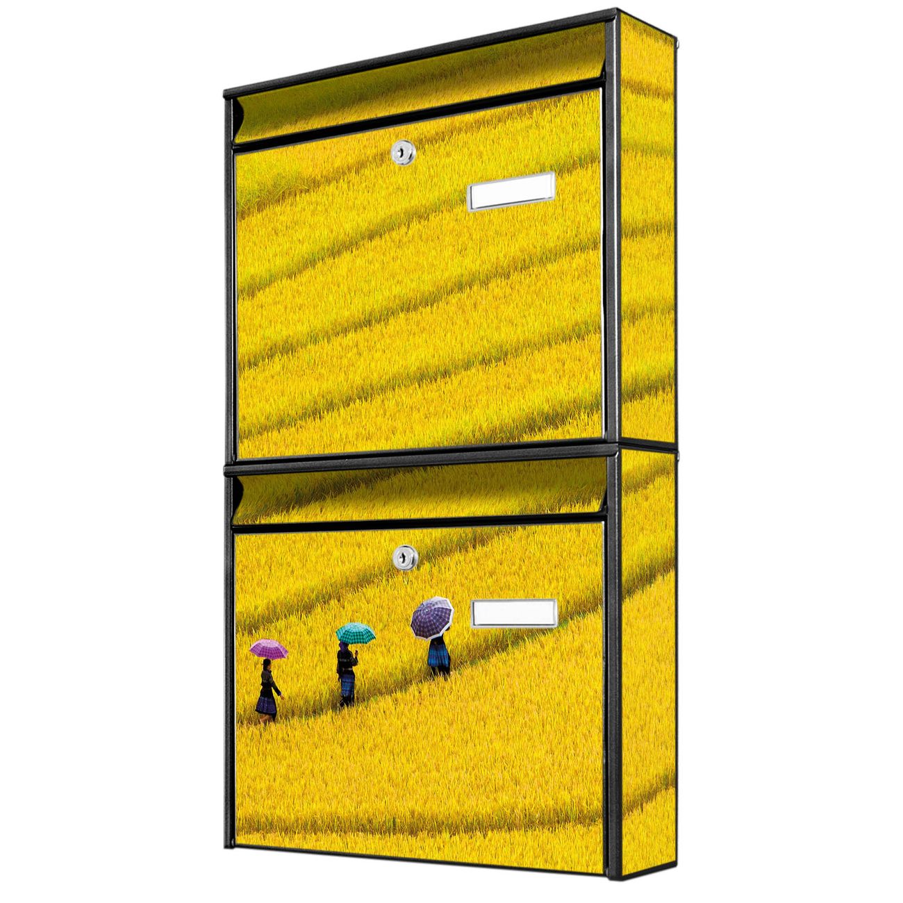 FUNKTION: Die Burg-Wächter Briefkastenanlage mit Motiv Reisfeld Vietnam bietet Ihnen ausreichend Fassungsvermögen um auch A4 und C4 Sendungen zu empfangen. Das integrierte Namensschild lässt sich individuell beschriften. Wählen Sie aus den Grundfarben weiß, silber und schwarz. DESIGN: Die 2 Briefkästen haben ein ansprechendes und zeitloses Design, ohne dabei auf Funktionalität zu verzichten. Das Material ist sehr stabil, wetterfest und rostfrei. Durch das Motiv Reisfeld Vietnam werden die Postkästen zu einem Blickfang. DETAILS: Die Postkästen bestehen aus verzinktem Stahl der zusätzlich mit Klarlack versiegelt wurde. Die Kästen sind gesamt 64,5cm hoch, 36,2cm breit und 10cm tief. Das Motiv besteht aus einer wetter- und UV-festen Folie, die Ihren Briefkasten zusätzlich vor Kratzern schützt. Die Postkästen werden mit Montagematerial, je einem Namensschild und je zwei Schlüsseln geliefert. NUTZEN: Das Briefkastenset eignet sich für die Wandmontage, die Größe bietet genügend Platz für Sendungen aller Art. Das zeitlose Design sowie die stabile Bauart bieten Ihnen einen treuen Begleiter für Ihre Post. BANJADO: