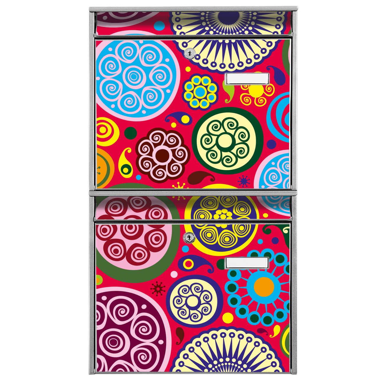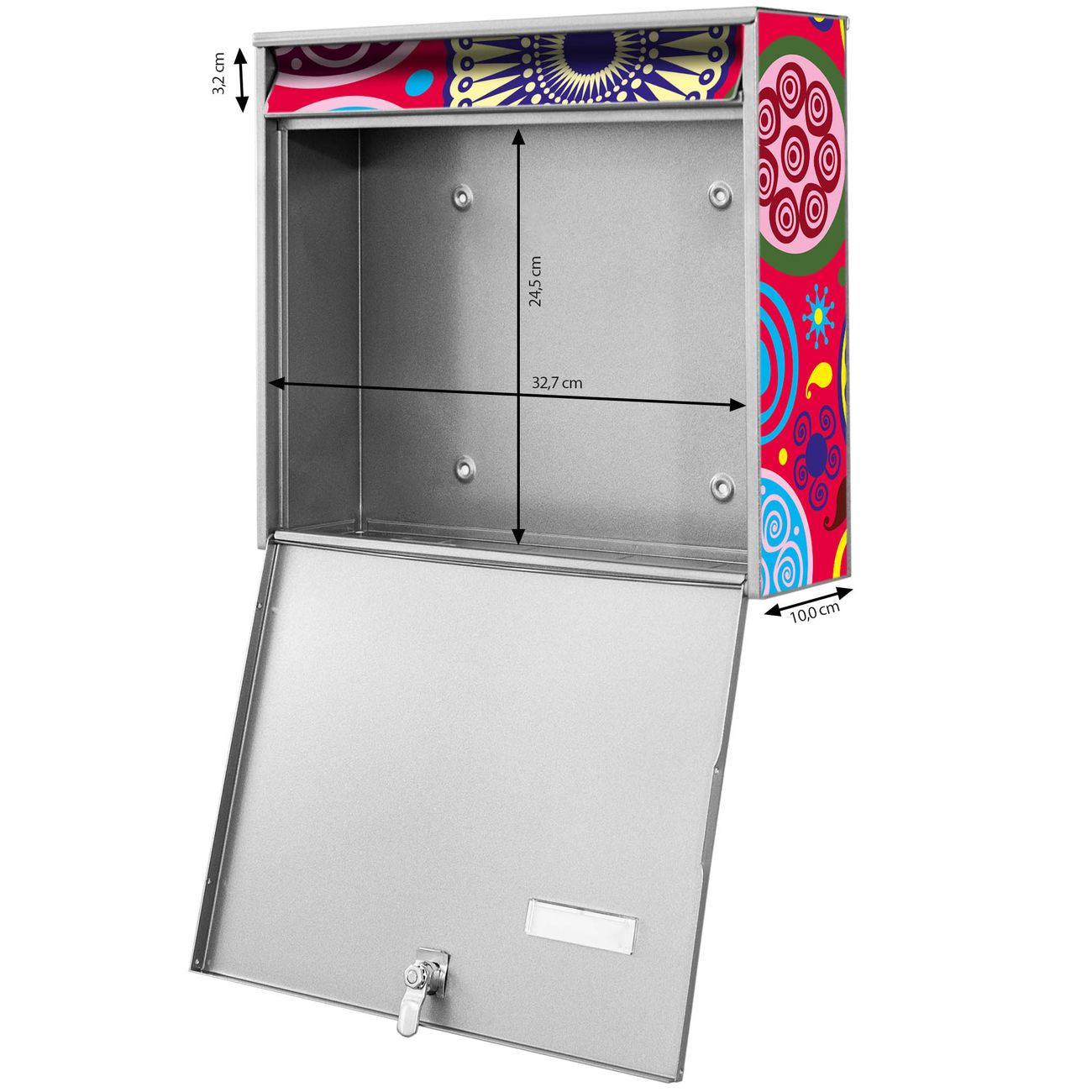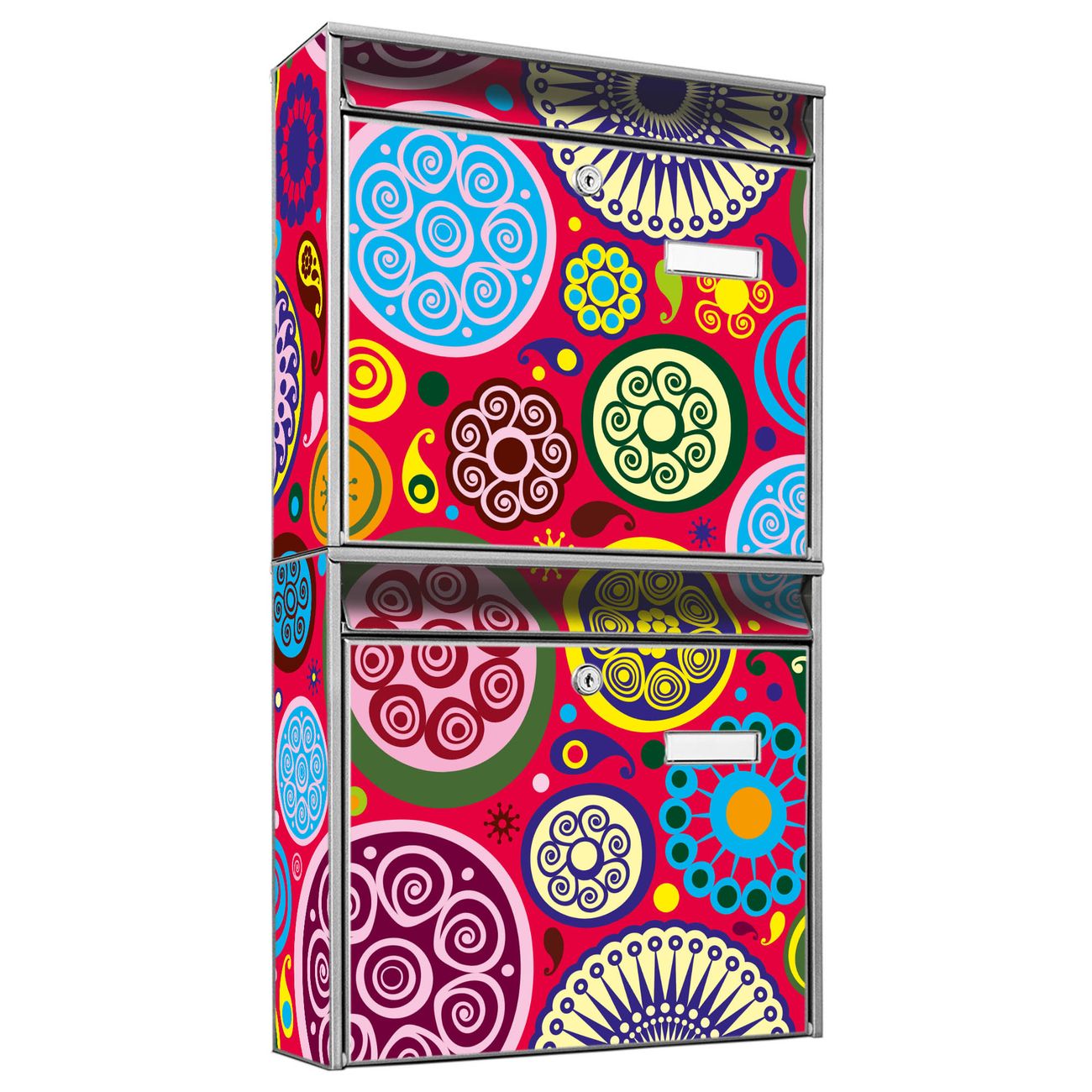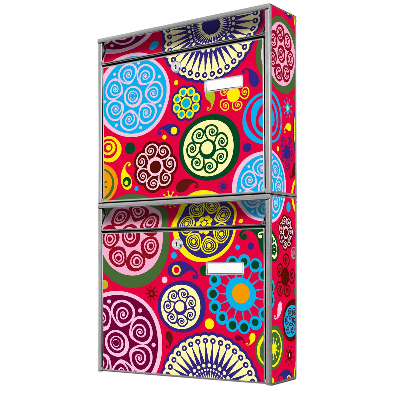 FUNKTION: Die Burg-Wächter Briefkastenanlage mit Motiv Retro Kreise bietet Ihnen ausreichend Fassungsvermögen um auch A4 und C4 Sendungen zu empfangen. Das integrierte Namensschild lässt sich individuell beschriften. Wählen Sie aus den Grundfarben weiß, silber und schwarz. DESIGN: Die 2 Briefkästen haben ein ansprechendes und zeitloses Design, ohne dabei auf Funktionalität zu verzichten. Das Material ist sehr stabil, wetterfest und rostfrei. Durch das Motiv Retro Kreise werden die Postkästen zu einem Blickfang. DETAILS: Die Postkästen bestehen aus verzinktem Stahl der zusätzlich mit Klarlack versiegelt wurde. Die Kästen sind gesamt 64,5cm hoch, 36,2cm breit und 10cm tief. Das Motiv besteht aus einer wetter- und UV-festen Folie, die Ihren Briefkasten zusätzlich vor Kratzern schützt. Die Postkästen werden mit Montagematerial, je einem Namensschild und je zwei Schlüsseln geliefert. NUTZEN: Das Briefkastenset eignet sich für die Wandmontage, die Größe bietet genügend Platz für Sendungen aller Art. Das zeitlose Design sowie die stabile Bauart bieten Ihnen einen treuen Begleiter für Ihre Post. BANJADO:
