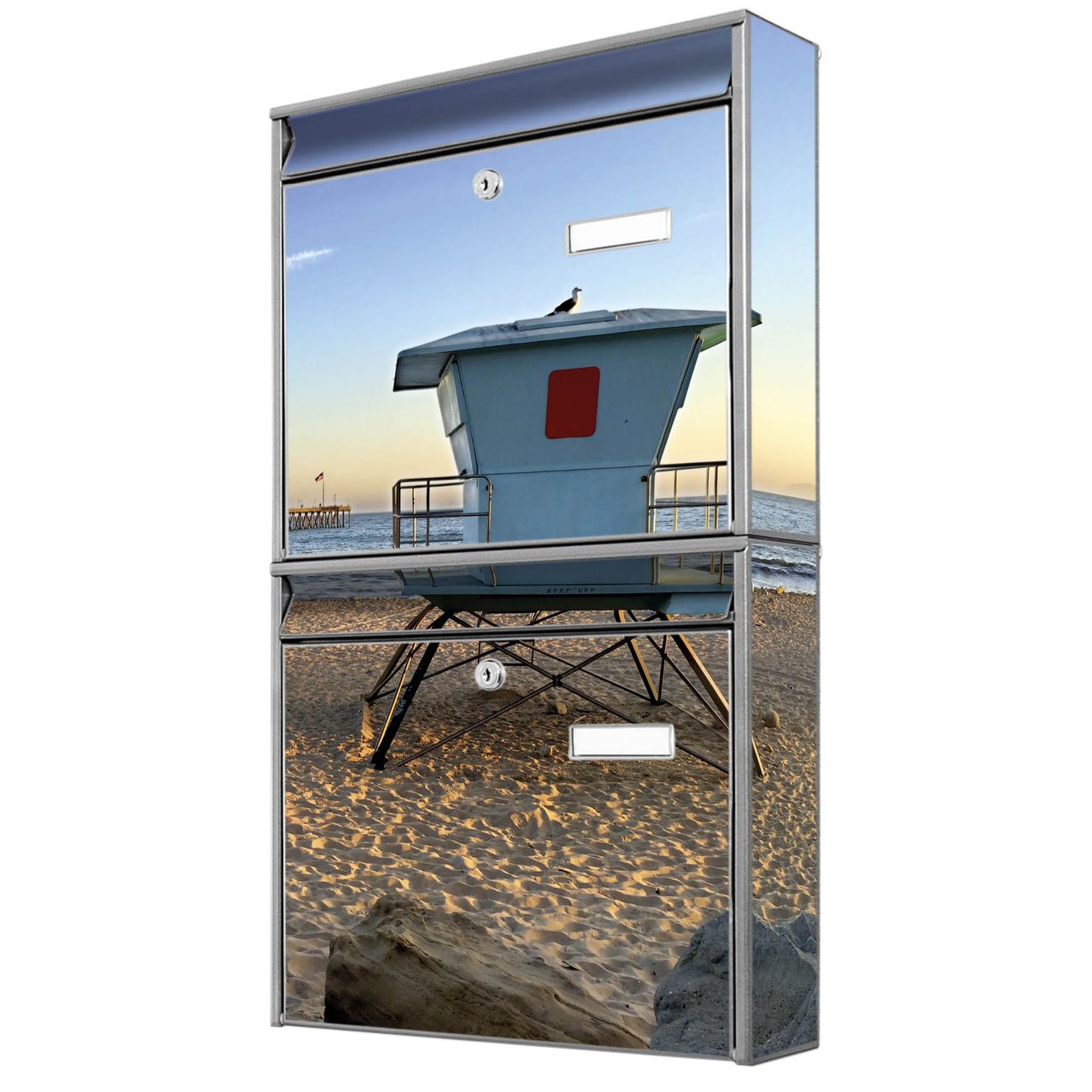FUNKTION: Die Burg-Wächter Briefkastenanlage mit Motiv Rettungsturm bietet Ihnen ausreichend Fassungsvermögen um auch A4 und C4 Sendungen zu empfangen. Das integrierte Namensschild lässt sich individuell beschriften. Wählen Sie aus den Grundfarben weiß, silber und schwarz. DESIGN: Die 2 Briefkästen haben ein ansprechendes und zeitloses Design, ohne dabei auf Funktionalität zu verzichten. Das Material ist sehr stabil, wetterfest und rostfrei. Durch das Motiv Rettungsturm werden die Postkästen zu einem Blickfang. DETAILS: Die Postkästen bestehen aus verzinktem Stahl der zusätzlich mit Klarlack versiegelt wurde. Die Kästen sind gesamt 64,5cm hoch, 36,2cm breit und 10cm tief. Das Motiv besteht aus einer wetter- und UV-festen Folie, die Ihren Briefkasten zusätzlich vor Kratzern schützt. Die Postkästen werden mit Montagematerial, je einem Namensschild und je zwei Schlüsseln geliefert. NUTZEN: Das Briefkastenset eignet sich für die Wandmontage, die Größe bietet genügend Platz für Sendungen aller Art. Das zeitlose Design sowie die stabile Bauart bieten Ihnen einen treuen Begleiter für Ihre Post. BANJADO: