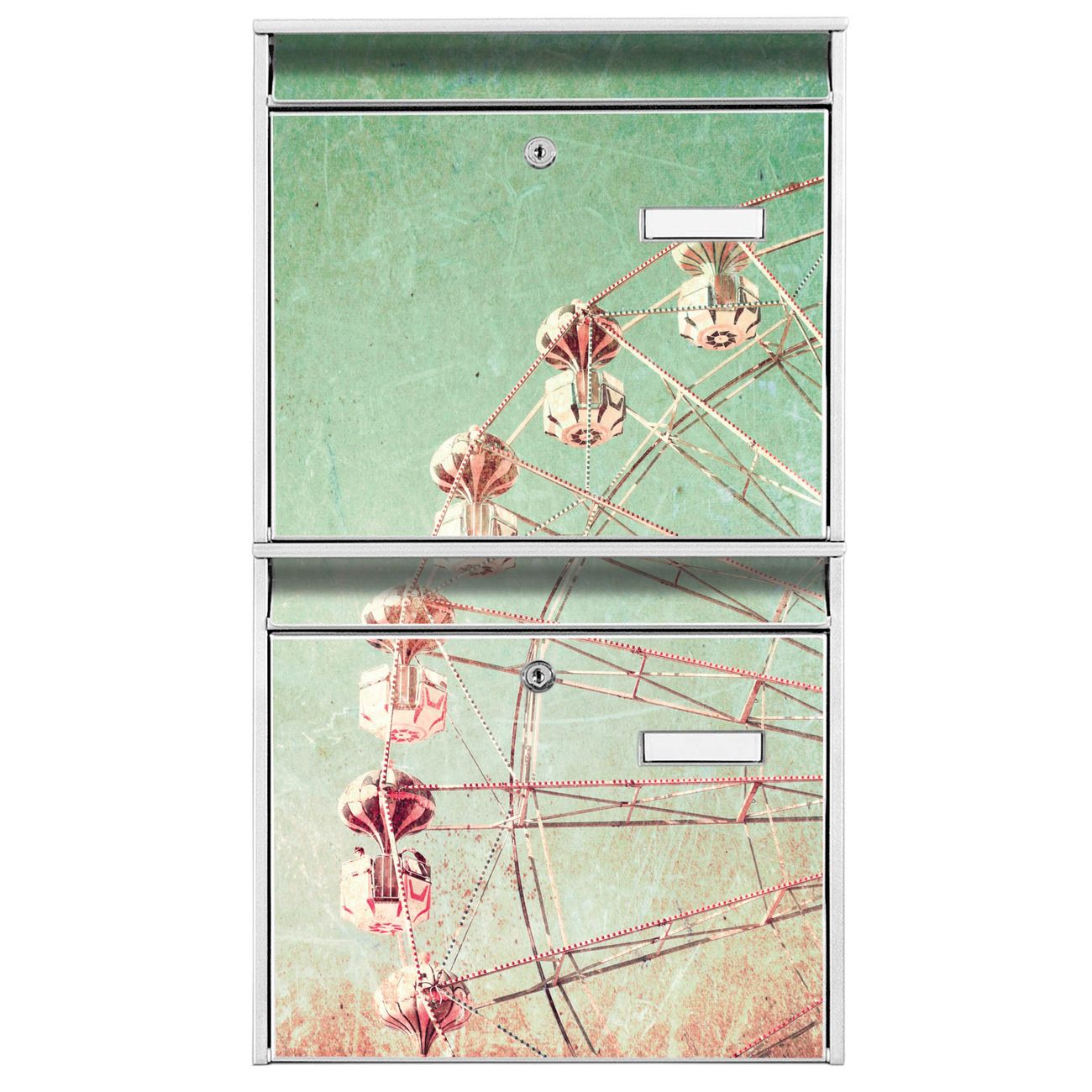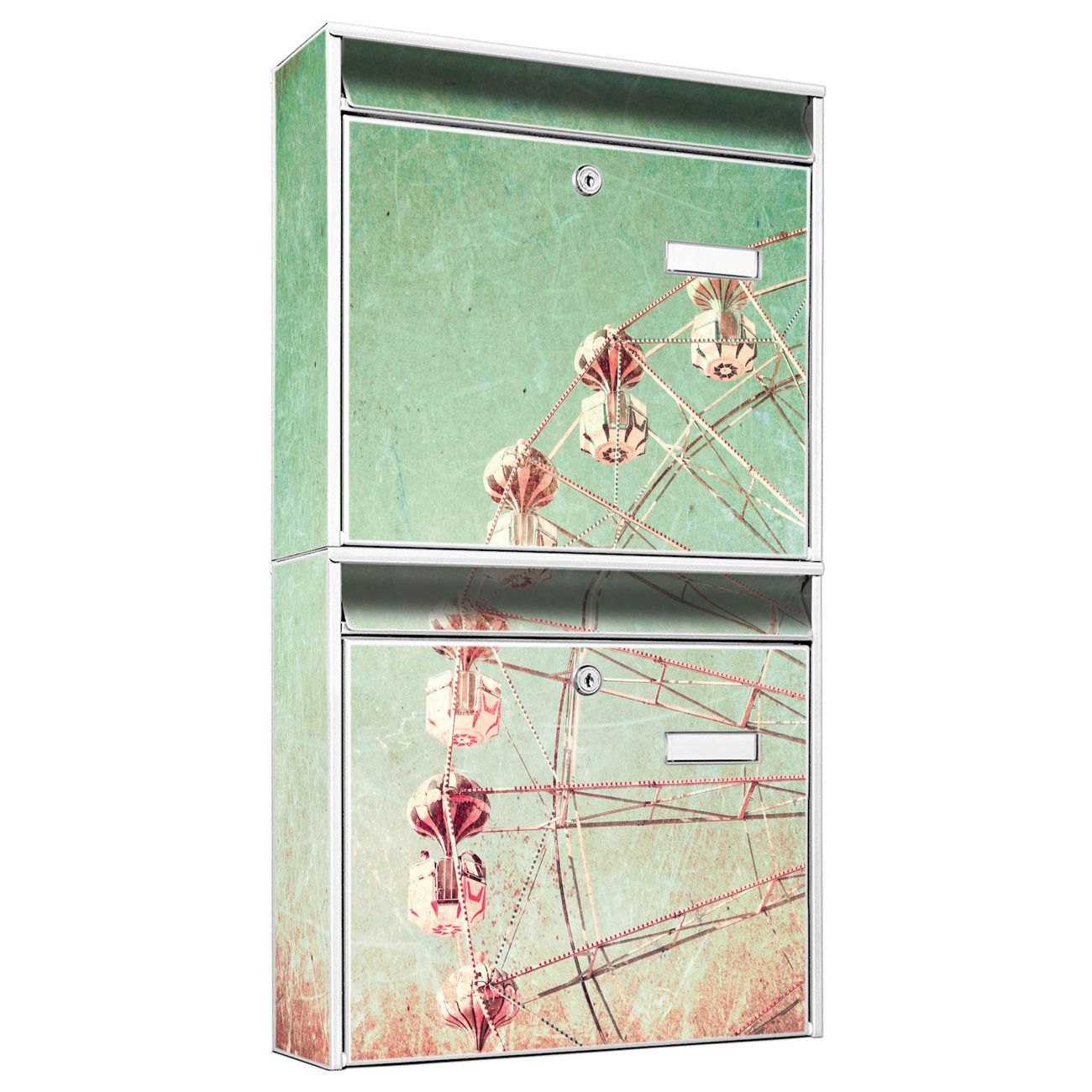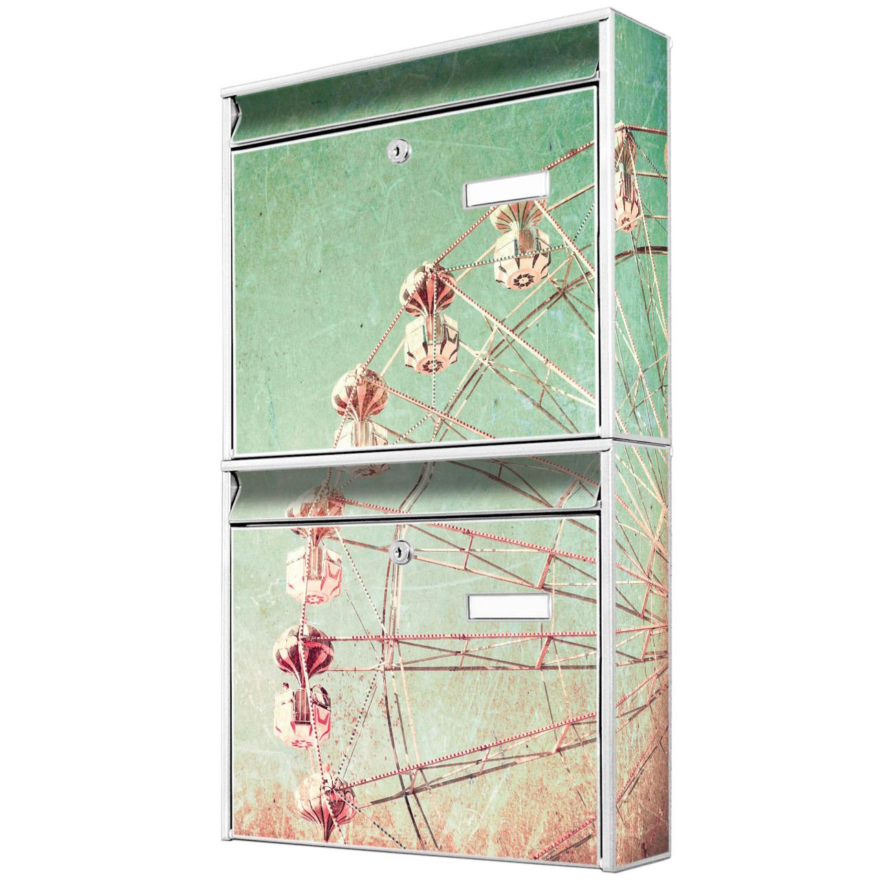FUNKTION: Die Burg-Wächter Briefkastenanlage mit Motiv Riesenrad 1 bietet Ihnen ausreichend Fassungsvermögen um auch A4 und C4 Sendungen zu empfangen. Das integrierte Namensschild lässt sich individuell beschriften. Wählen Sie aus den Grundfarben weiß, silber und schwarz. DESIGN: Die 2 Briefkästen haben ein ansprechendes und zeitloses Design, ohne dabei auf Funktionalität zu verzichten. Das Material ist sehr stabil, wetterfest und rostfrei. Durch das Motiv Riesenrad 1 werden die Postkästen zu einem Blickfang. DETAILS: Die Postkästen bestehen aus verzinktem Stahl der zusätzlich mit Klarlack versiegelt wurde. Die Kästen sind gesamt 64,5cm hoch, 36,2cm breit und 10cm tief. Das Motiv besteht aus einer wetter- und UV-festen Folie, die Ihren Briefkasten zusätzlich vor Kratzern schützt. Die Postkästen werden mit Montagematerial, je einem Namensschild und je zwei Schlüsseln geliefert. NUTZEN: Das Briefkastenset eignet sich für die Wandmontage, die Größe bietet genügend Platz für Sendungen aller Art. Das zeitlose Design sowie die stabile Bauart bieten Ihnen einen treuen Begleiter für Ihre Post. BANJADO:
