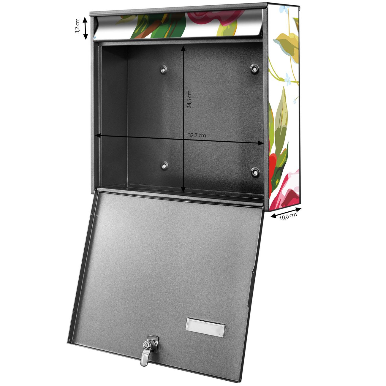 FUNKTION: Die Burg-Wächter Briefkastenanlage mit Motiv Rosen Rustikal bietet Ihnen ausreichend Fassungsvermögen um auch A4 und C4 Sendungen zu empfangen. Das integrierte Namensschild lässt sich individuell beschriften. Wählen Sie aus den Grundfarben weiß, silber und schwarz. DESIGN: Die 2 Briefkästen haben ein ansprechendes und zeitloses Design, ohne dabei auf Funktionalität zu verzichten. Das Material ist sehr stabil, wetterfest und rostfrei. Durch das Motiv Rosen Rustikal werden die Postkästen zu einem Blickfang. DETAILS: Die Postkästen bestehen aus verzinktem Stahl der zusätzlich mit Klarlack versiegelt wurde. Die Kästen sind gesamt 64,5cm hoch, 36,2cm breit und 10cm tief. Das Motiv besteht aus einer wetter- und UV-festen Folie, die Ihren Briefkasten zusätzlich vor Kratzern schützt. Die Postkästen werden mit Montagematerial, je einem Namensschild und je zwei Schlüsseln geliefert. NUTZEN: Das Briefkastenset eignet sich für die Wandmontage, die Größe bietet genügend Platz für Sendungen aller Art. Das zeitlose Design sowie die stabile Bauart bieten Ihnen einen treuen Begleiter für Ihre Post. BANJADO: